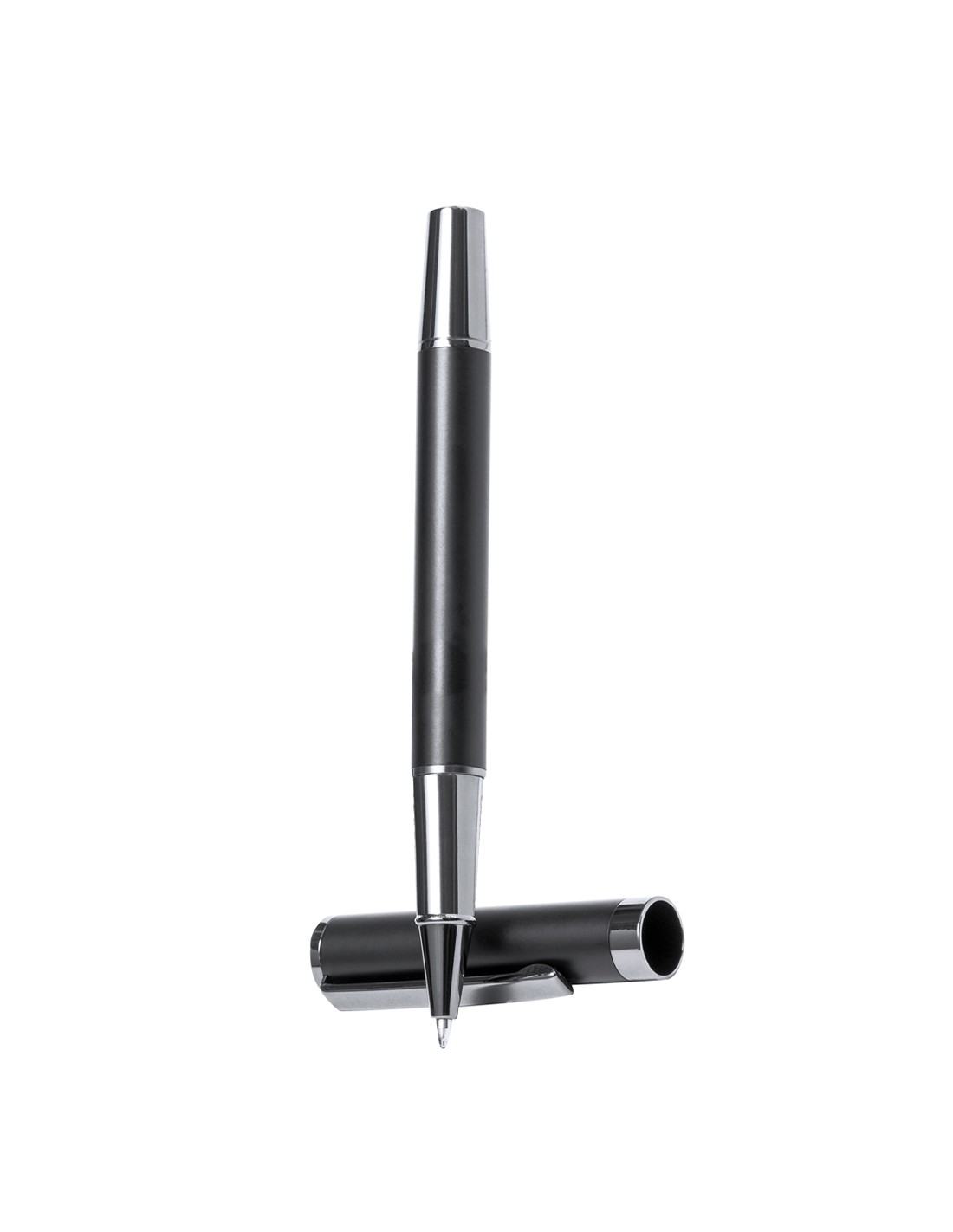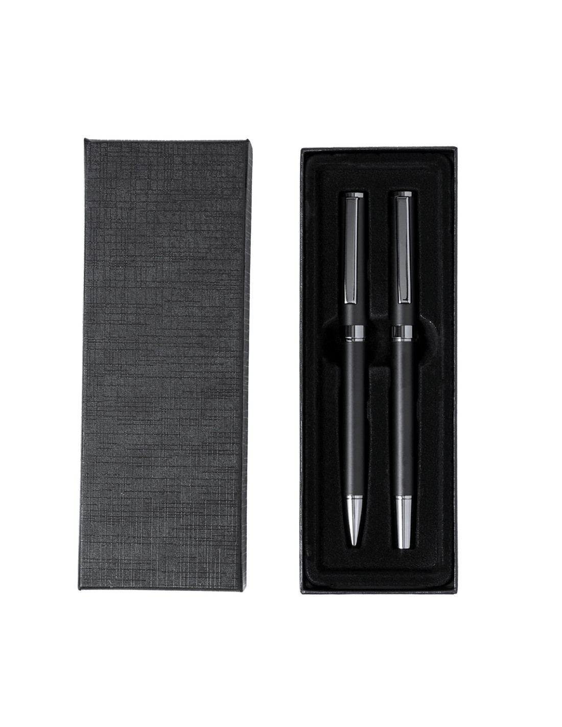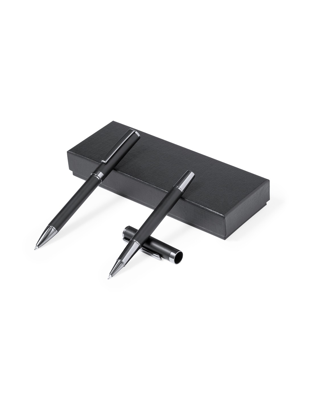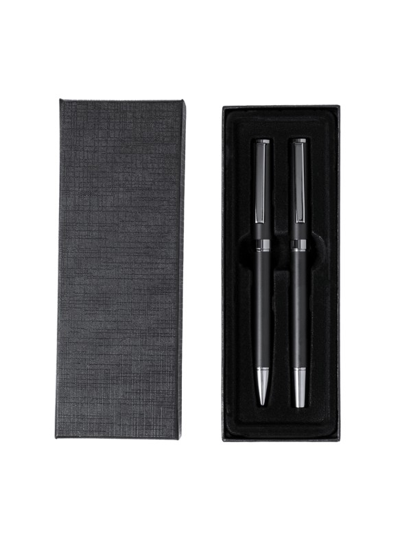 Elegante set de bolígrafo y roller. Bolígrafo de mecanismo giratorio y roller con capucha, ambos provistos de un clip metálico. Con tinta azul, su cuerpo presenta un elegante acabado negro mate y sutiles detalles cromados. Presentados en un estuche kraft negro, con interior troquelado en tacto de terciopelo.