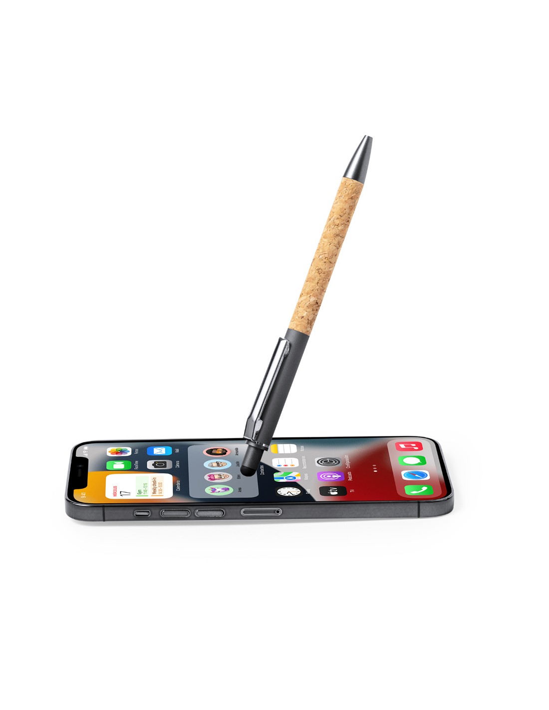Elegante bolígrafo puntero fabricado en de corcho y aluminio con mecanismo pulsador. Cuerpo en resistente aluminio de acabado mate y empuñadura en corcho con puntero negro en la parte superior en gris. Clip metálico, con pulsador retráctil y en tinta azul. Presentado en bolsa individual reciclada.Elaborado con elementos vegetales para así fomentar la utilización de materias primas naturales y reducir las emisiones contaminantes.