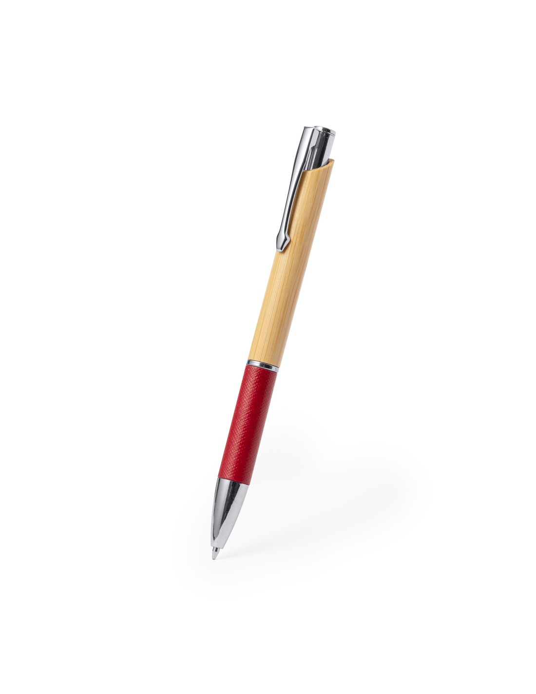 Bolígrafo con cuerpo en bambú y papel reciclado. Caña fabricada en suave bambú con empuñadura hecha en cartón reciclado con textura y en variados colores. Clip metálico y accesorios en cromado. De mecanismo pulsador, de cartucho jumbo y con tinta azul.Elaborado con elementos vegetales para así fomentar la utilización de materias primas naturales y reducir las emisiones contaminantes.
