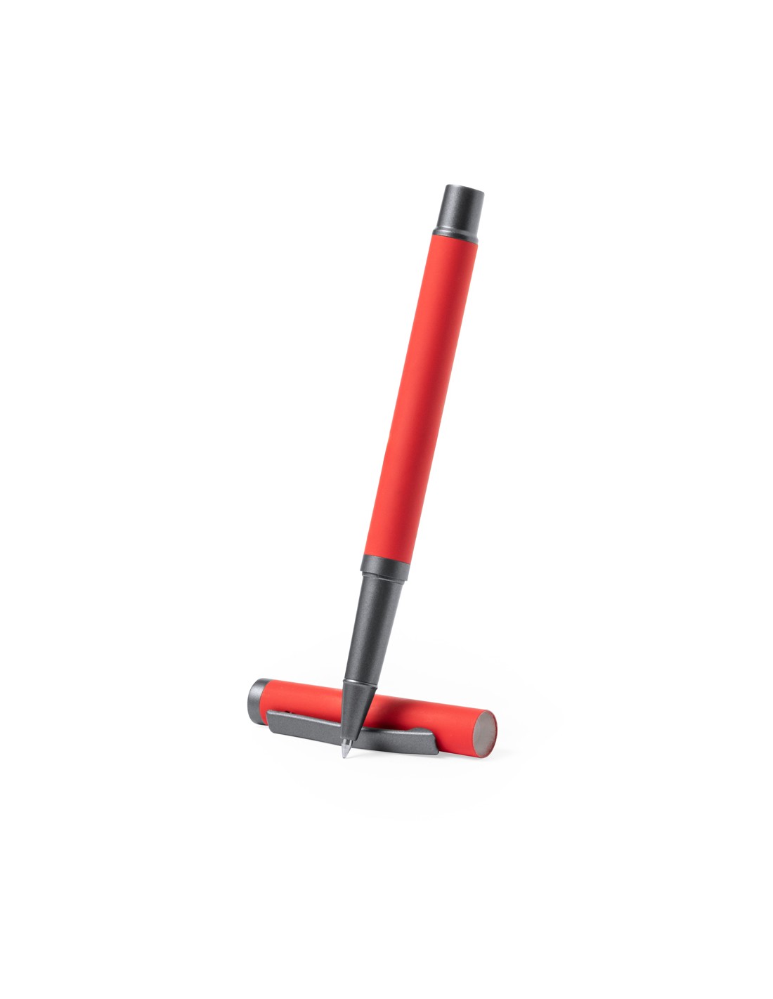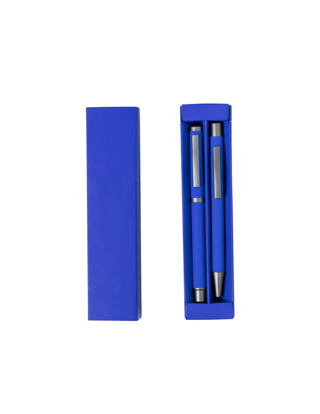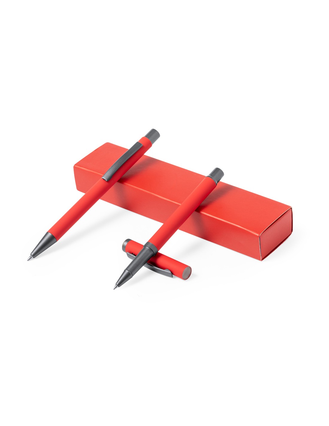 Elegante set de bolígrafo y roller. Bolígrafo de mecanismo pulsador y roller con capucha, ambos con clip metálico, carga jumbo y de tinta azul. Cuerpo en variados colores sólidos acabado goma y detalles metálicos en gris oscuro. Presentados en una caja de variados colores a juego con compartimentos interioriores separados.