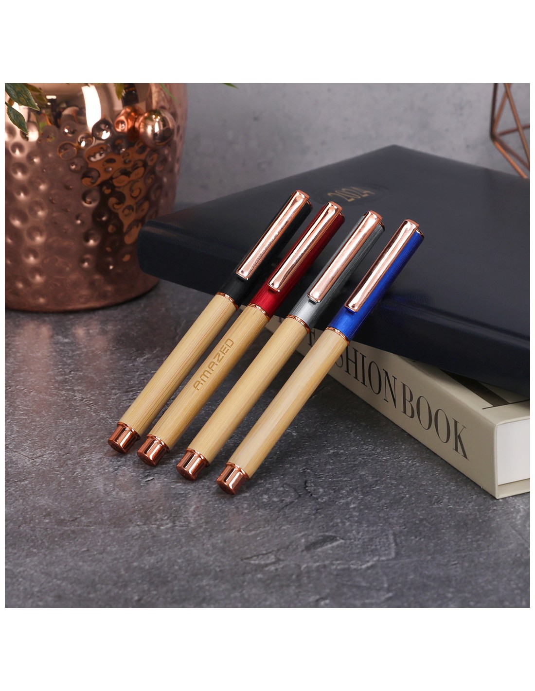 Elegante roller fabricado en bambú y aluminio. Con clip metálico, empuñadora y detalles de acabado oro rosa, caña fabricada en bambú y tapadera en aluminio. Con cartucho jumbo, en tinta azul y con cierre de capucha.