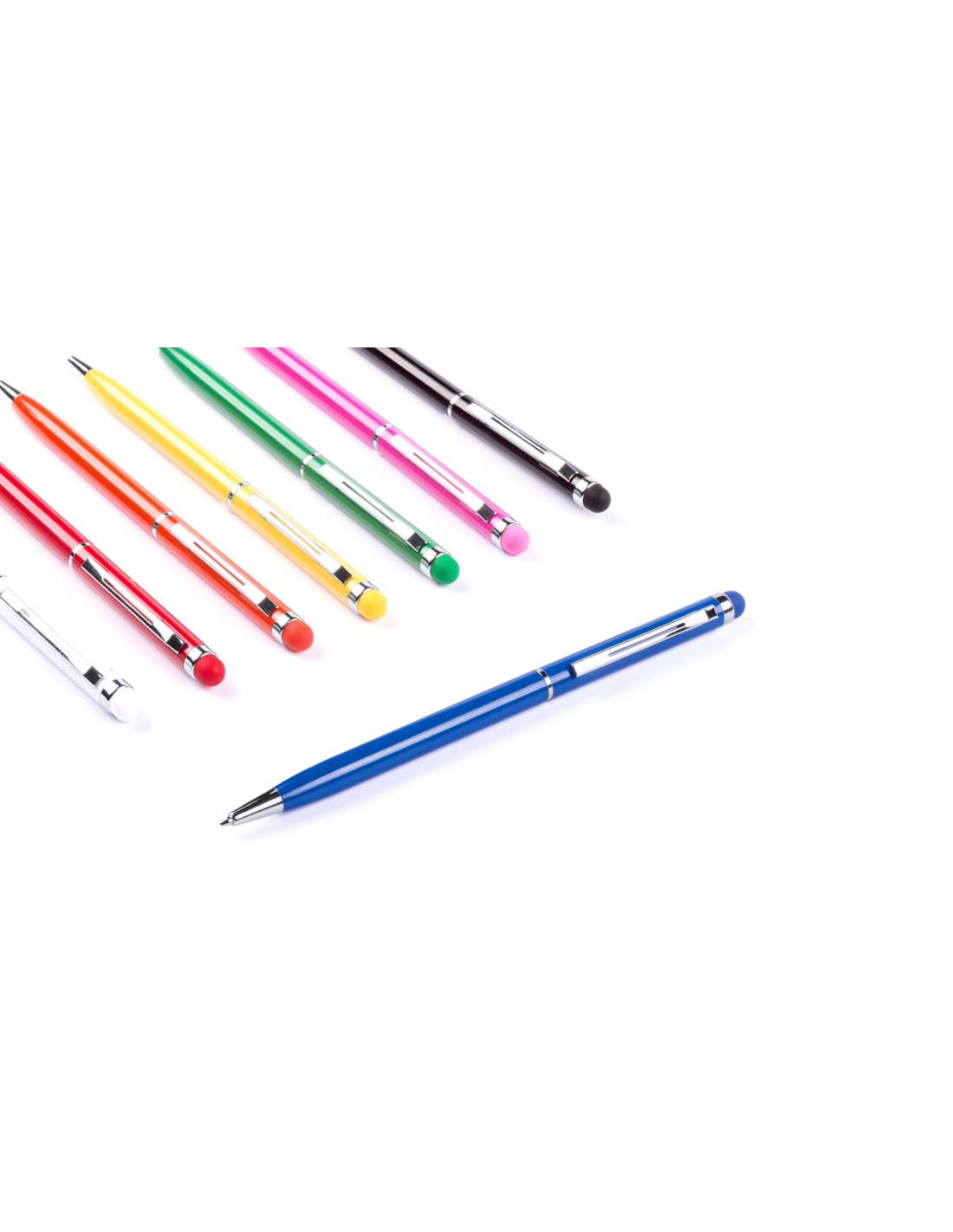 Bolígrafo puntero de mecanismo giratorio con cuerpo ultrafino en aluminio de suave acabado metalizado en variados colores y con puntero a juego. Accesorios y anillas en color plateado. Tinta azul.
