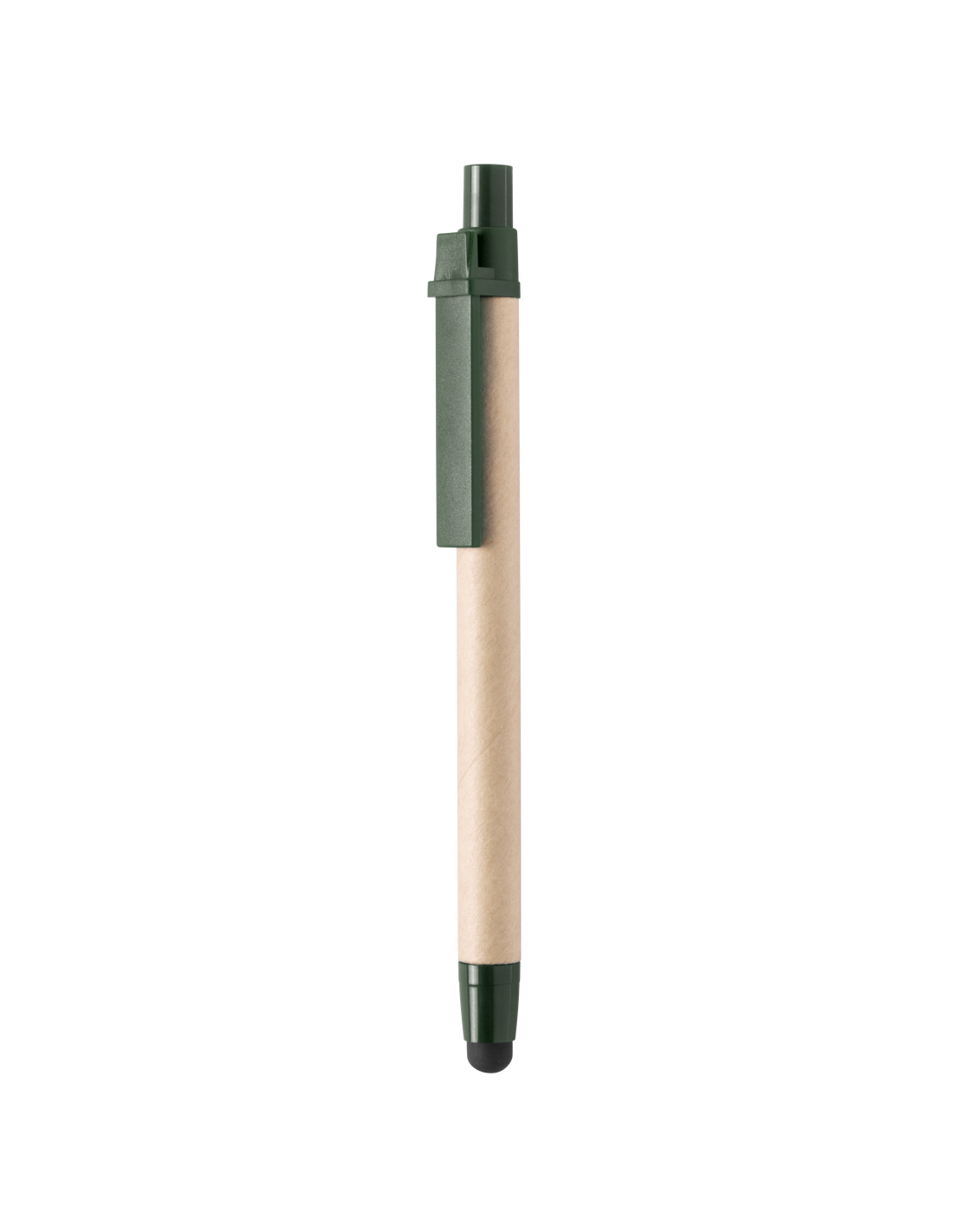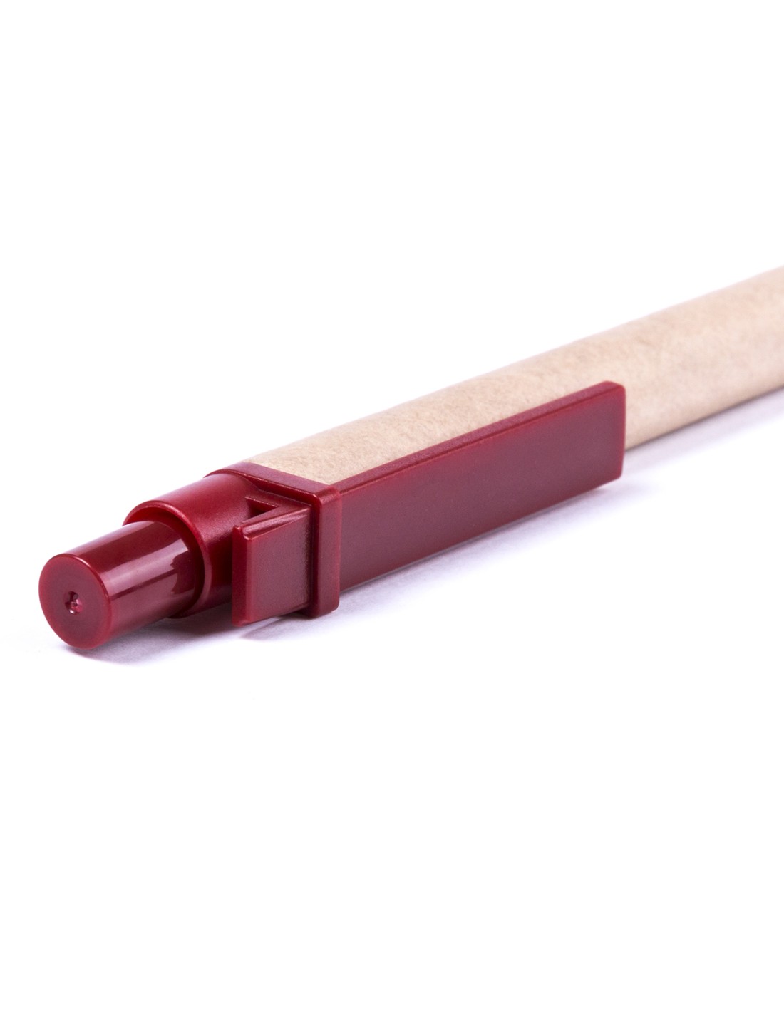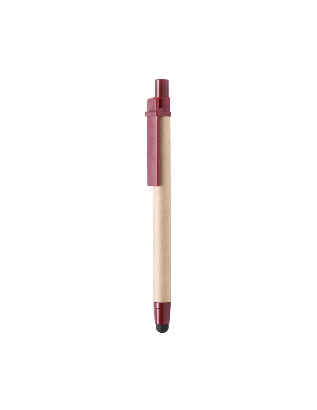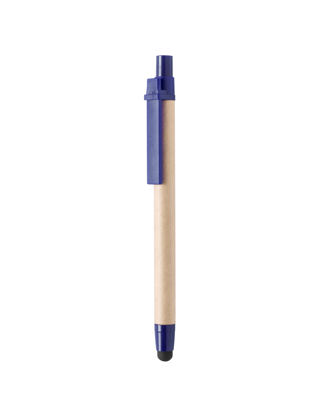 Bolígrafo puntero de mecanismo pulsador en original combinación de cuerpo en cartón reciclado de color natural y accesorios en vivos colores con puntero negro. Tinta azul.