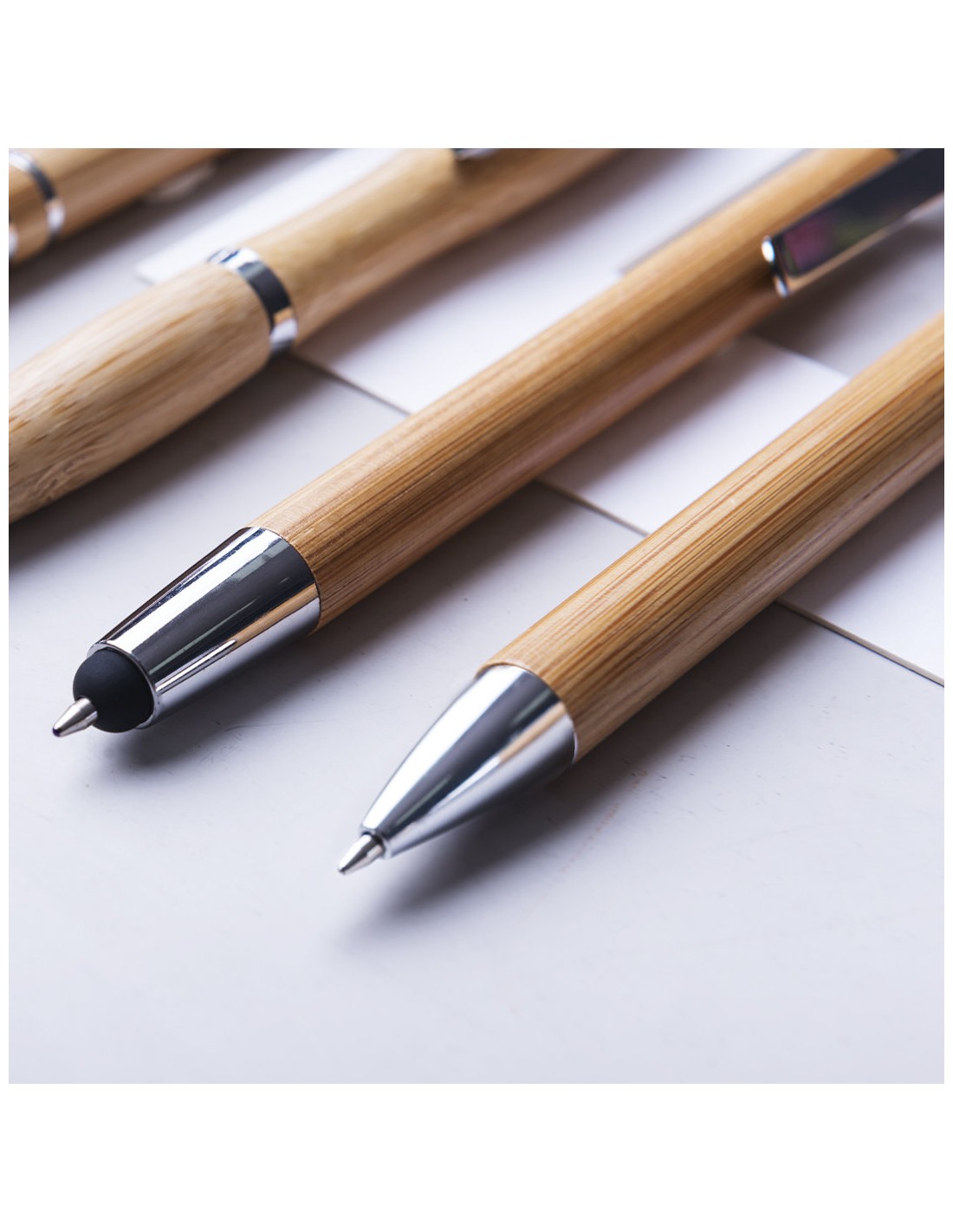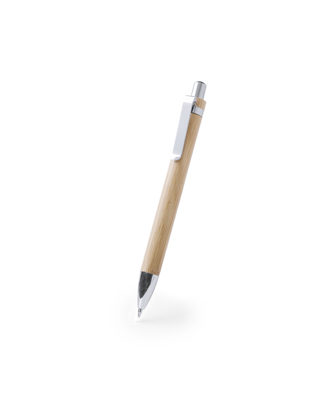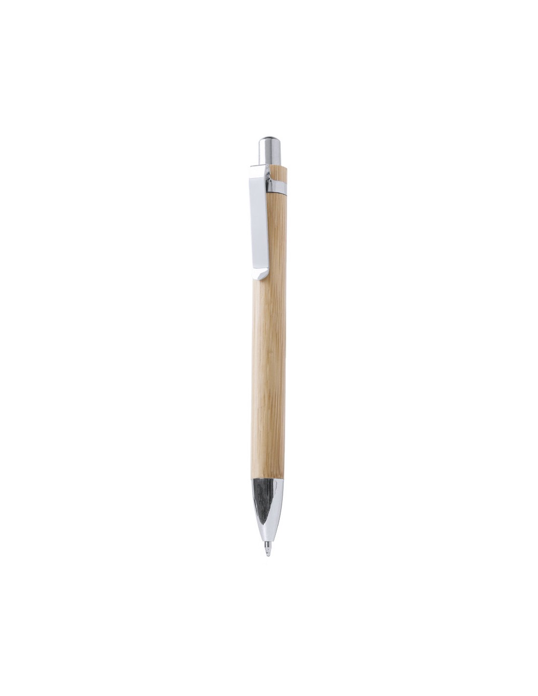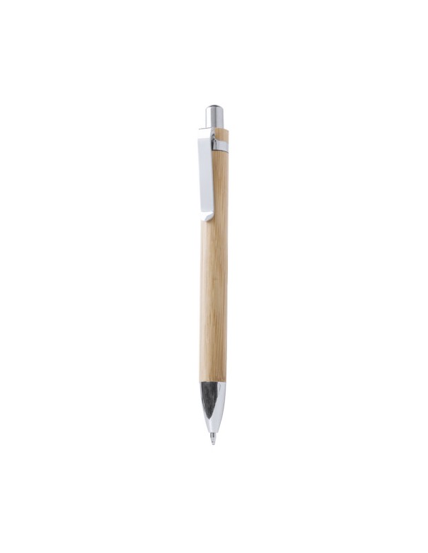 Elegante bolígrafo de mecanismo pulsador con cuerpo en madera de bambú natural y accesorios de acabado metálico en color plateado brillante. De cartucho jumbo y tinta azul.