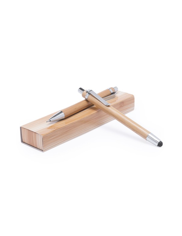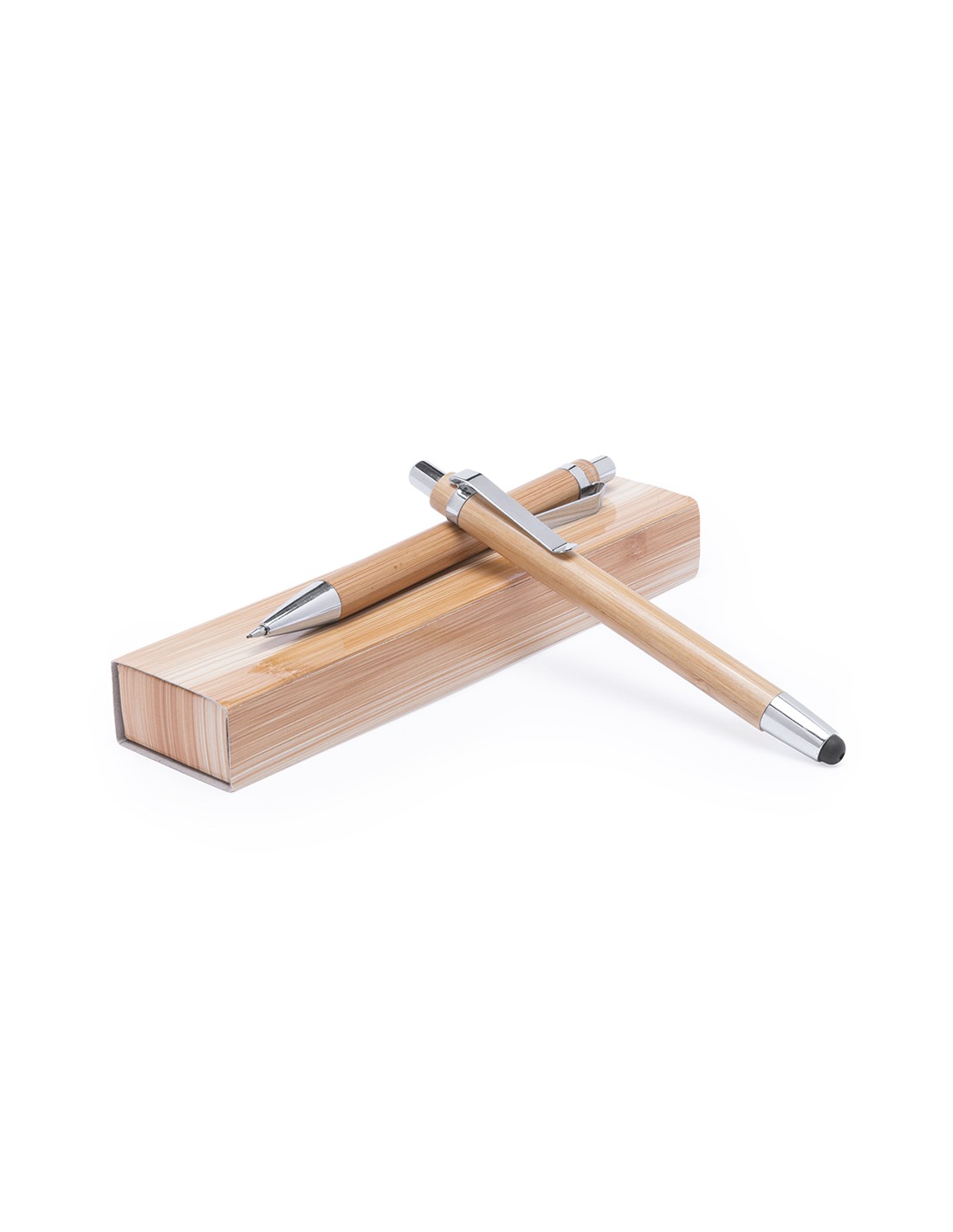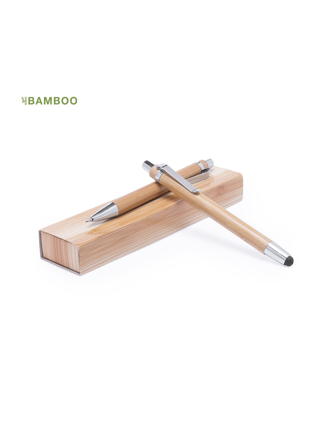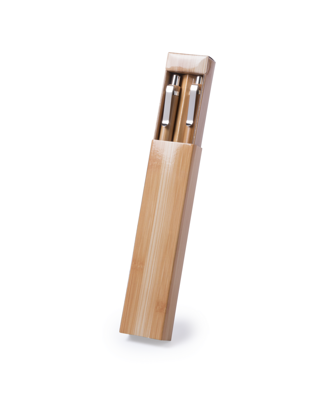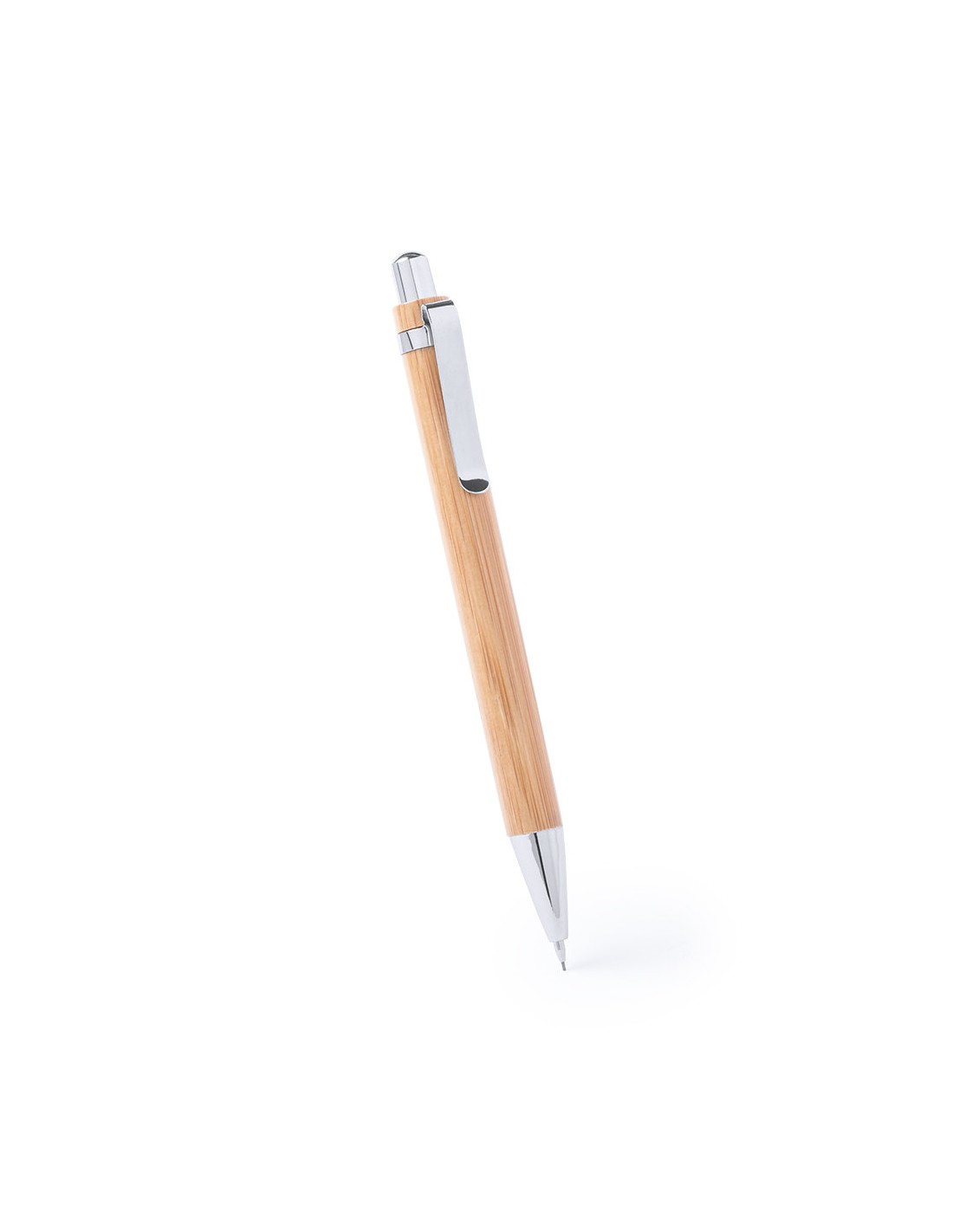 Set de bolígrafo de mecanismo pulsador y portaminas en original combinación de cuerpo en madera de bambú natural y accesorios de acabado metálico en color plateado brillante. Presentado en estuche individual troquelado de cartón brillante con acabado símil madera. Bolígrafo de cartucho jumbo con tinta azul y portaminas con minas de 0,7mm incluidas.