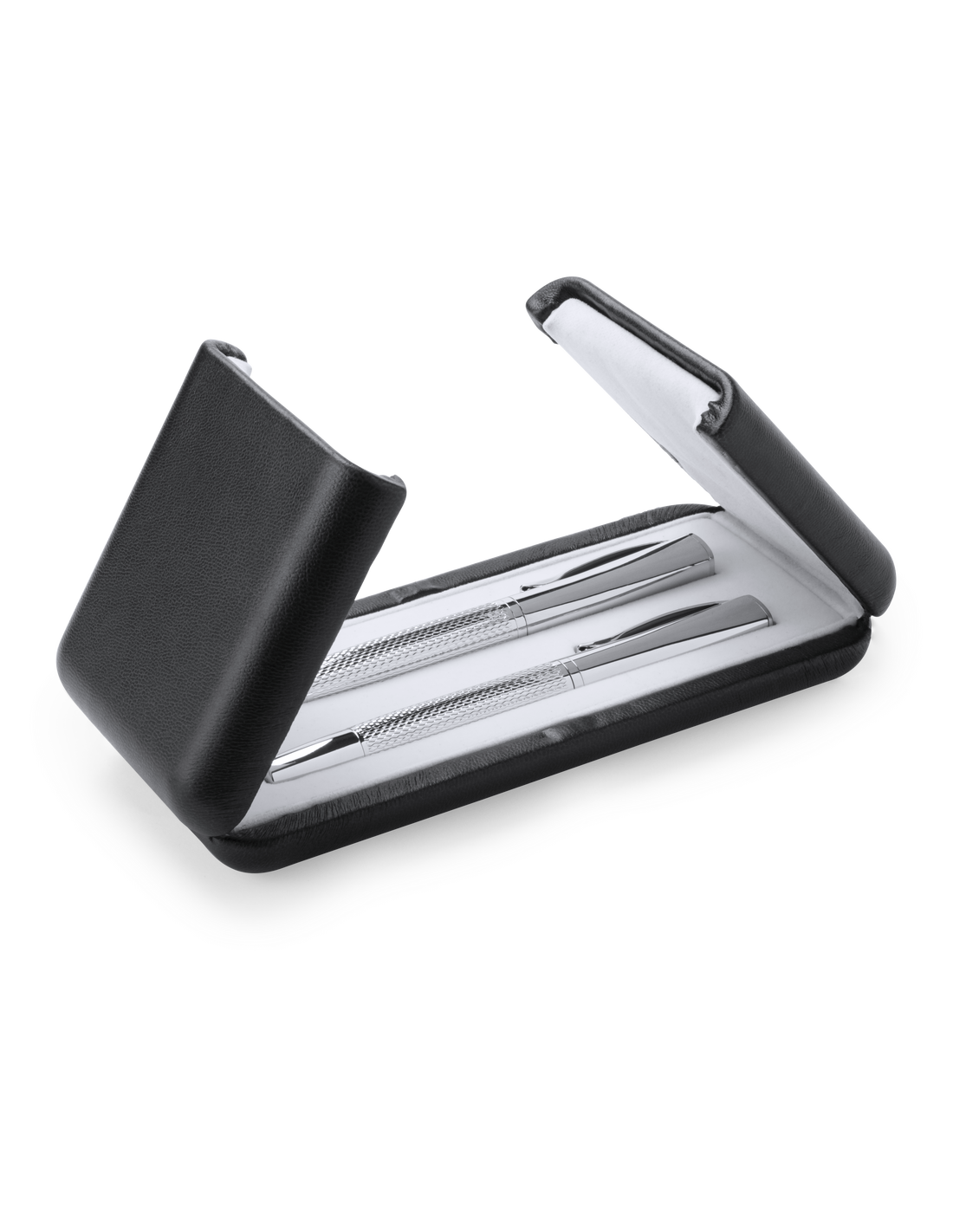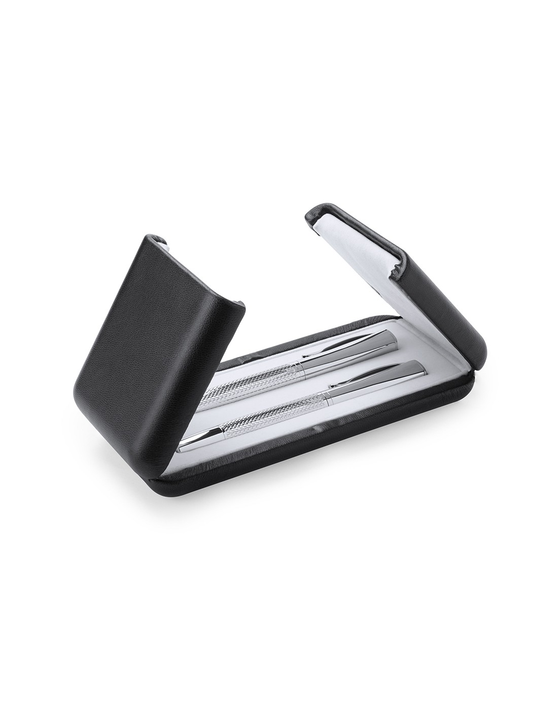 Elegante set de bolígrafo de mecanismo giratorio y roller de capucha en sobrio diseño. De cuerpo metálico antideslizante en acabado plateado brillante con clip a juego. Presentado en elegante y original estuche individual de polipiel en color negro con interior troquelado en suave antelina blanca. De cartucho jumbo con tinta azul de calidad alemana.