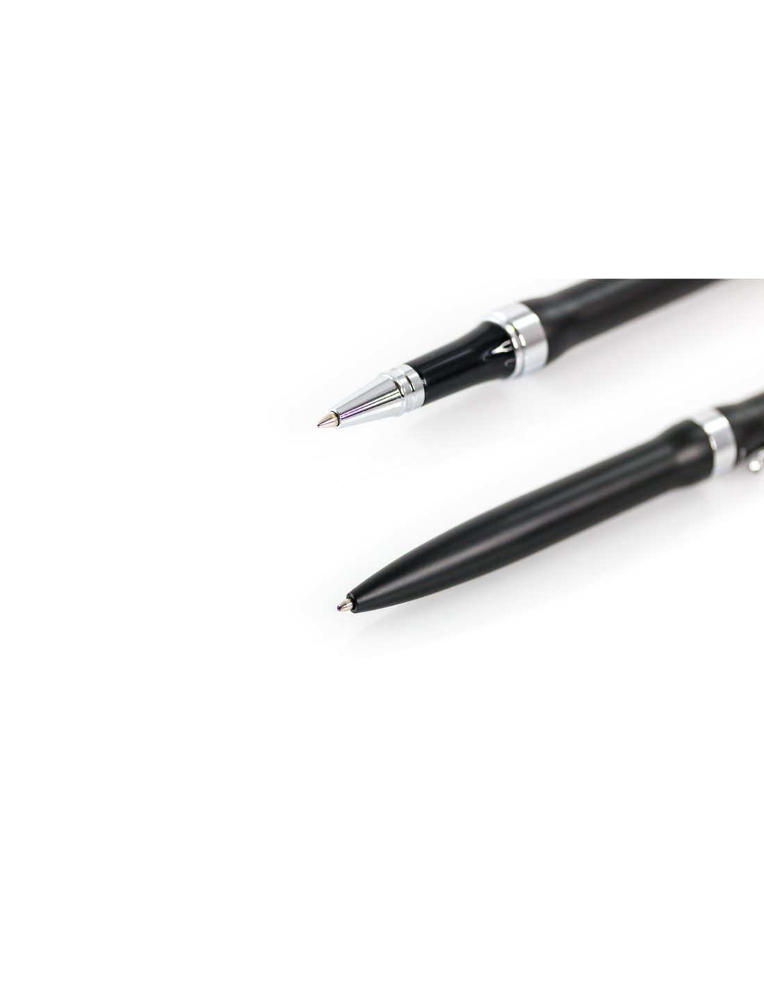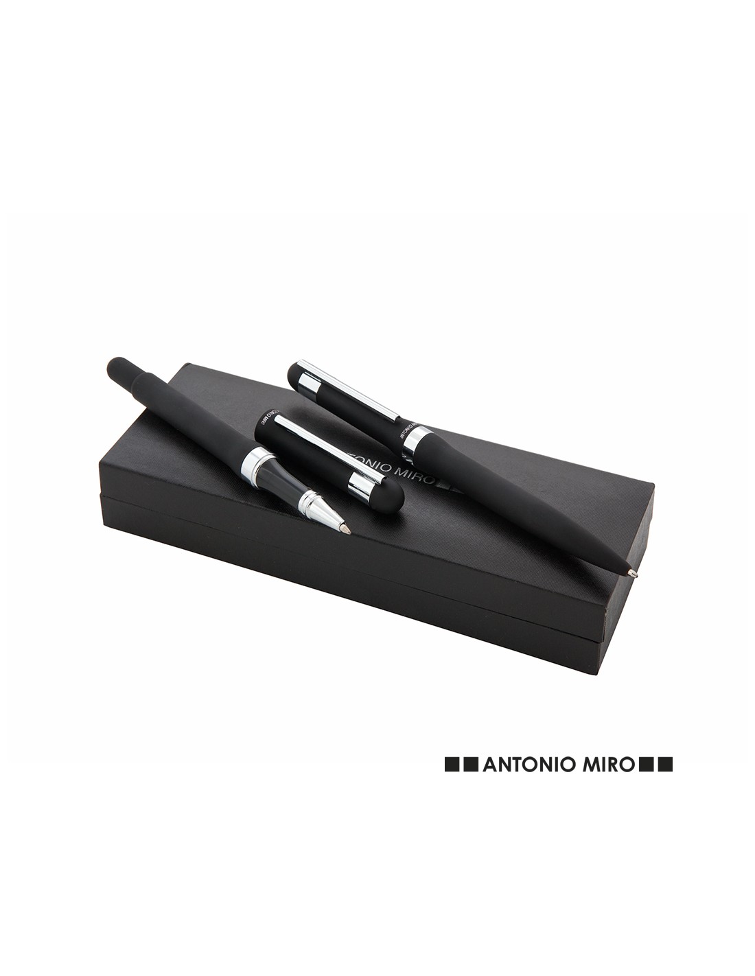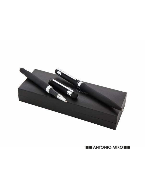 Elegante set de Antonio Miró con bolígrafo de mecanismo giratorio y roller de capucha y original anilla en sobrio diseño. De cuerpo metálico en acabado negro brillante con clip plateado. Presentado en elegante estuche individual en color negro con logotipo de la marca y funda. En tinta azul.