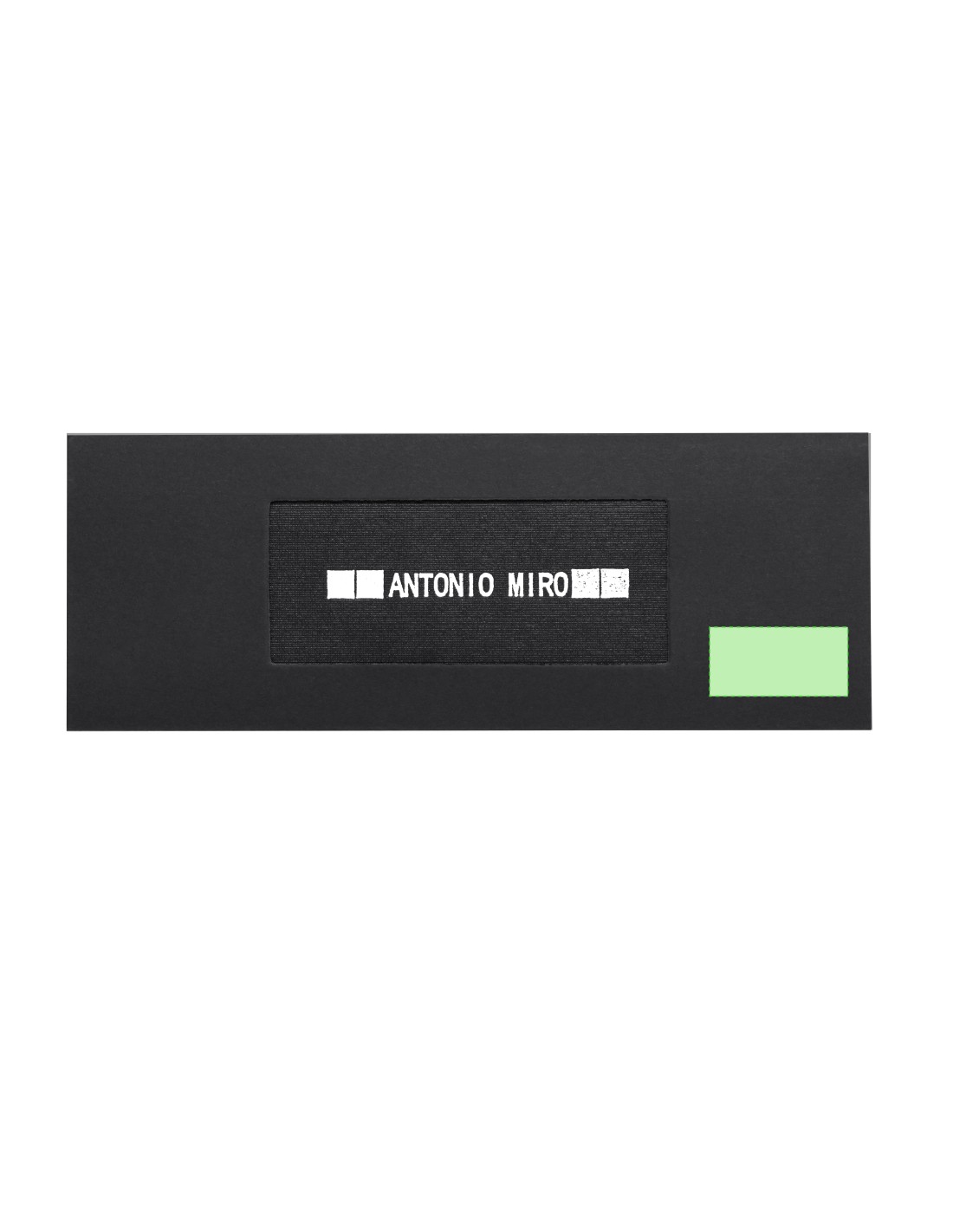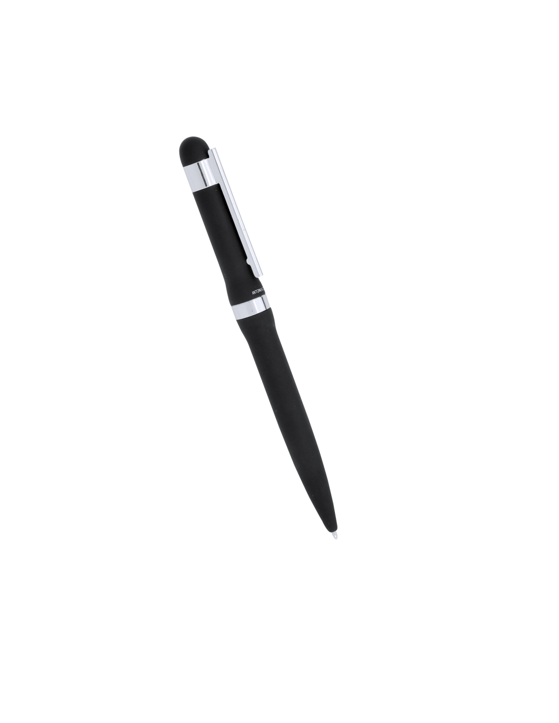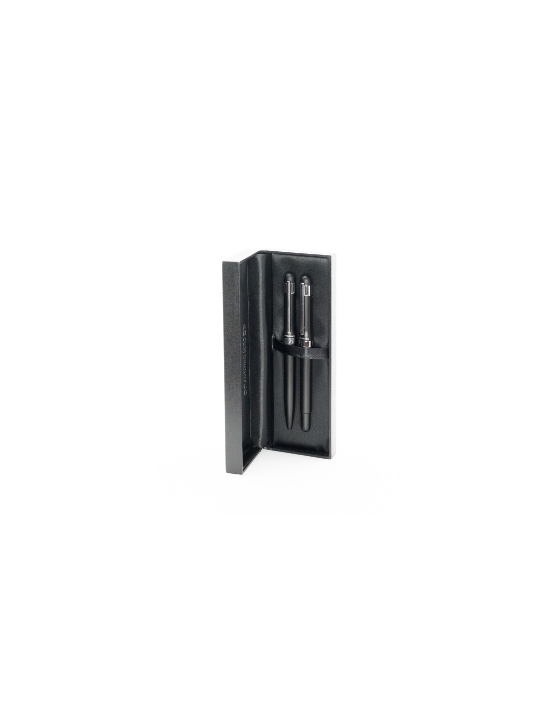 Elegante set de Antonio Miró con bolígrafo de mecanismo giratorio y roller de capucha y original anilla en sobrio diseño. De cuerpo metálico en acabado negro brillante con clip plateado. Presentado en elegante estuche individual en color negro con logotipo de la marca y funda. En tinta azul.