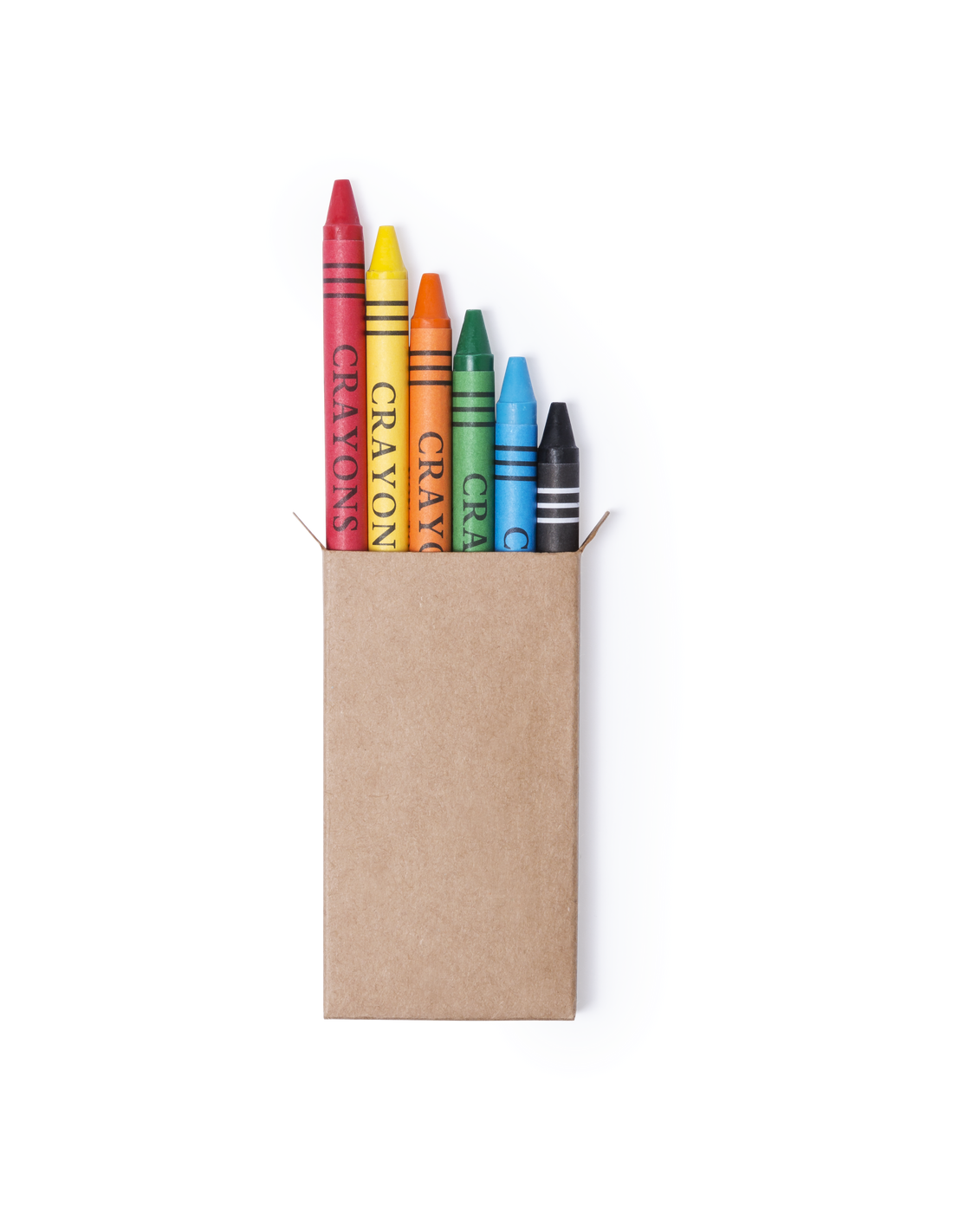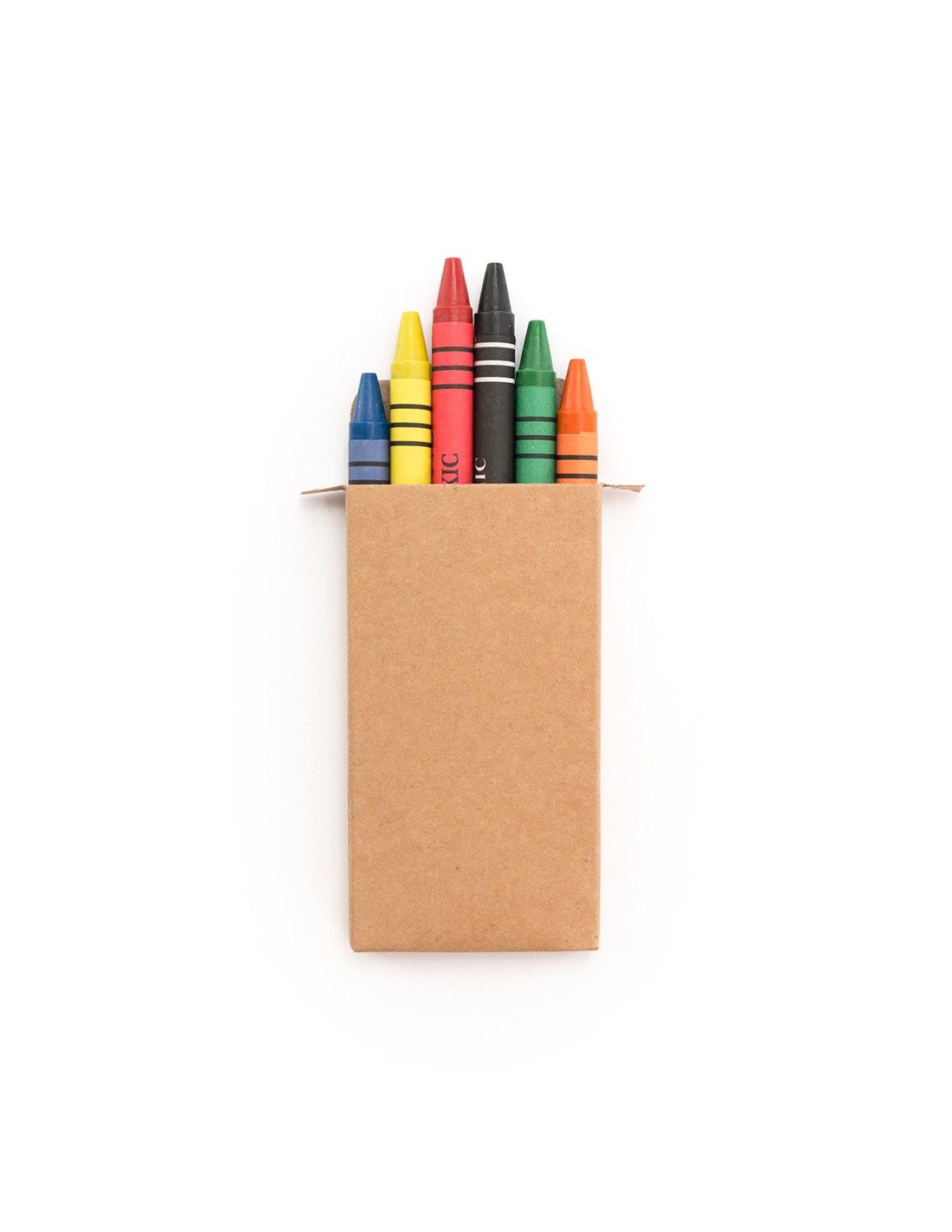 Set de 6 ceras en caja de cartón natural. Con cuerpo cilíndrico en variados colores. En colores rojo, verde, amarillo, azul, marrón, y naranja.