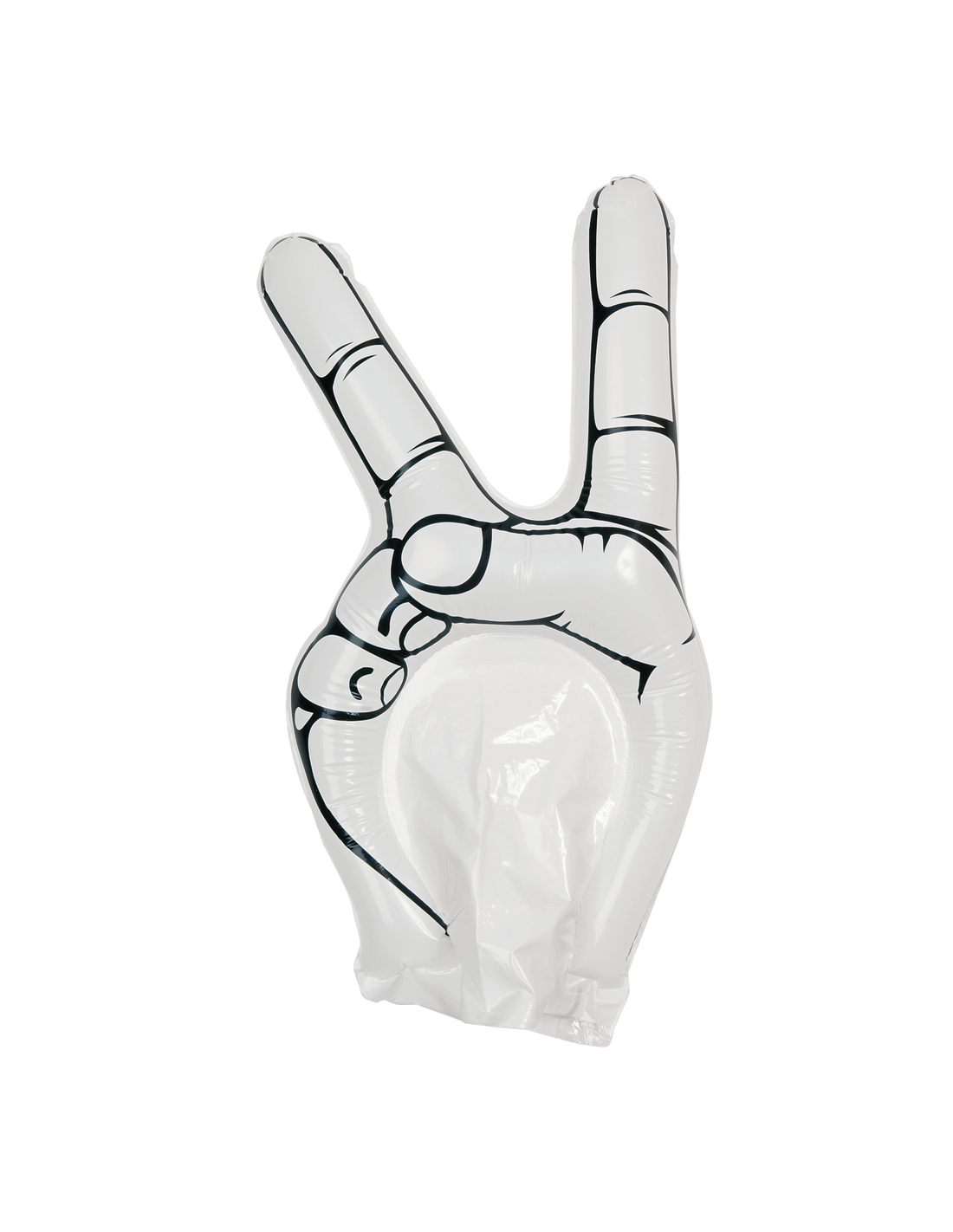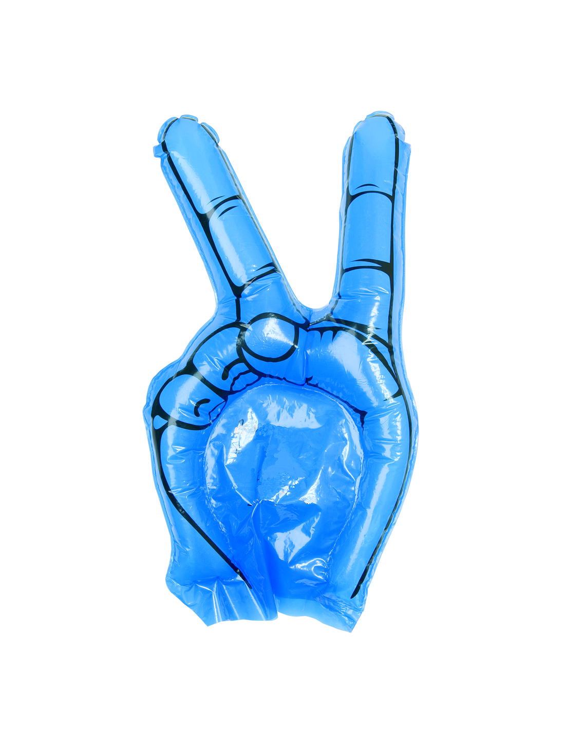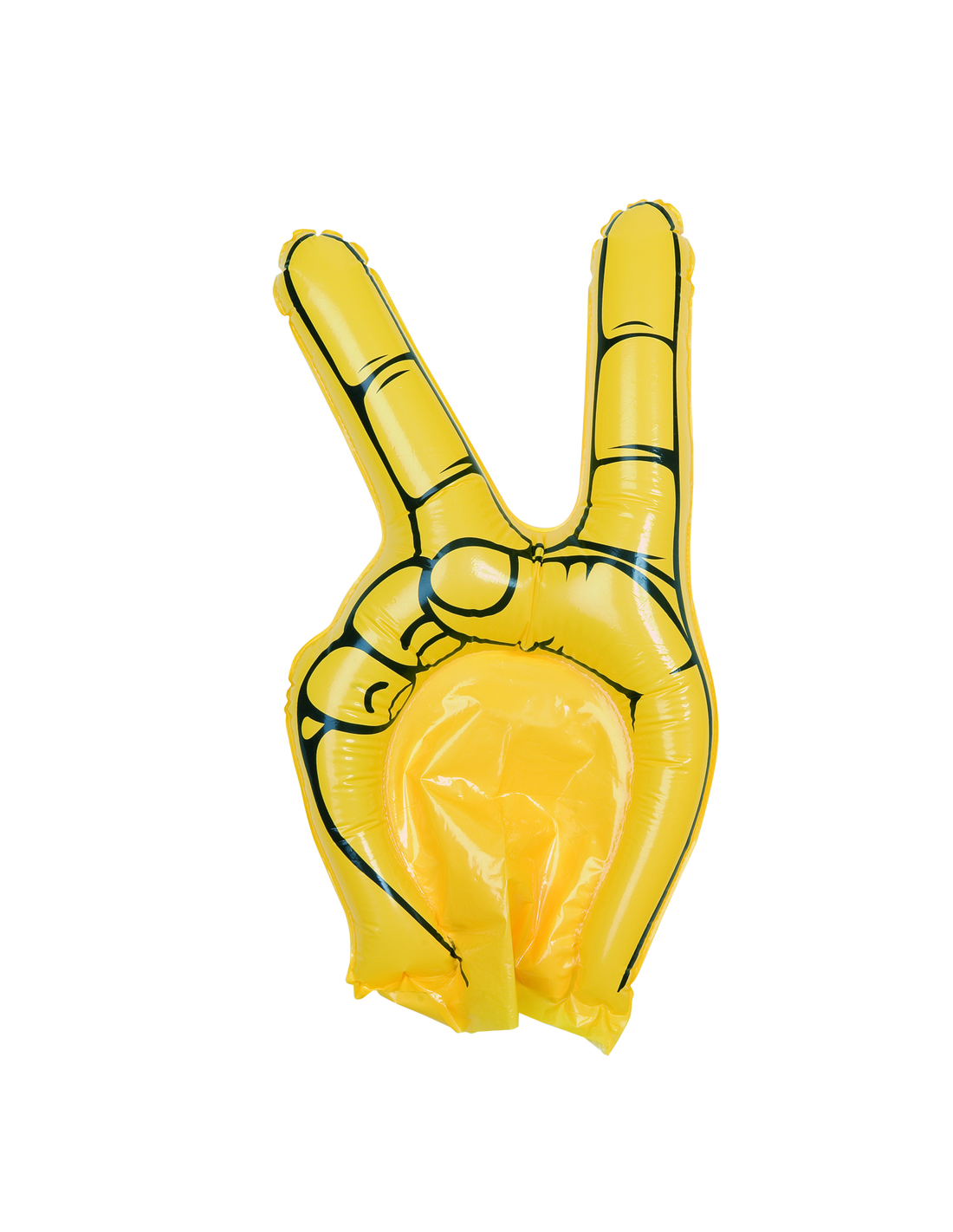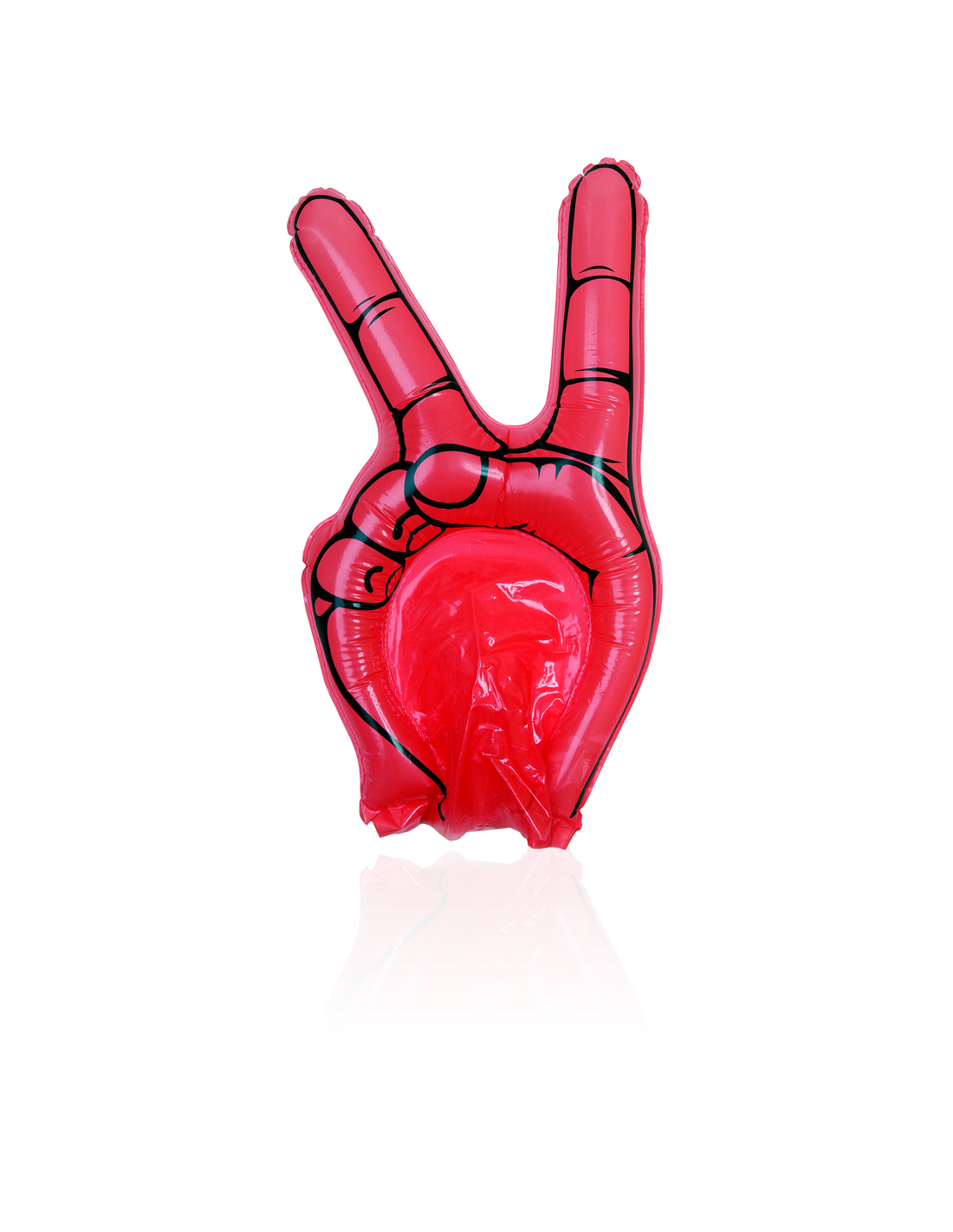 Divertida mano de animación victoria en resistente material LDPE de vivos colores. Reutilizable y con válvula de inflado incluida.