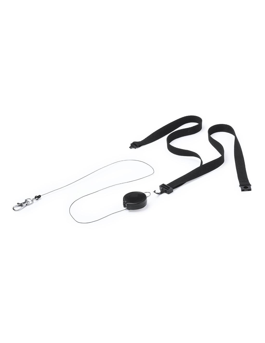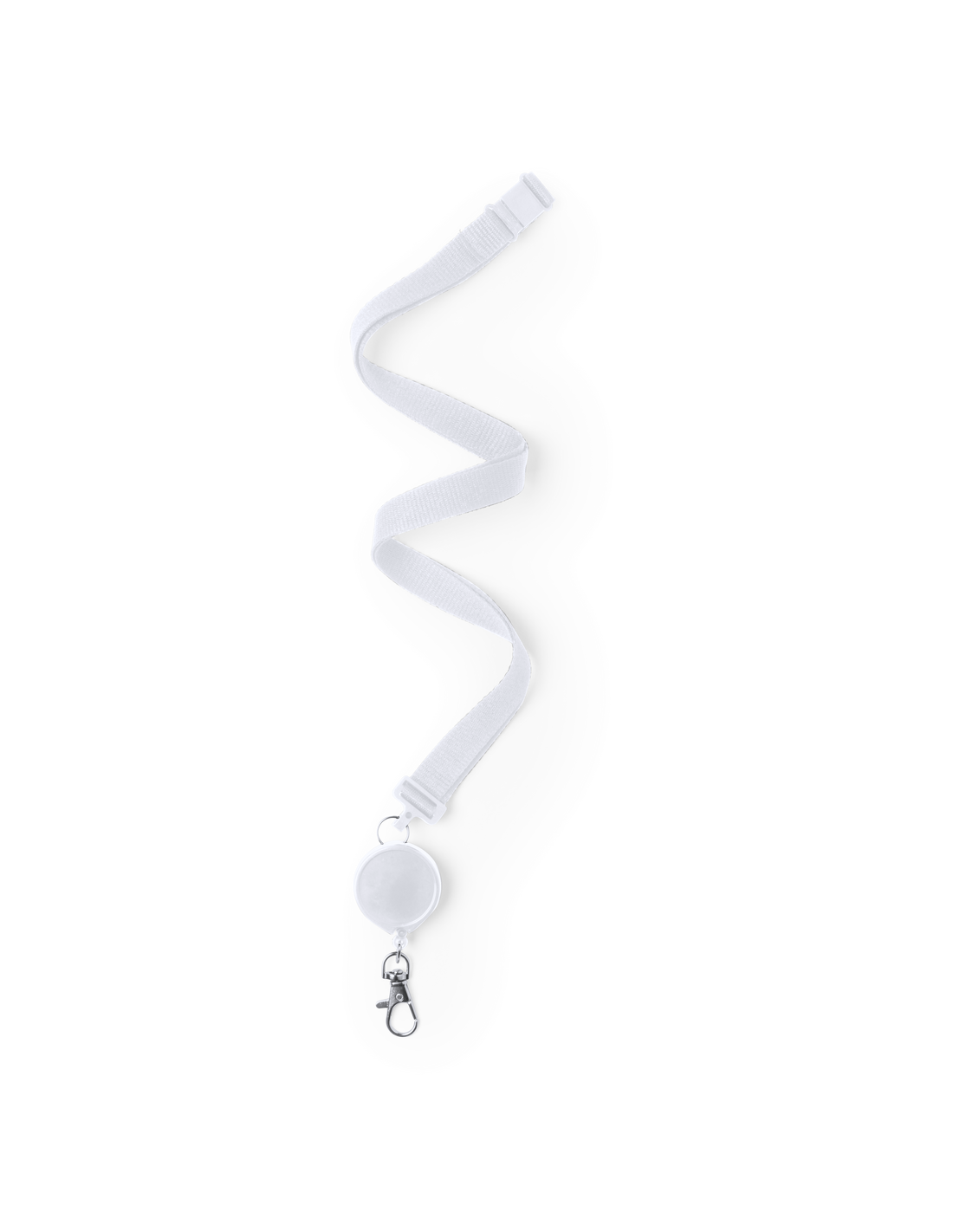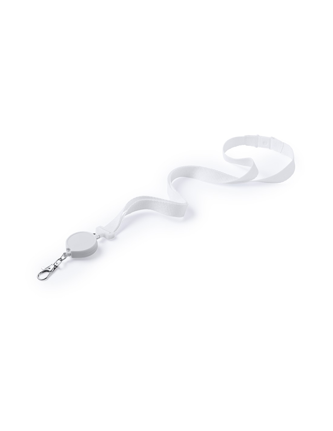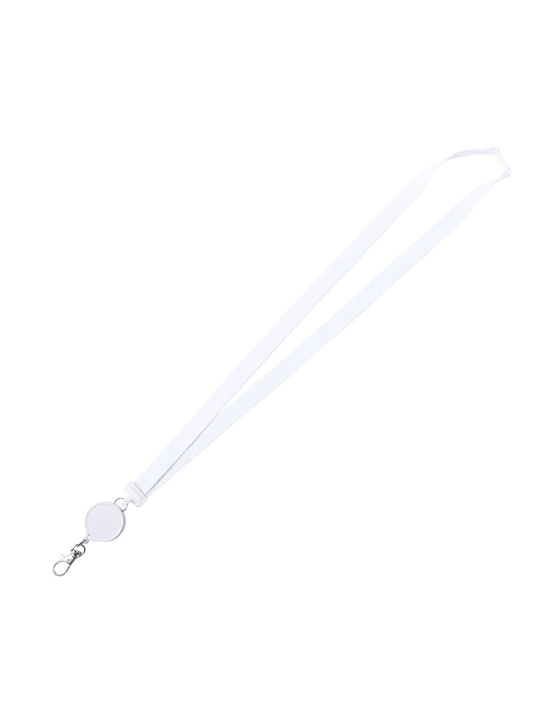 Práctico lanyard en poliéster con accesorio extensible. Accesorio de seguridad en el cuello y accesorio retráctil extensible con clip de ajuste en un lado, dejando el otro lado libre para el logotipado. Mosquetón metálico. Conjunto disponible en colores blanco y negro.
