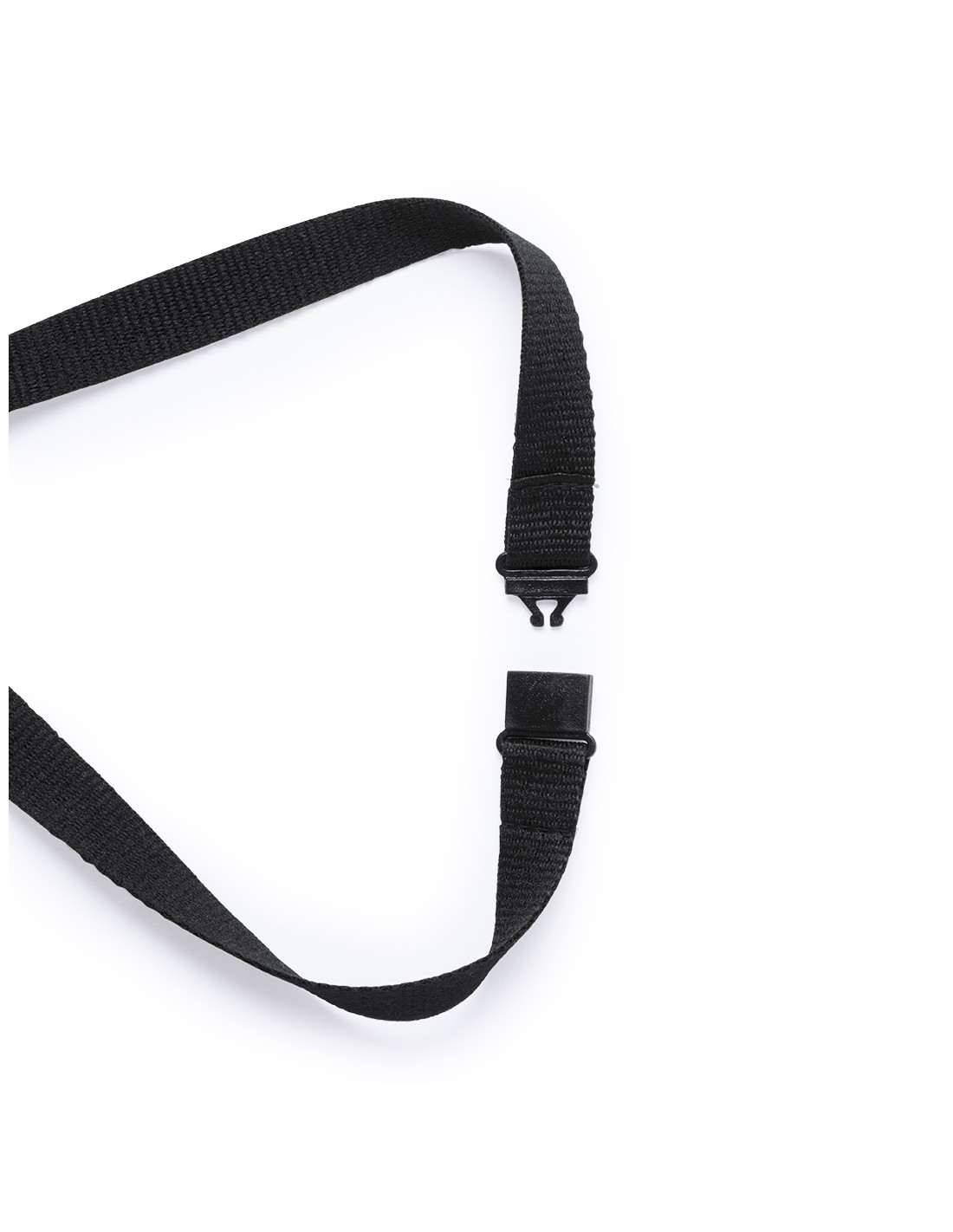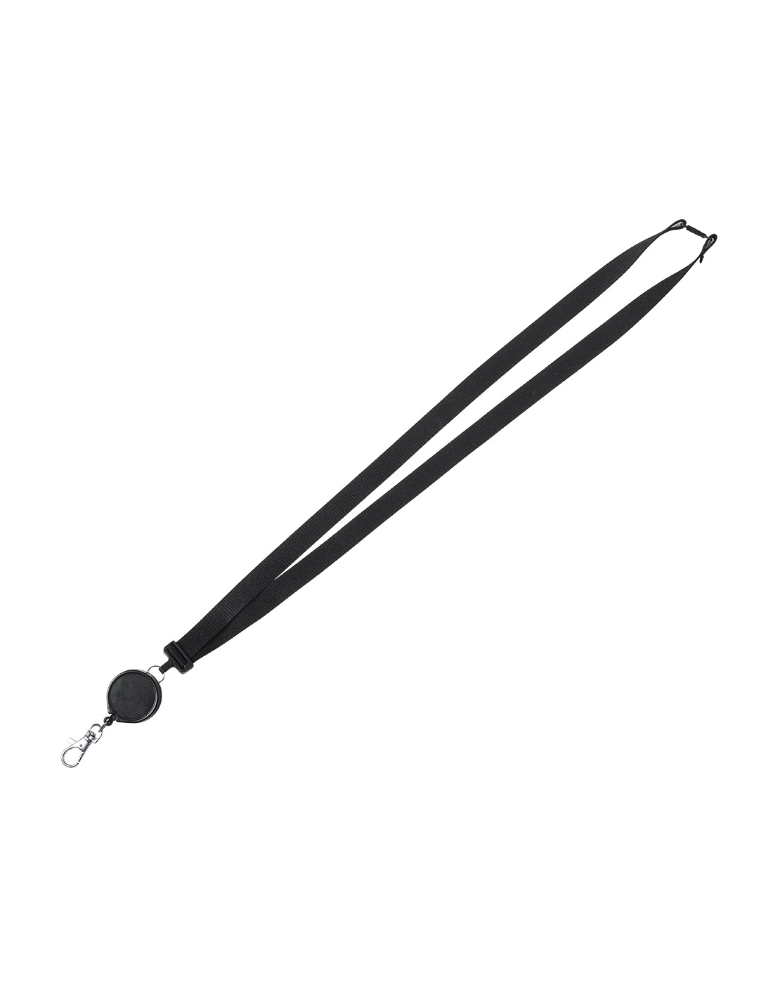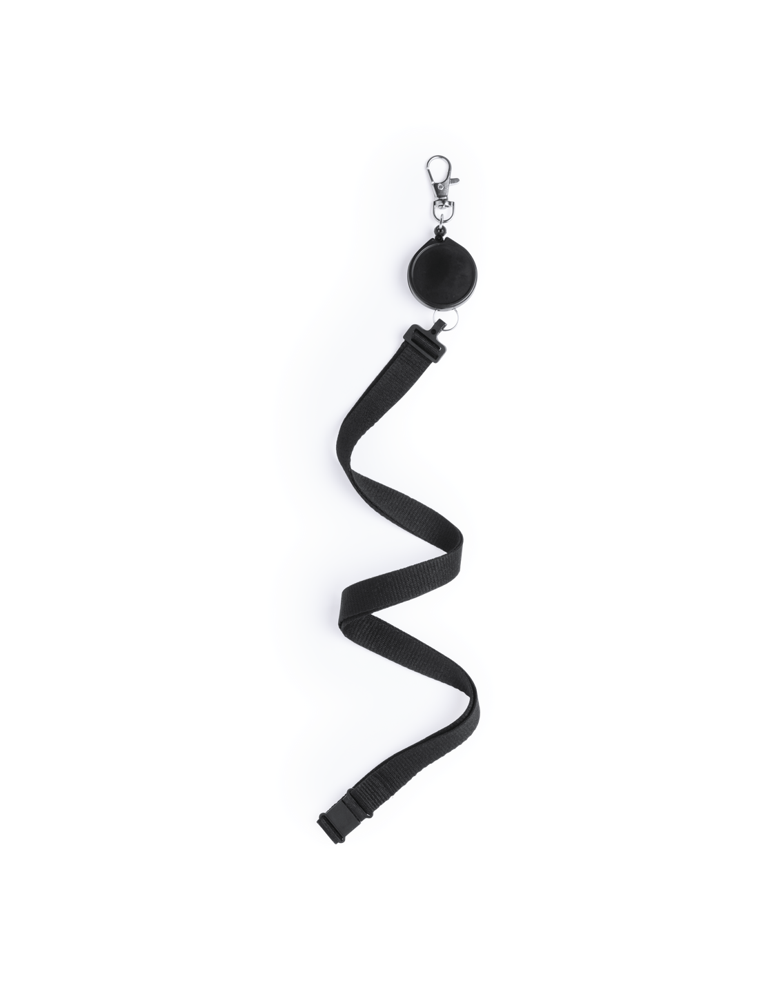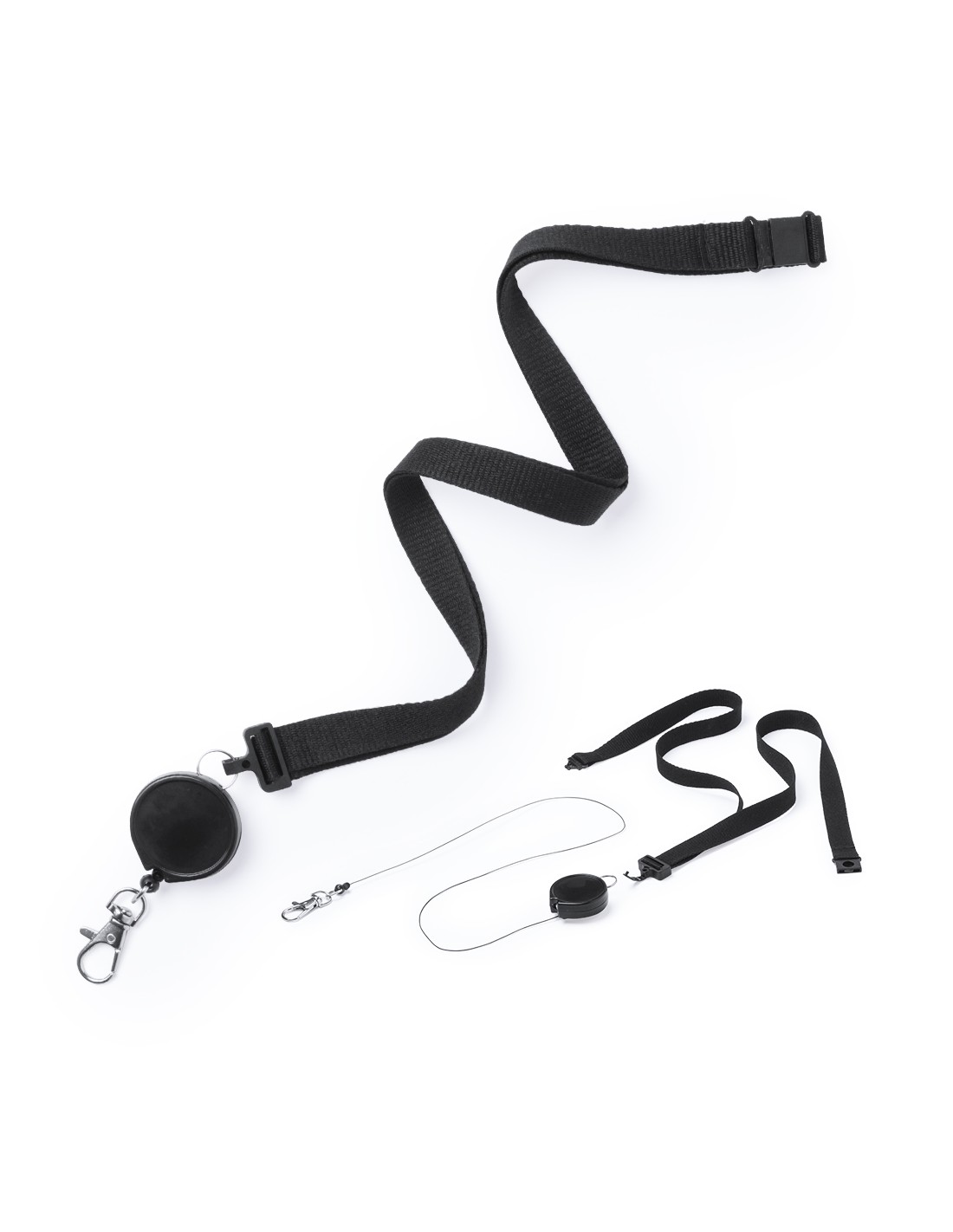Práctico lanyard en poliéster con accesorio extensible. Accesorio de seguridad en el cuello y accesorio retráctil extensible con clip de ajuste en un lado, dejando el otro lado libre para el logotipado. Mosquetón metálico. Conjunto disponible en colores blanco y negro.