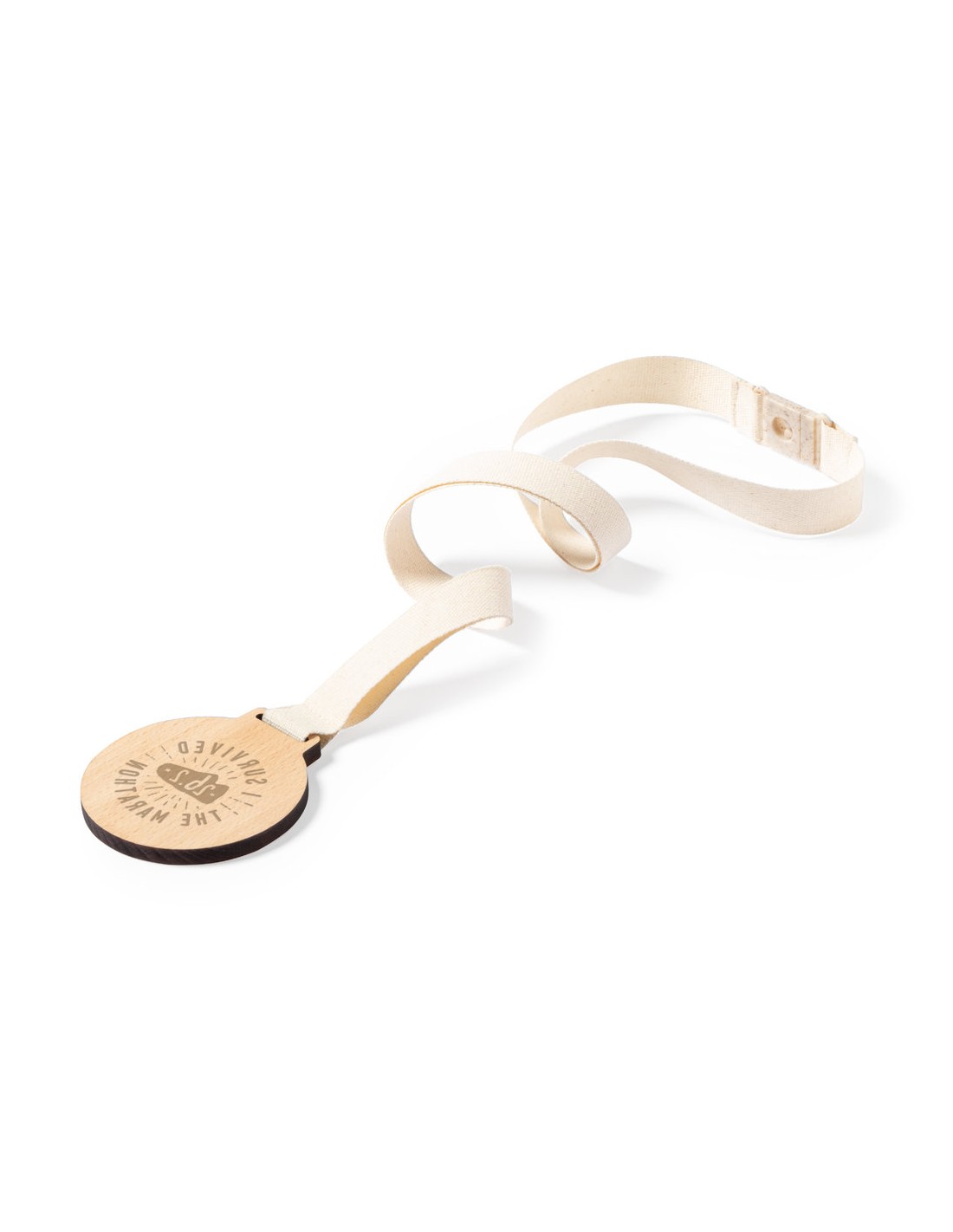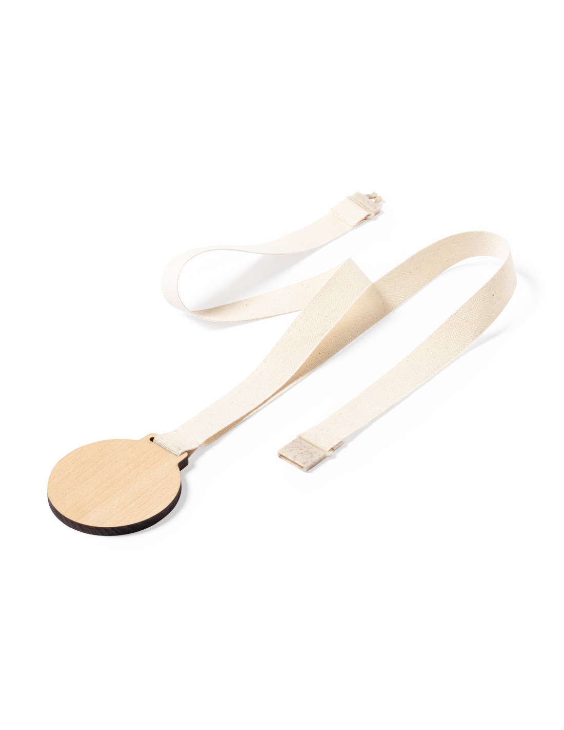 Medalla de línea nature fabricada en madera natural. Cordón fabricado en 100% algodón, con cierre de seguridad de fibra de trigo en el cuello.
