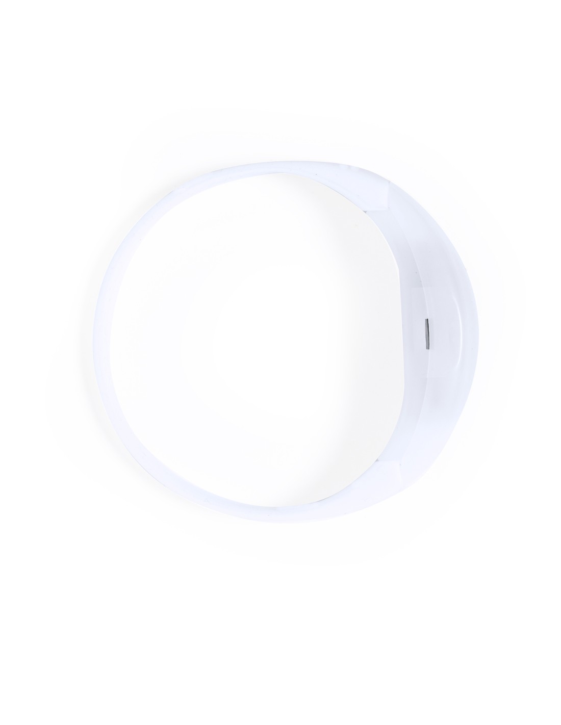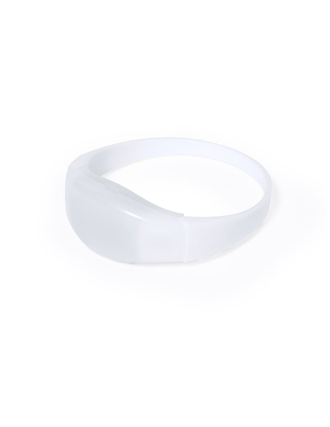 Original pulsera con luces LEDs. En suave silicona y con 2 luces LEDs de colores en su interior, alimentadas por pila de botón (incluida). Con discreto interruptor sensible al sonido y que cambia automáticamente el color de las luces al ritmo de la música. Presentada individualmente en una bolsa de papel reciclado.