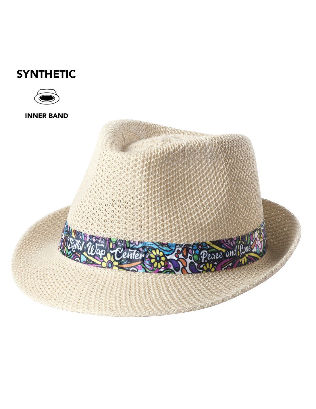 Sombrero de alta calidad en material sintético de sobrios colores con confortable cinta interior a juego.