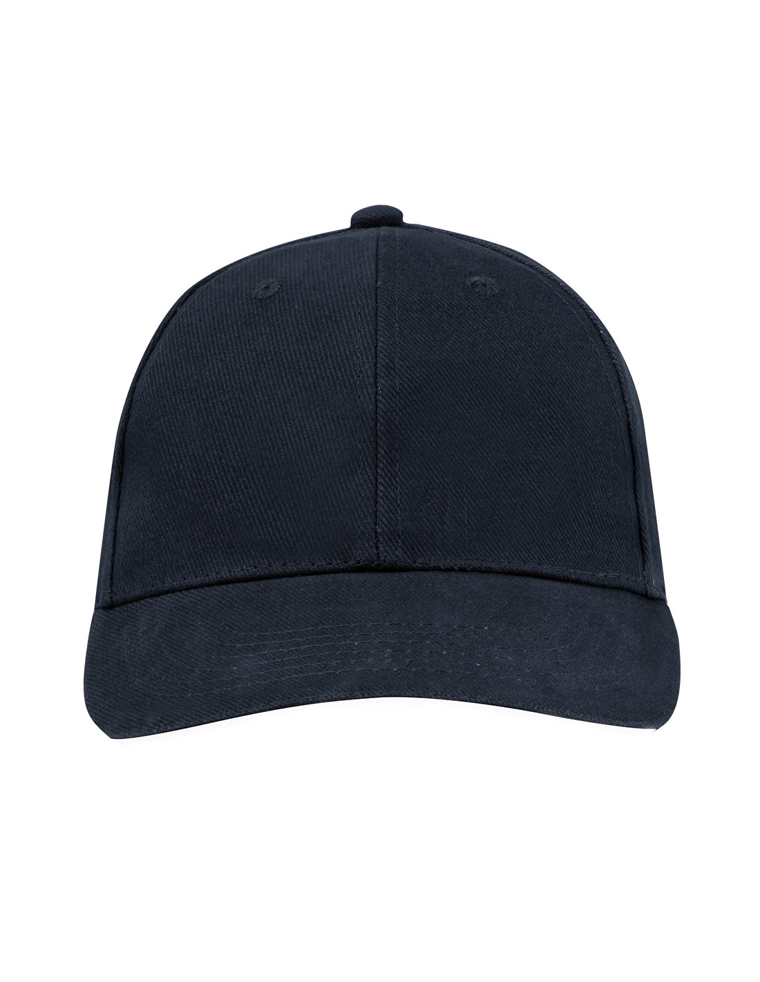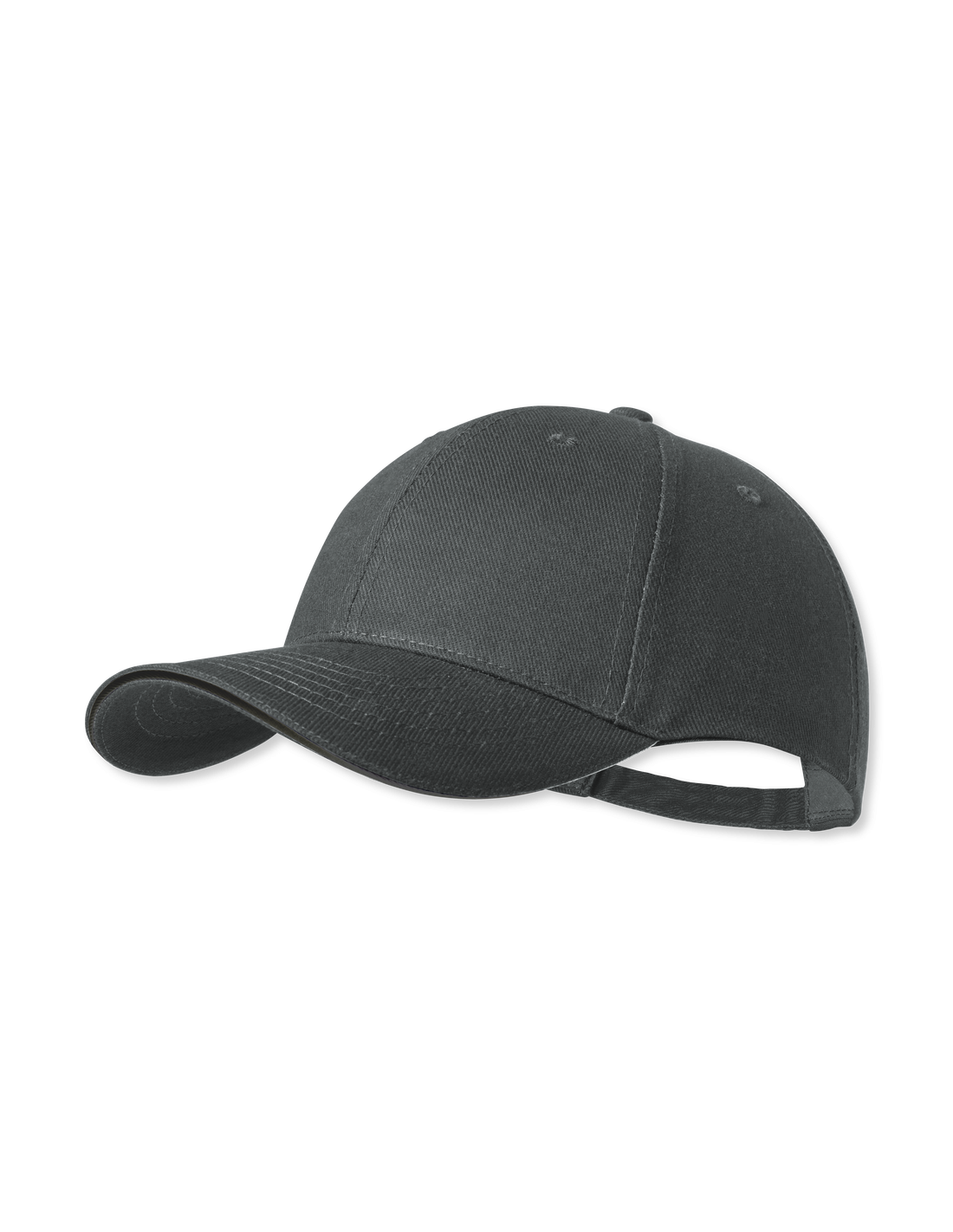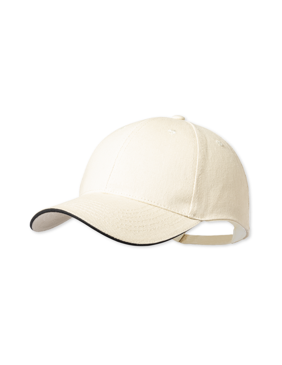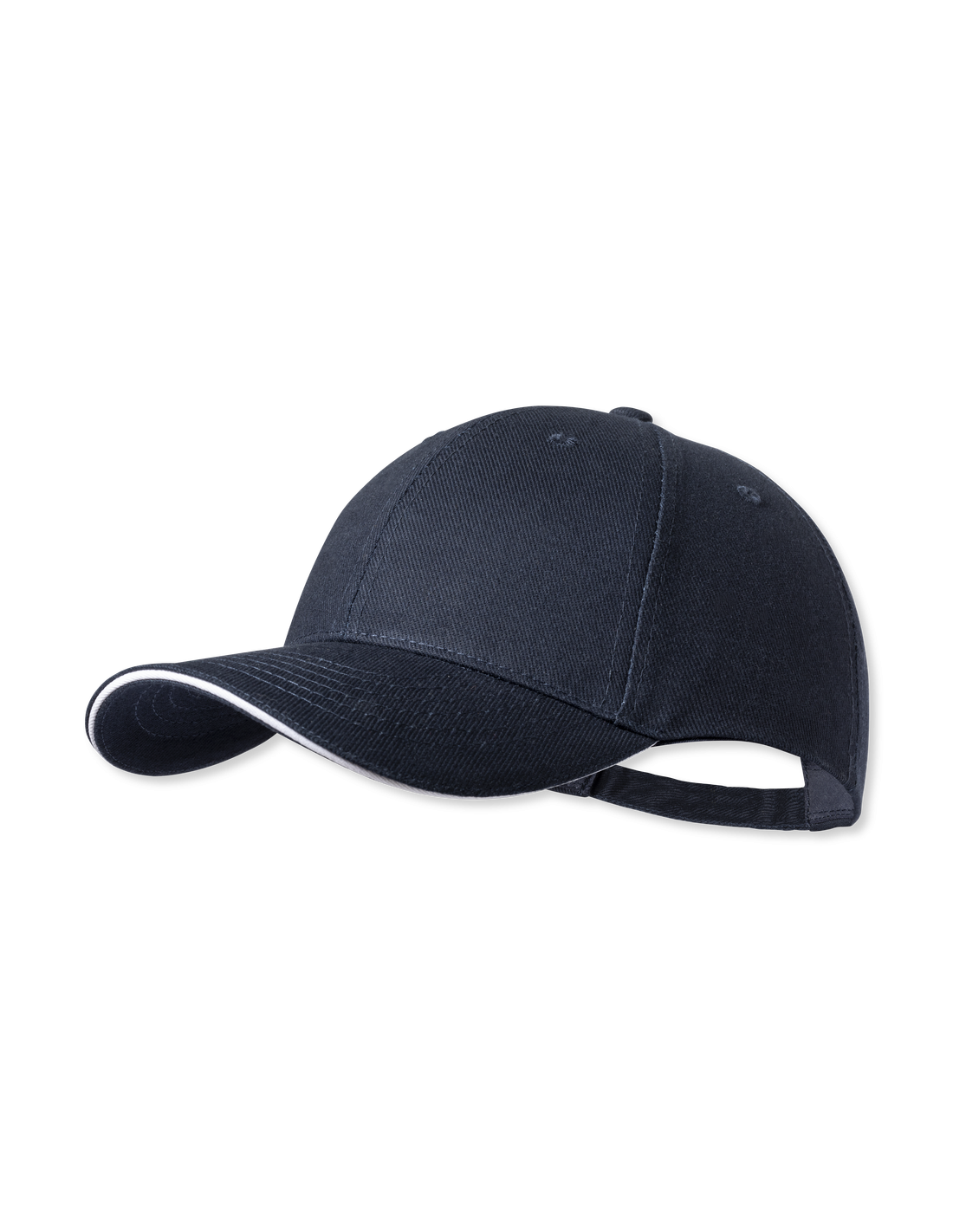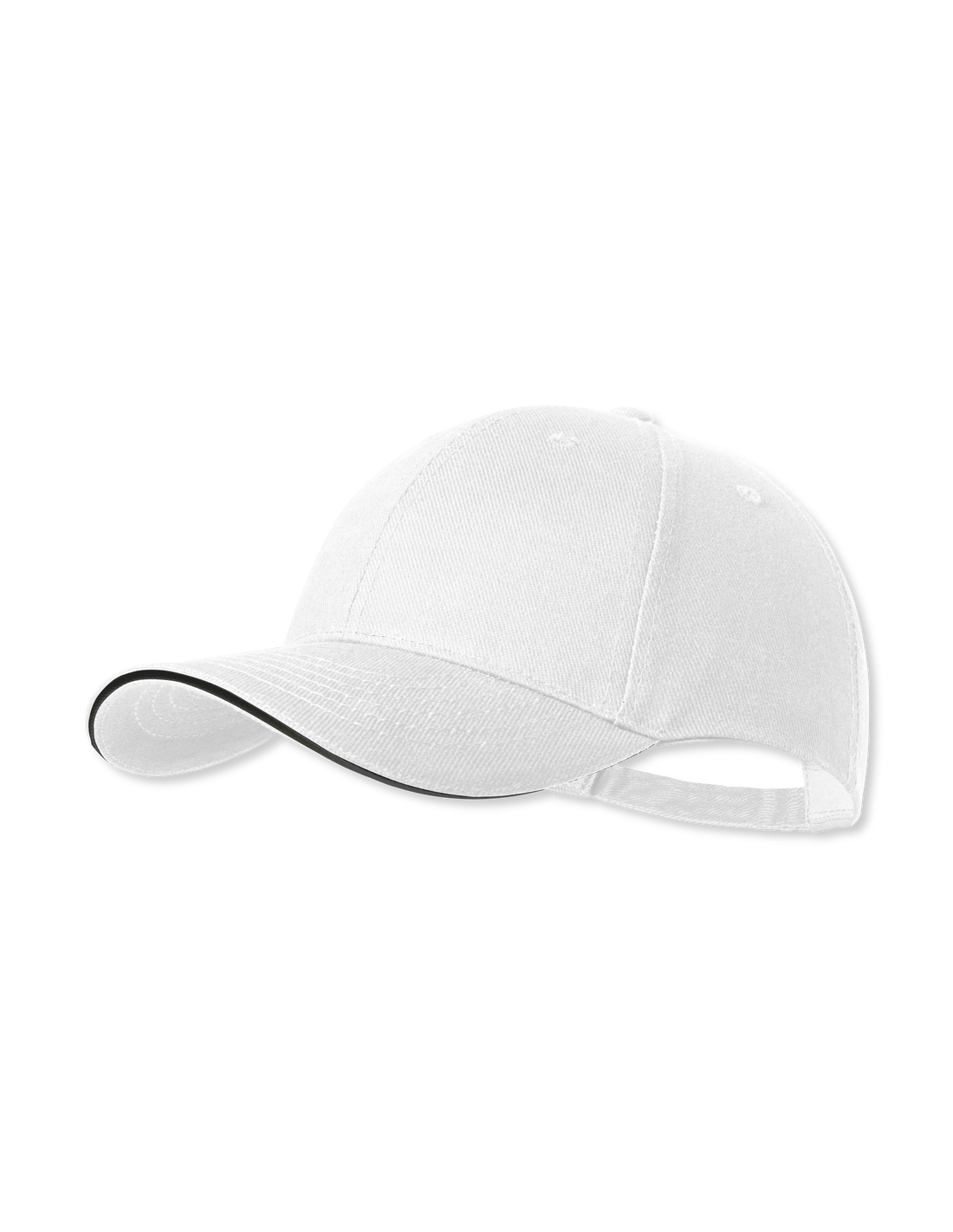 Gorra de 6 paneles fabricada en resistente algodón peinado de 250g/m2. Con sandwich en visera, orificios de ventilación bordados y cierre con hebilla metálica.