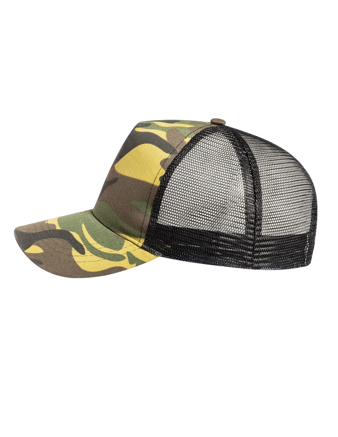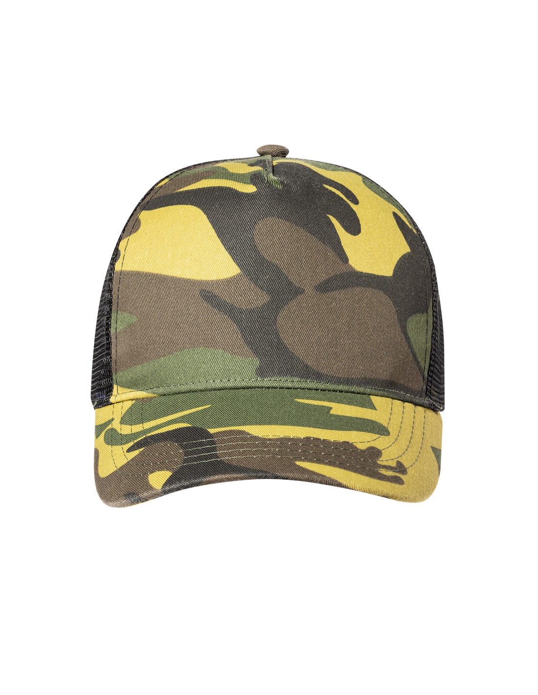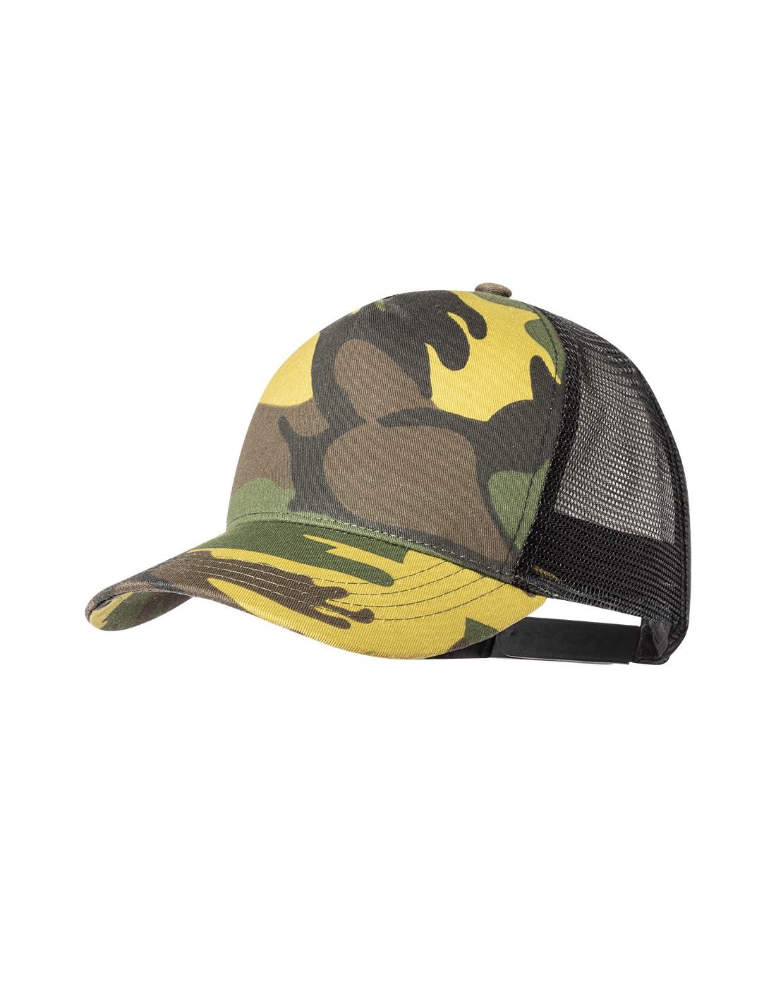 Gorra de 5 paneles en poliéster RPET con rejilla y cierre ajustable de plástico con diseño de camuflaje o verde militar. Etiqueta distintiva de RPET. El material RPET se elabora a partir de plástico reciclado, para así fomentar la reutilización de residuos plásticos y ayudar a la sostenibilidad del planeta.