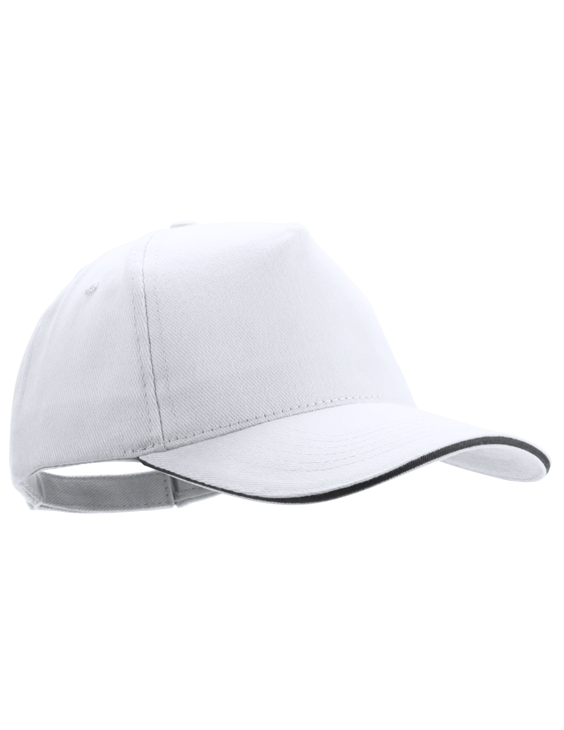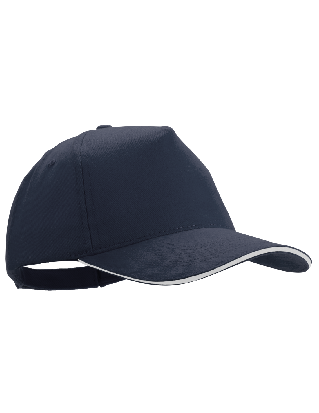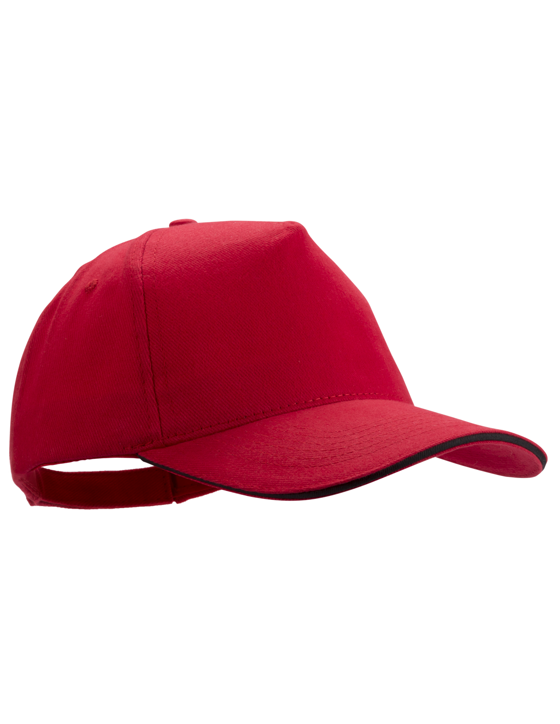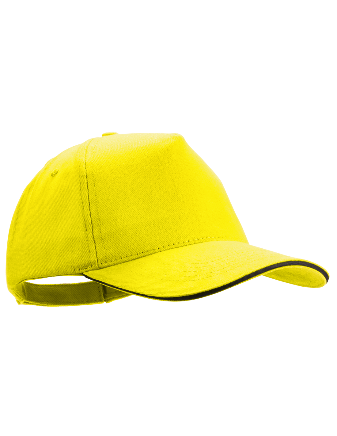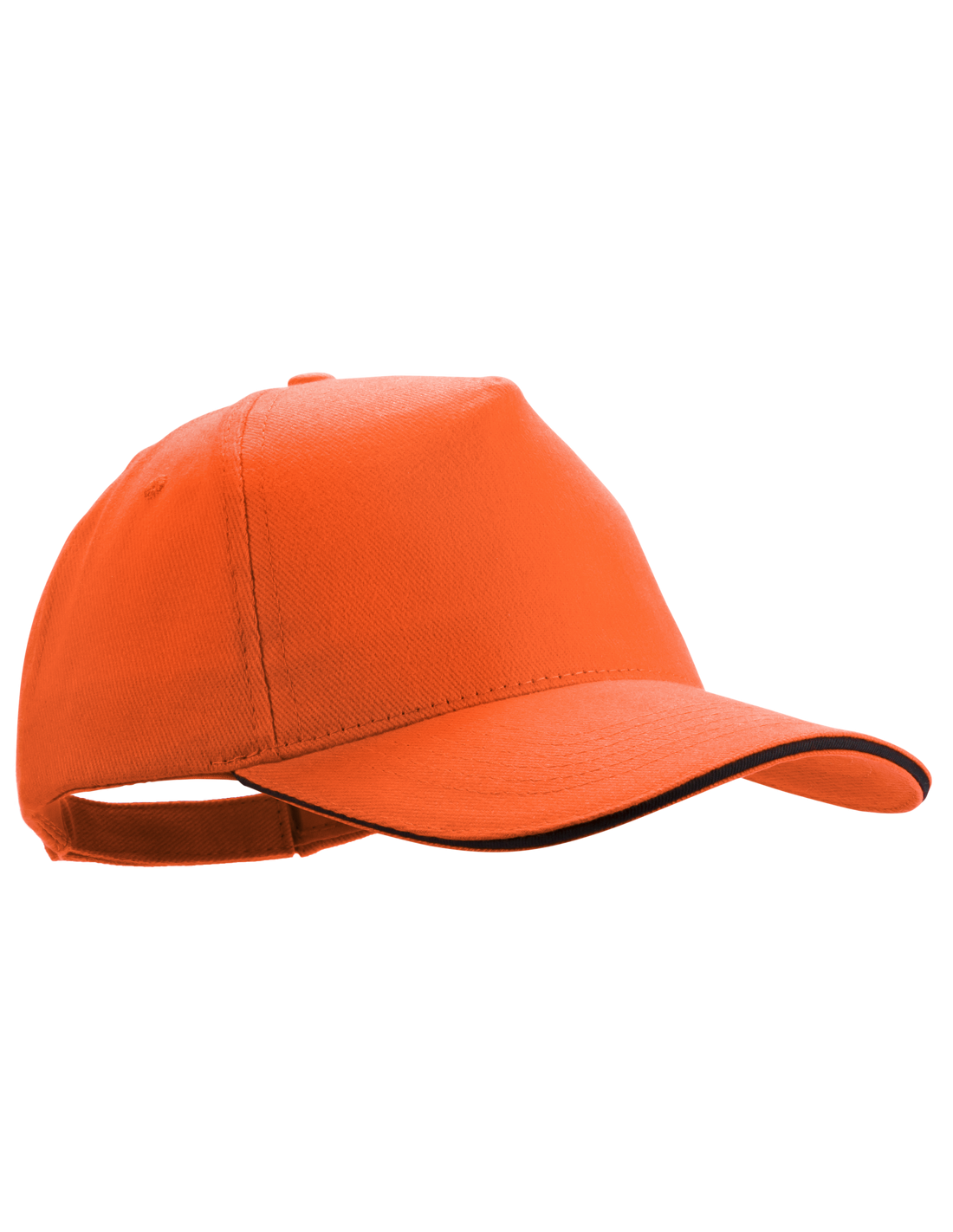 Gorra de 5 paneles en material 100% algodón peinado. En variada gama de vivos colores, con sandwich en color y acolchado en visera. Orificios de ventilación bordados y cierre ajustable de velcro.