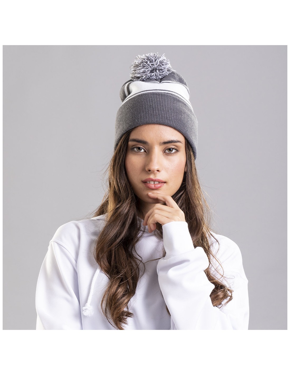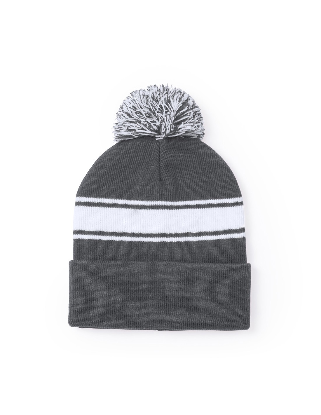 Suave y cálido gorro de material acrílico en variada gama de colores. De original diseño, con tira frontal de color blanco y pom pom bicolor a juego.