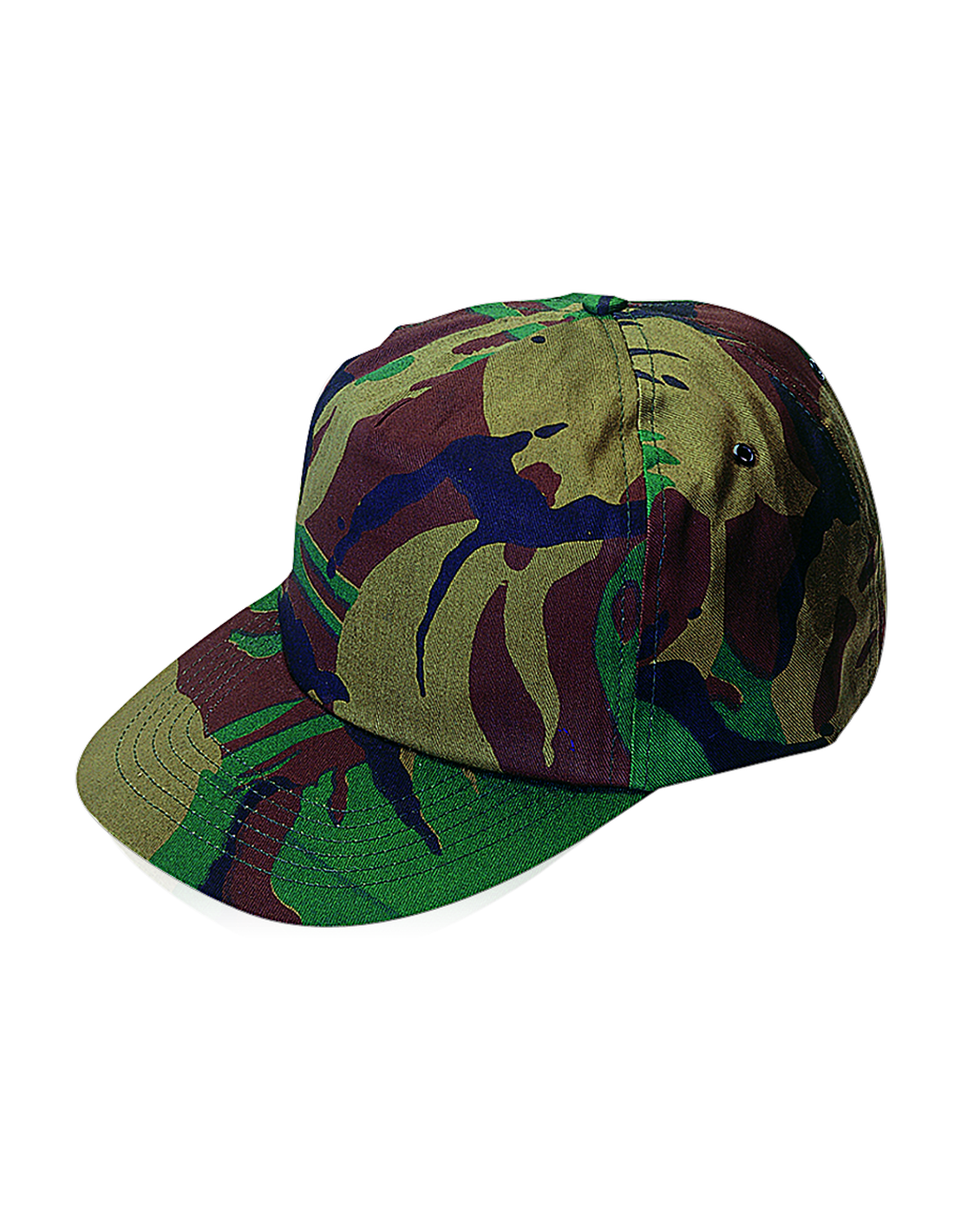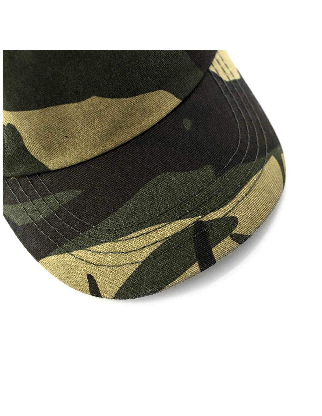 Gorra de 5 paneles en suave algodón y poliéster con diseño de camuflaje. Con orificios de ventilación bordados y cierre ajustable de velcro.