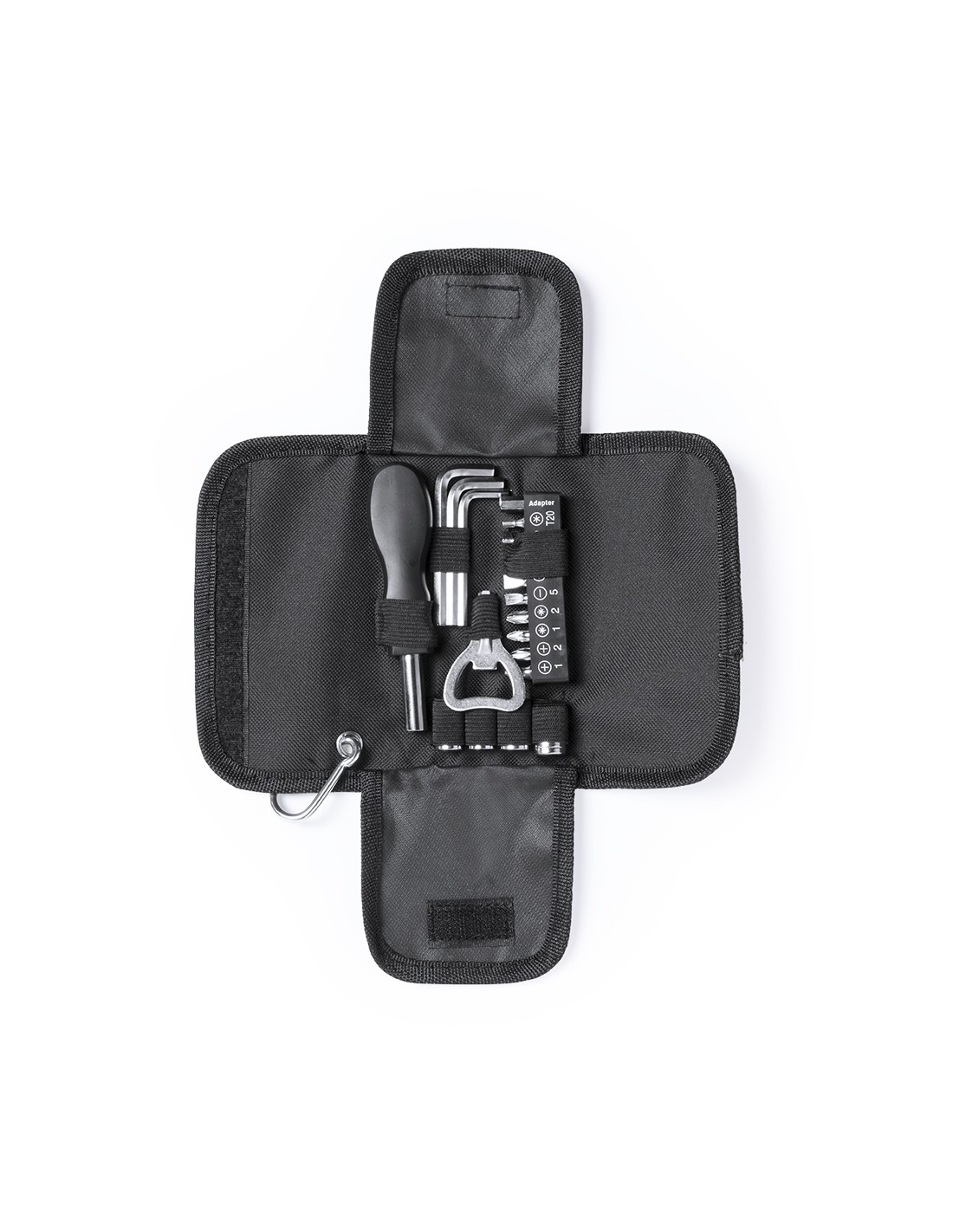 Set de herramientas de 19 accesorios en resistente estuche de poliéster con cierre de cremallera. Incluye herramienta de fijación, cabezales destornilladores planos, de estrella y tipo torx, set de llaves tipo allen, llaves para tuercas de cabeza hexagonal y abridor. Con mosquetón metálico de transporte.