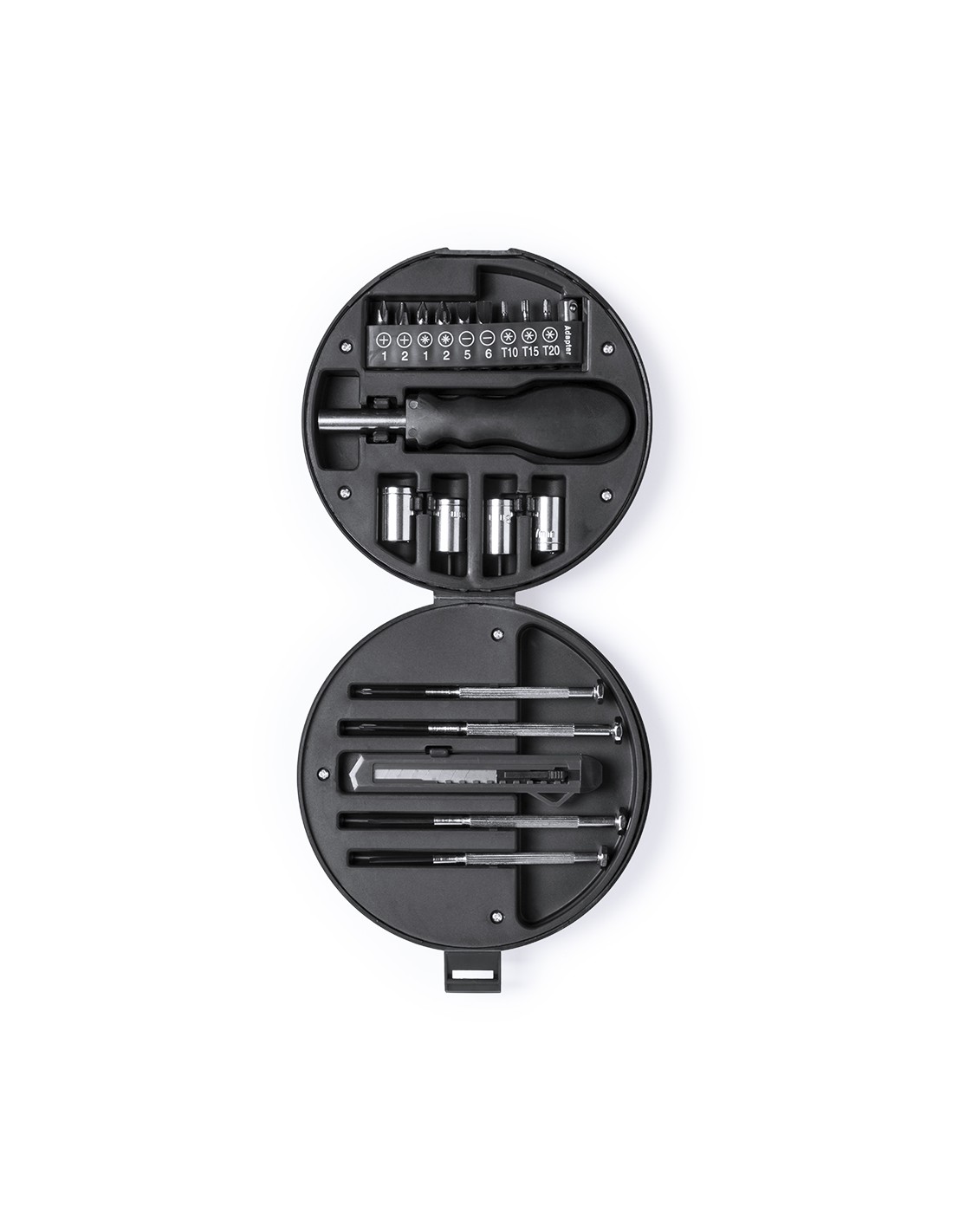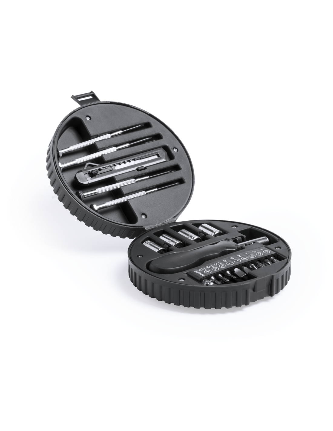 Set de herramientas de 20 accesorios en resistente estuche con diseño de rueda. Incluye set de destornilladores de precisión, herramienta de fijación, cabezales destornilladores planos y de estrella, llaves para tuercas de cabeza hexagonal y cutter. Presentado en caja individual.