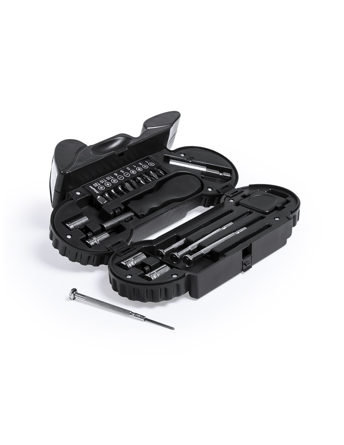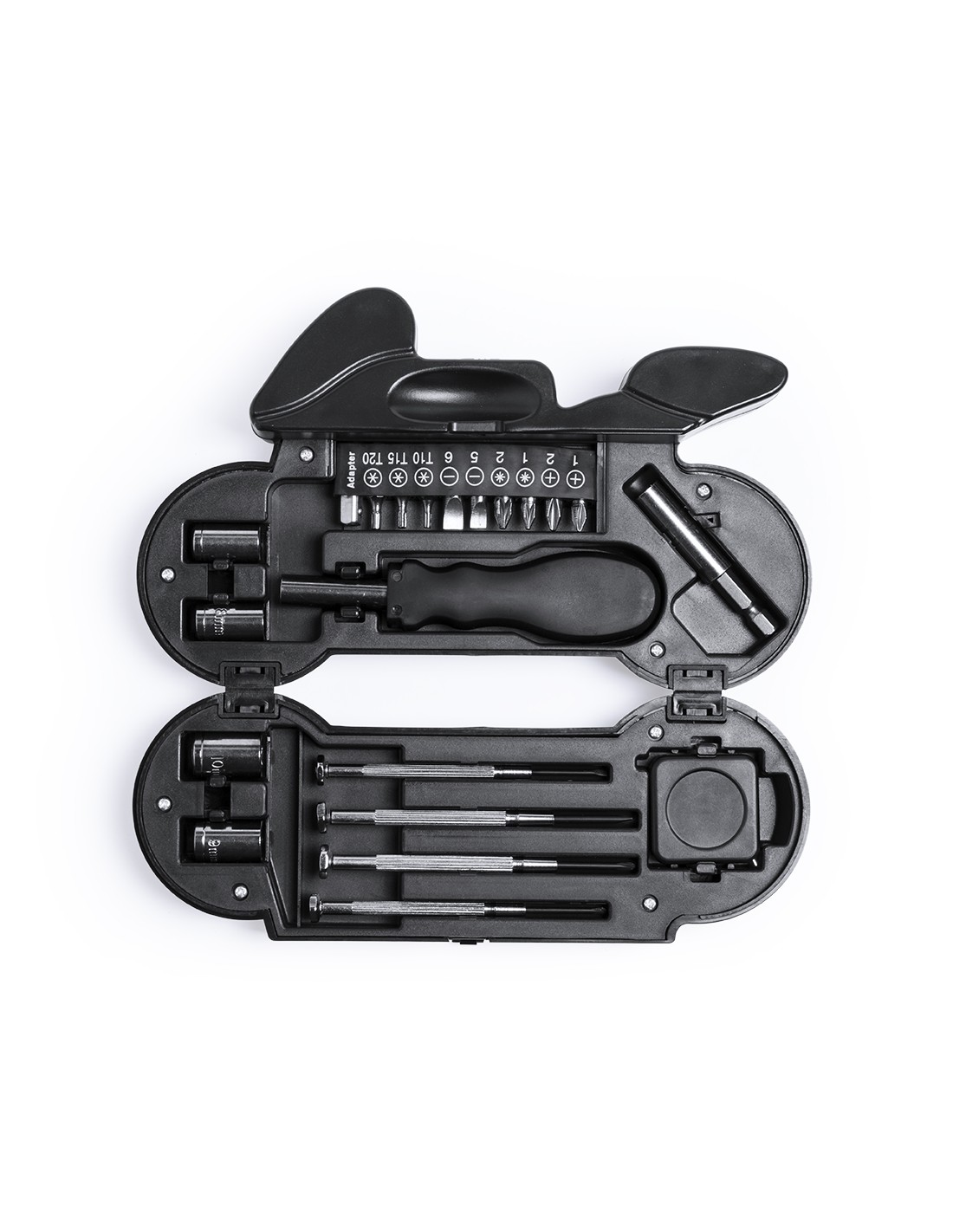 Set de herramientas de 14 accesorios en resistente estuche con diseño de moto, con linterna de 4 ledes integrada. Incluye set de destornilladores de precisión, herramienta de fijación, cabezales destornilladores planos y de estrella y llaves para tuercas de cabeza hexagonal. Pilas de botón incluidas. Presentado en caja individual.