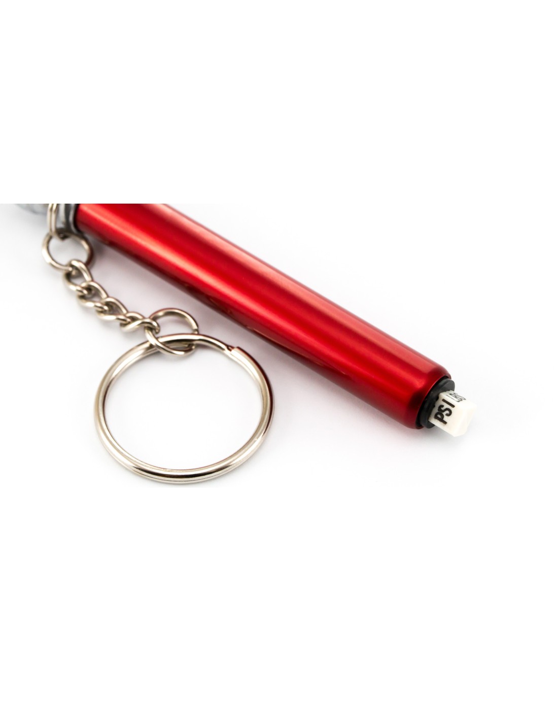 Llavero medidor de presión para neumáticos con cuerpo acabado en aluminio de vivos y variados colores.