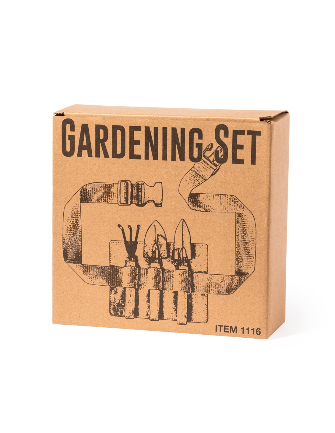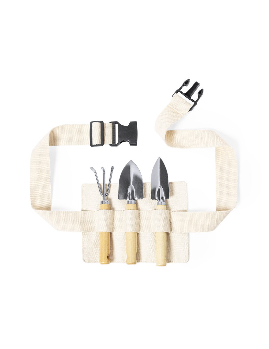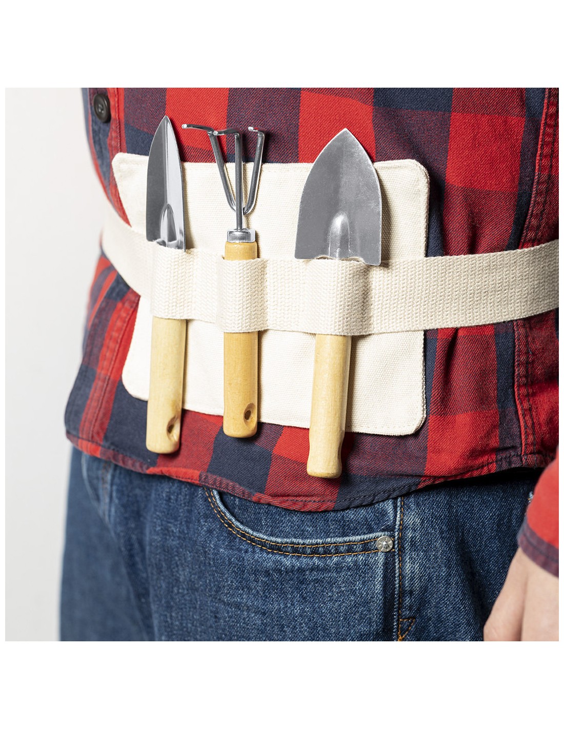 Set de jardinería de 3 accesorios, fabricado en metal con mango de madera. Incluye pala grande, pala pequeña y rastrillo. Con riñonera de transporte en algodón y cierre de click ajustable presentado en atractiva caja de diseño eco.
