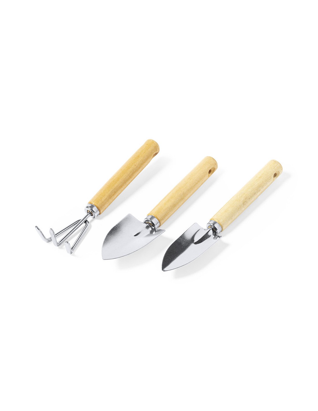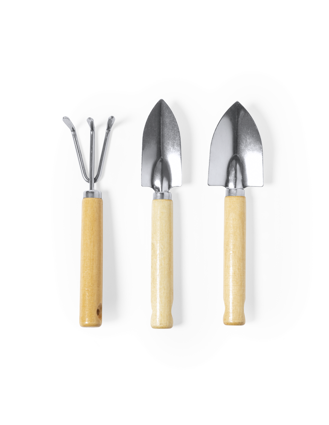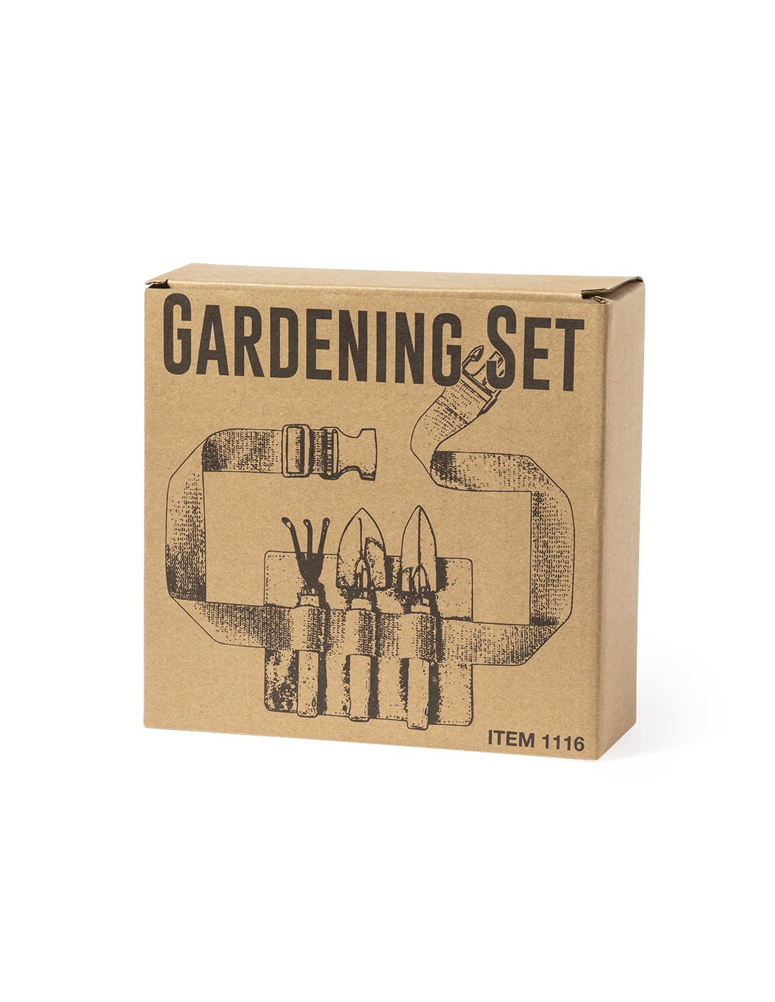 Set de jardinería de 3 accesorios, fabricado en metal con mango de madera. Incluye pala grande, pala pequeña y rastrillo. Con riñonera de transporte en algodón y cierre de click ajustable presentado en atractiva caja de diseño eco.