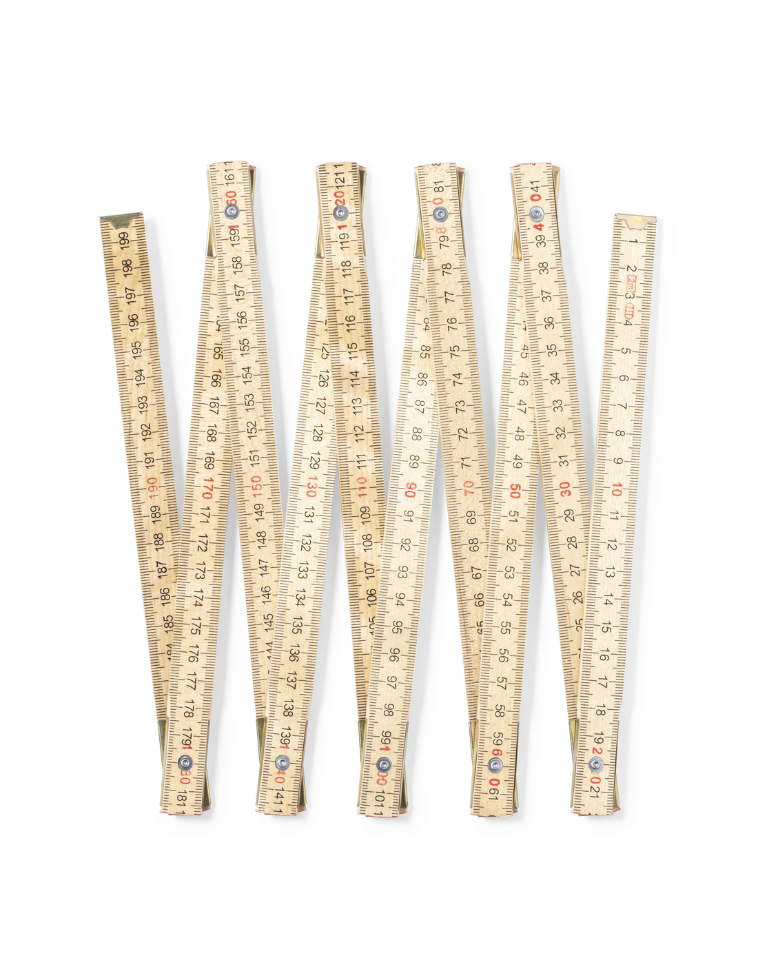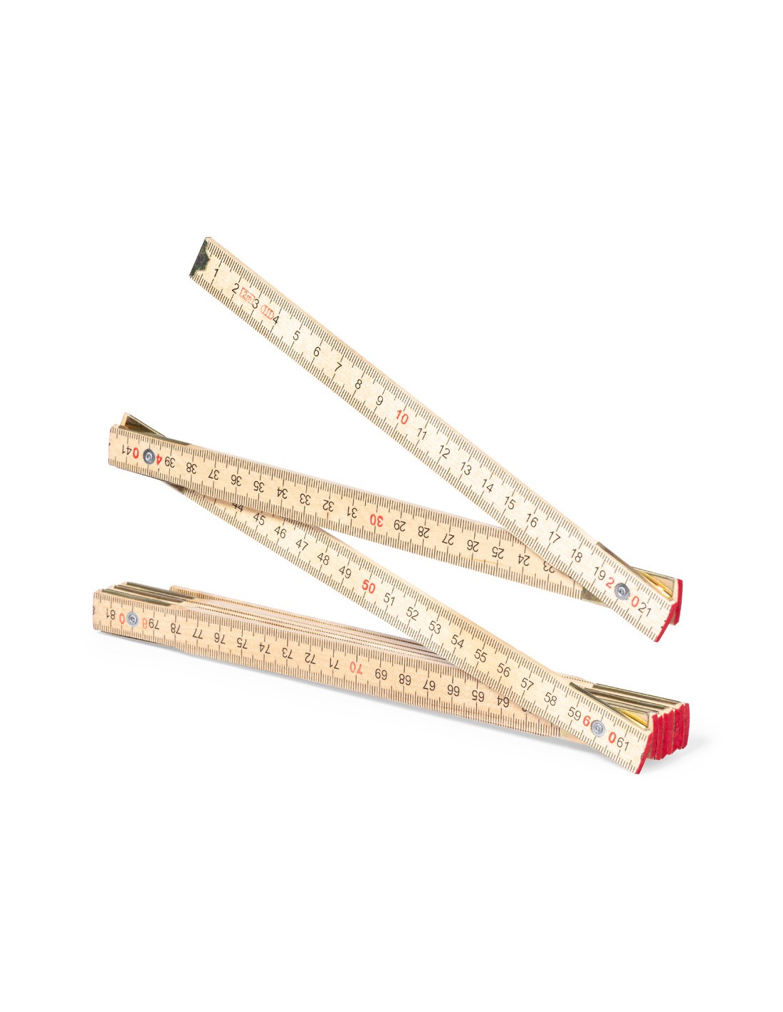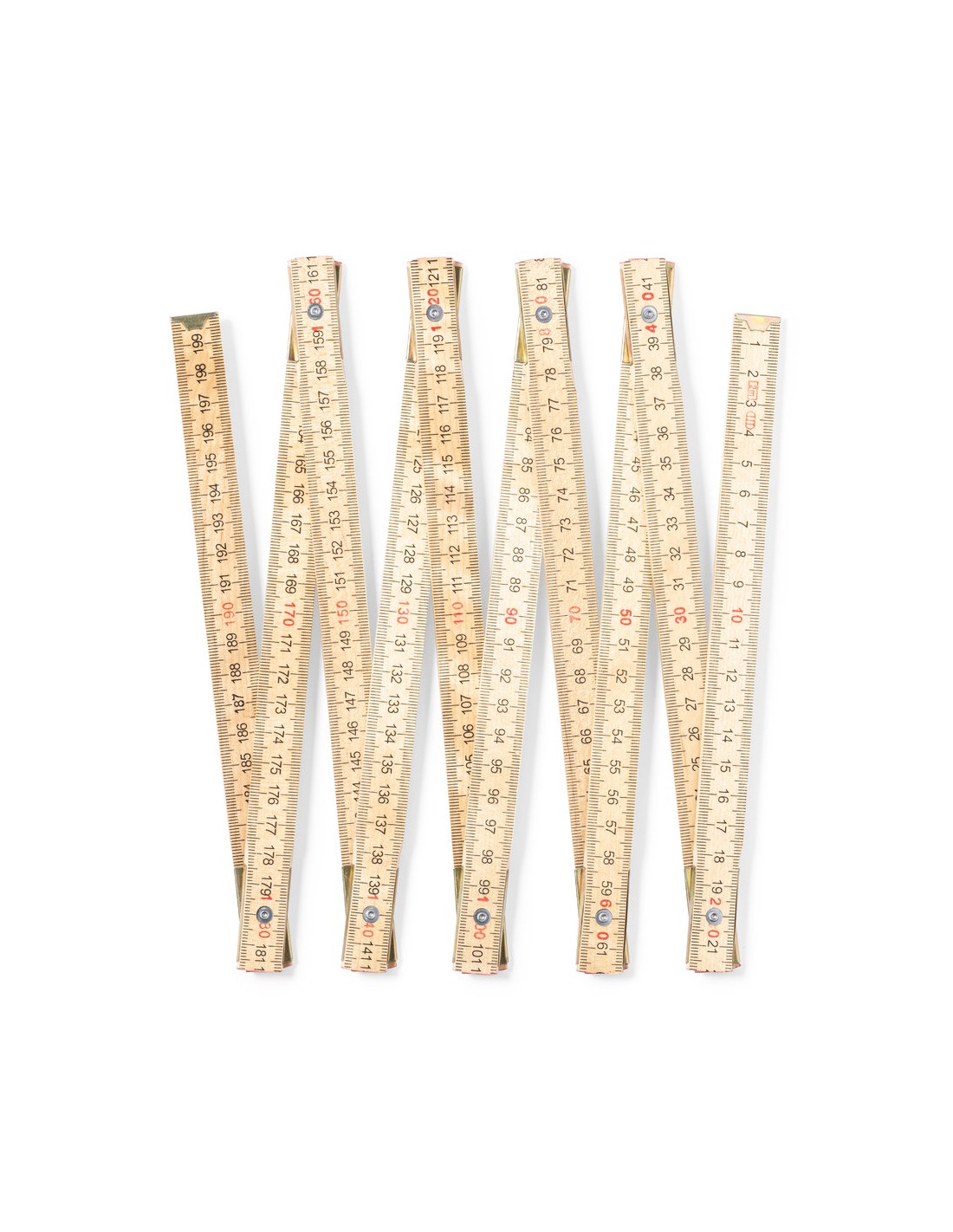 Clásica regla de carpintero fabricada en madera natural. Plegabe, con 10 segmentos y de 2 m de longitud.