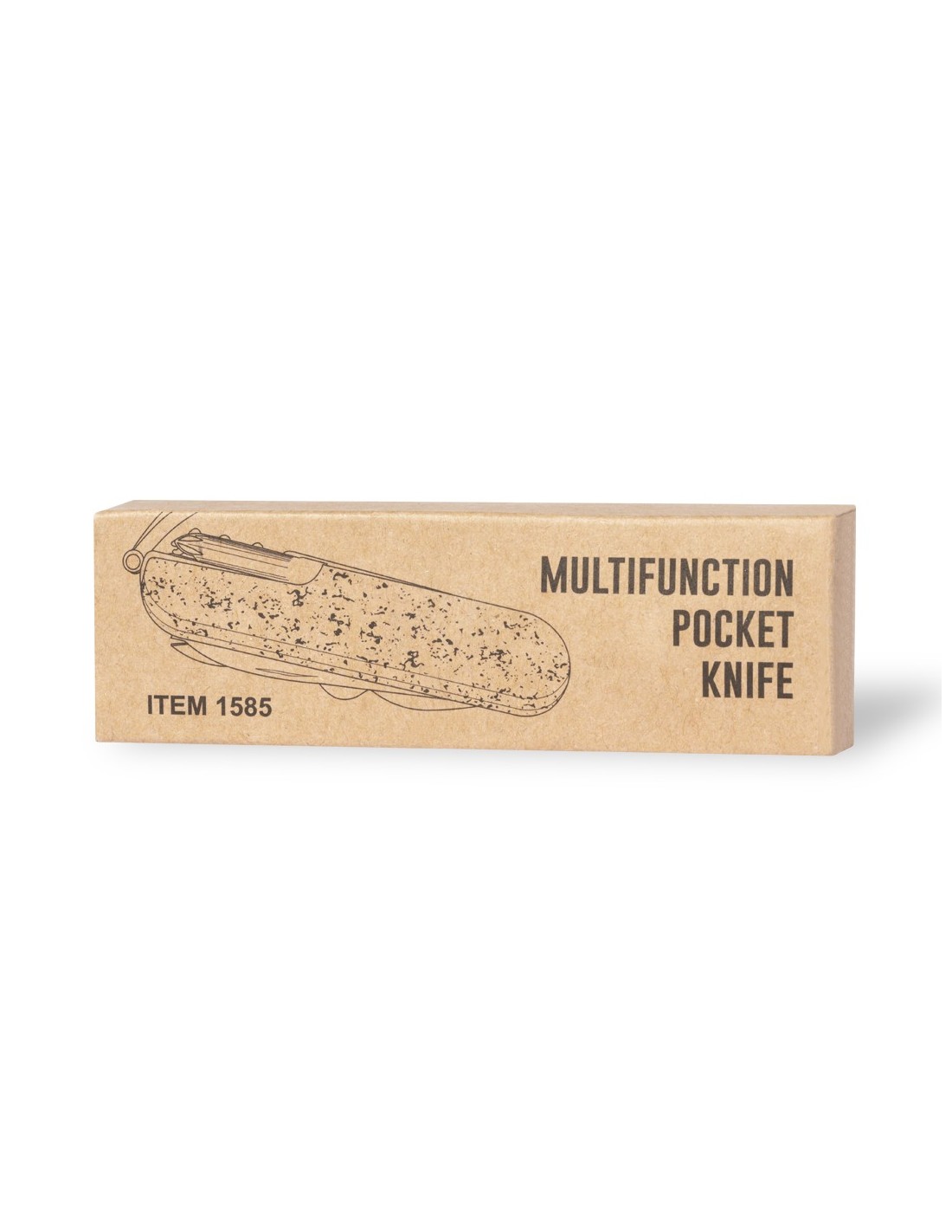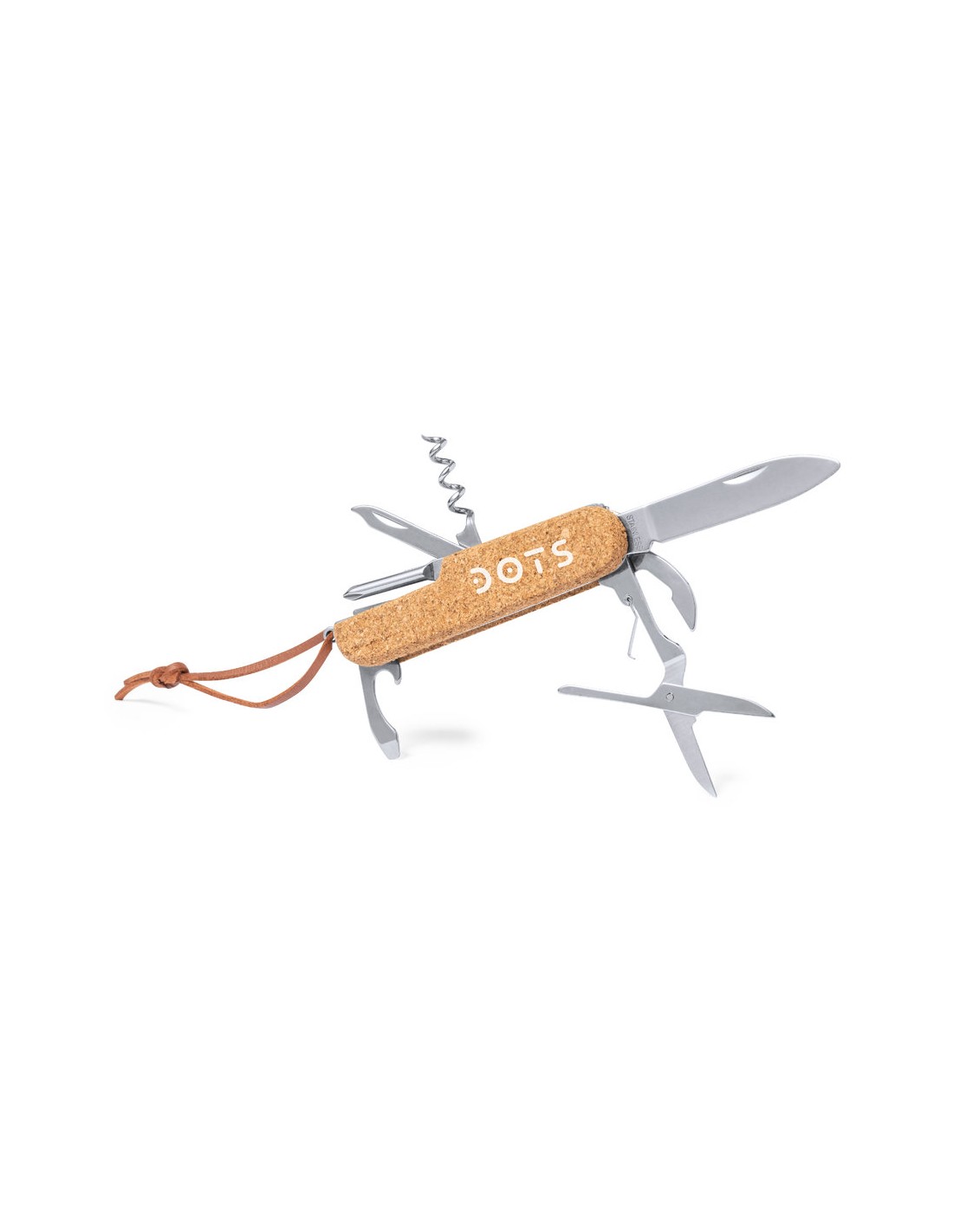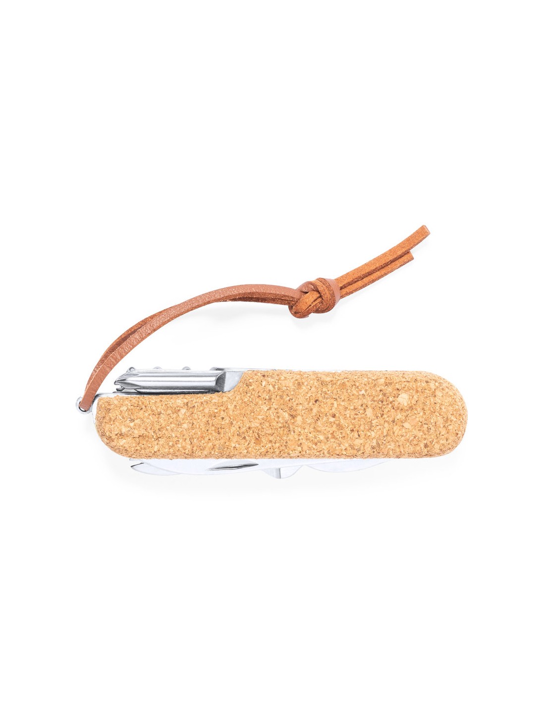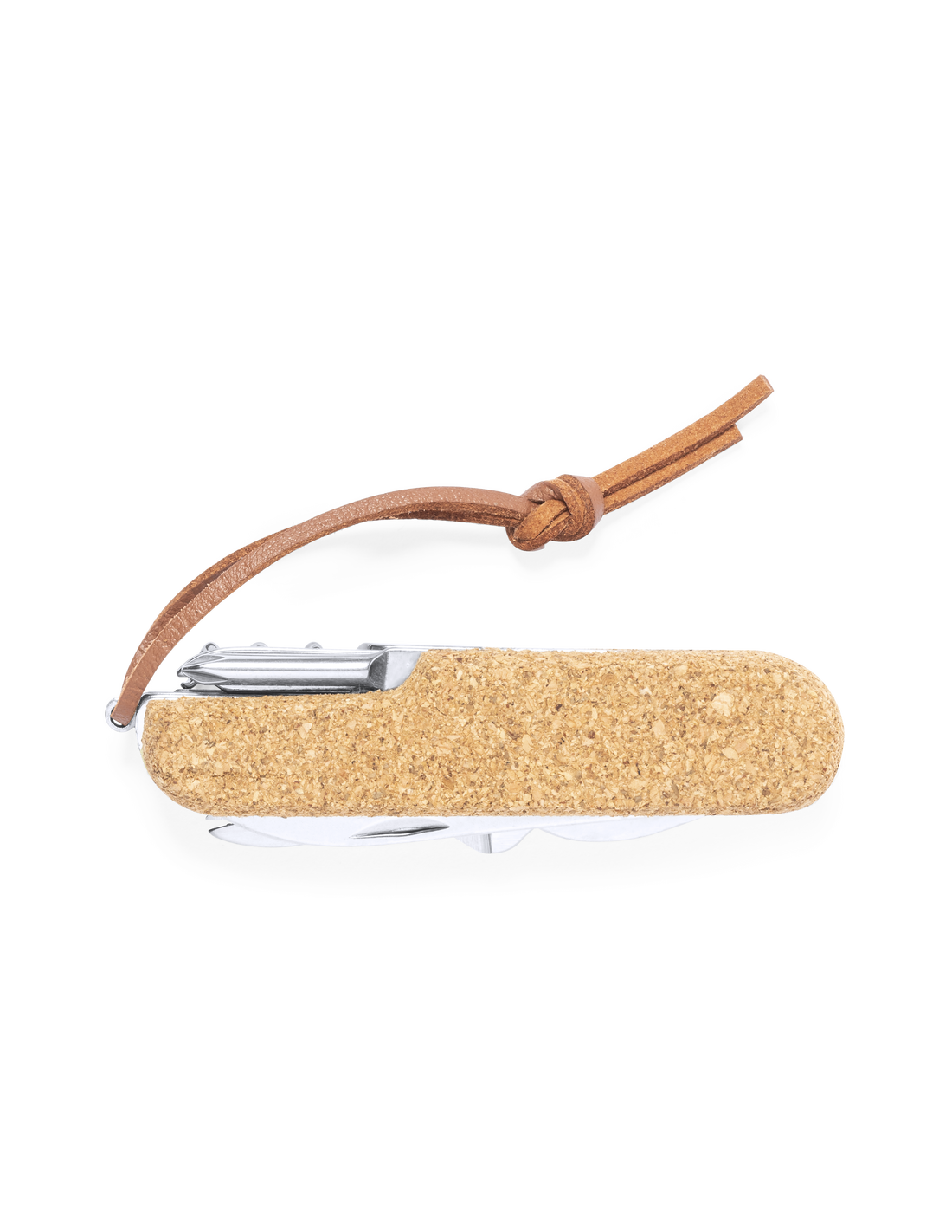 Navaja multiusos de línea nature, con resistente cuerpo en acero inox y empuñadura de corcho natural. Con 9 funciones entre otras, navaja, abridor, tijeras, lima, destornillador con puntas plana y philips, sacacorchos… Cordón a juego en polipiel y presentada en caja individual de diseño kraft.