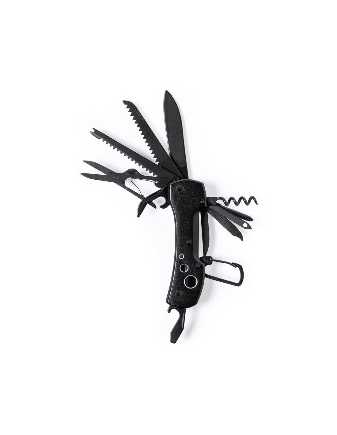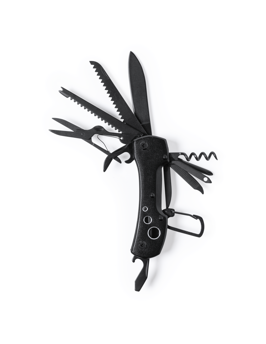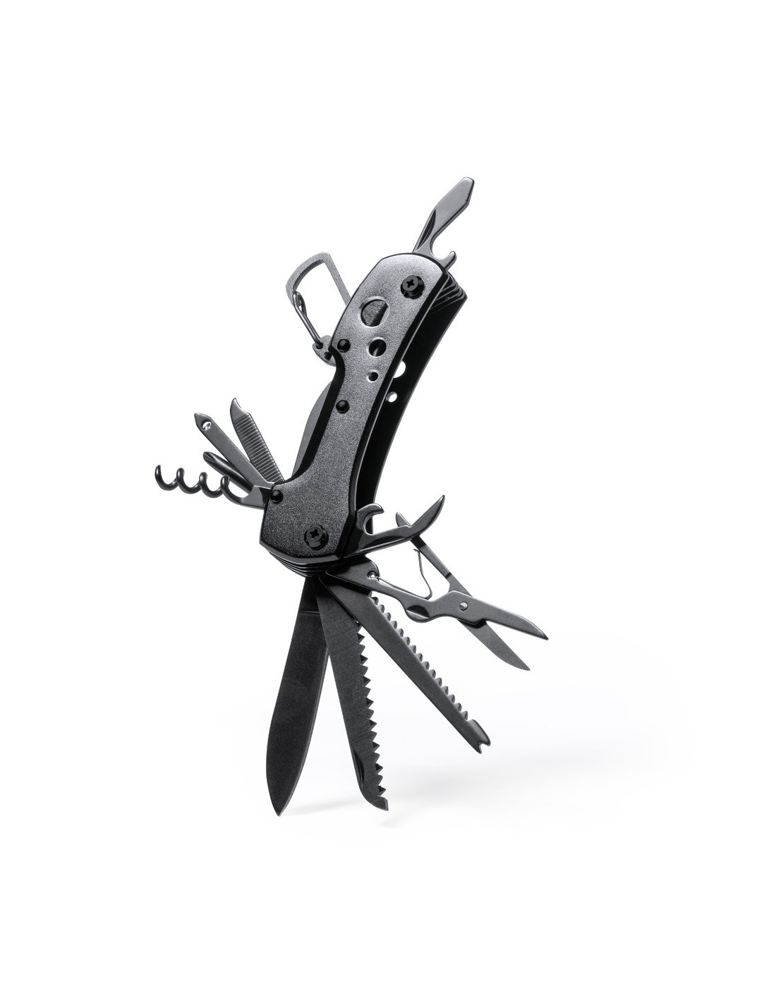 Navaja multiusos con accesorios en acero inox de acabado negro y resistente empuñadura a juego en aluminio, con mosquetón integrado en mango. 13 funciones, entre ellas cuchillo y navaja destornillador, lima abridor y tijeras. Plegable y de tamaño compacto, presentada en caja individual de diseño negra.