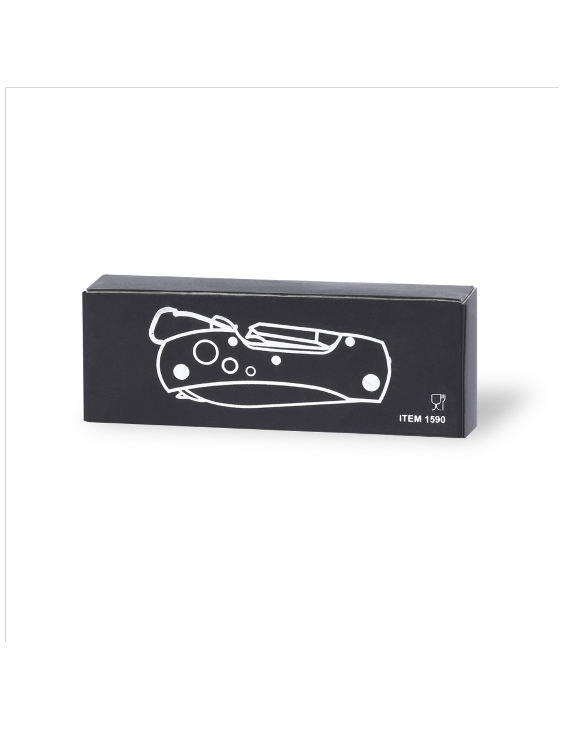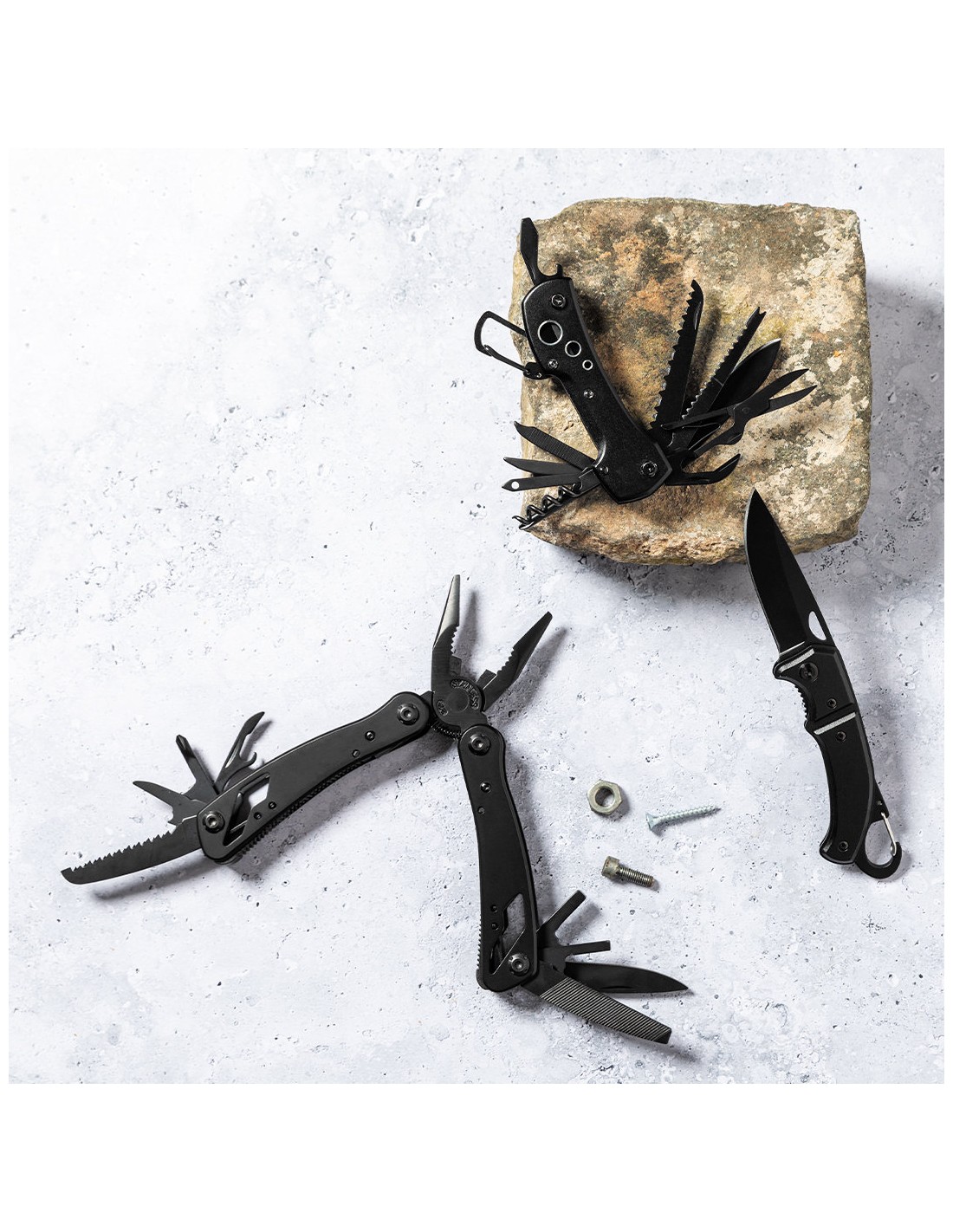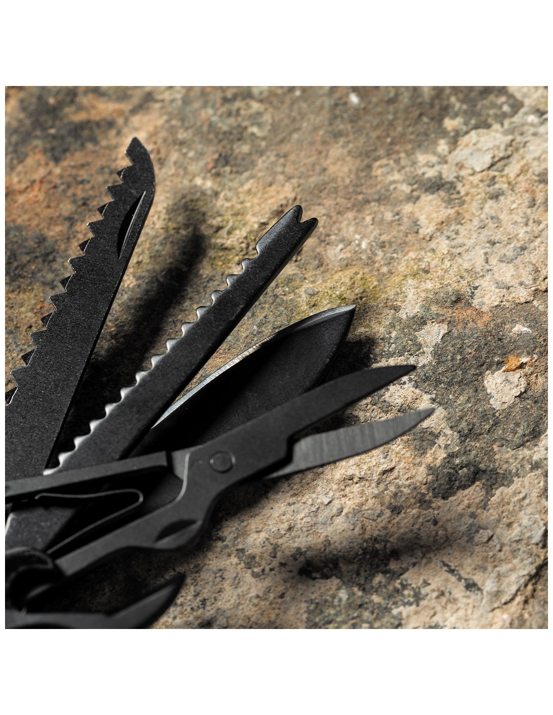 Navaja multiusos con accesorios en acero inox de acabado negro y resistente empuñadura a juego en aluminio, con mosquetón integrado en mango. 13 funciones, entre ellas cuchillo y navaja destornillador, lima abridor y tijeras. Plegable y de tamaño compacto, presentada en caja individual de diseño negra.