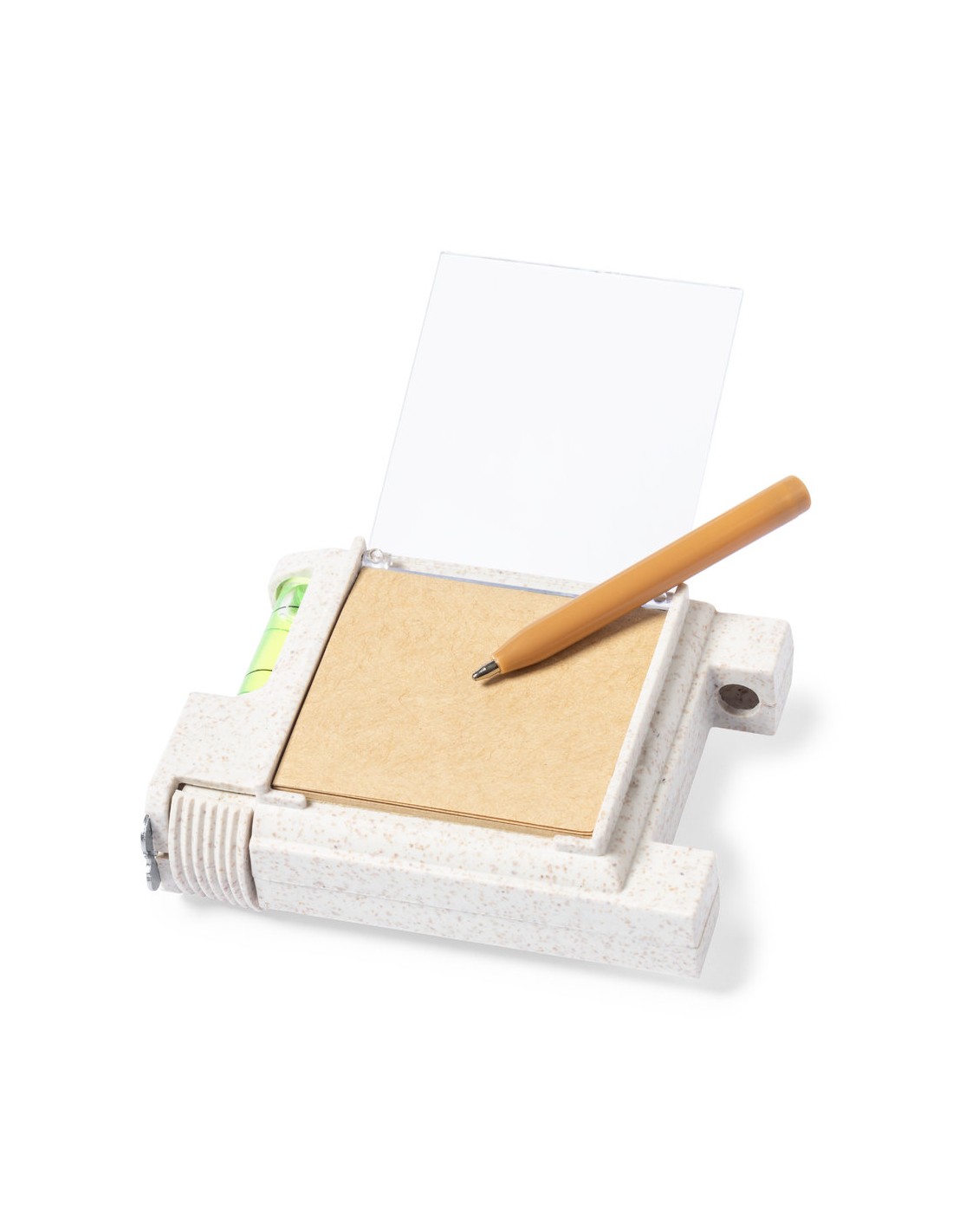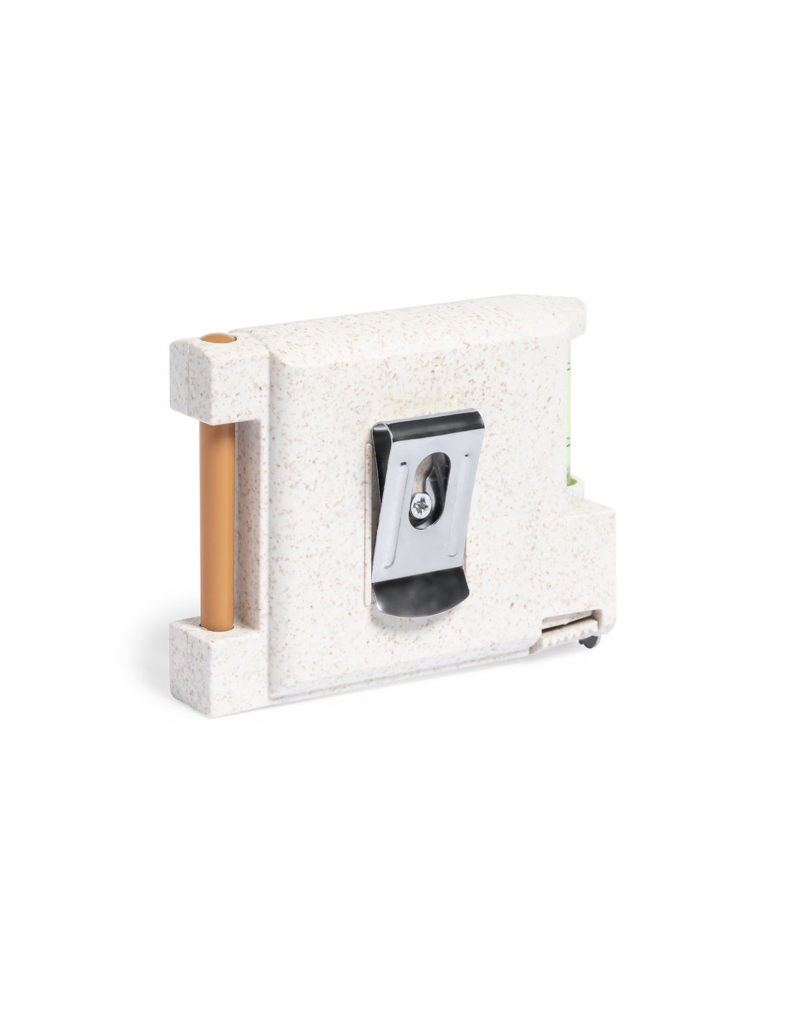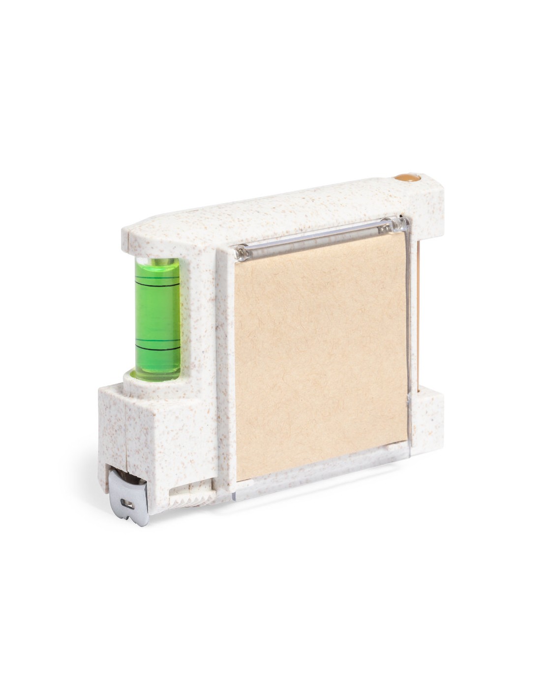 Flexómetro 3 m multifunción de línea nature, con carcasa fabrcada en caña de trigo. Con nivel integrado, soporte para bolígrafo (bolígrafo incluido) y bloc con 12 notas adhesivas en color natural. Con freno, clip metálico para cinturón y hoja con medidas en centímetros y pulgadas. Presentación en caja individual de diseño kraft.La caña de trigo fomenta la utilización de materias primas naturales, reduciendo así las emisiones contaminantes.