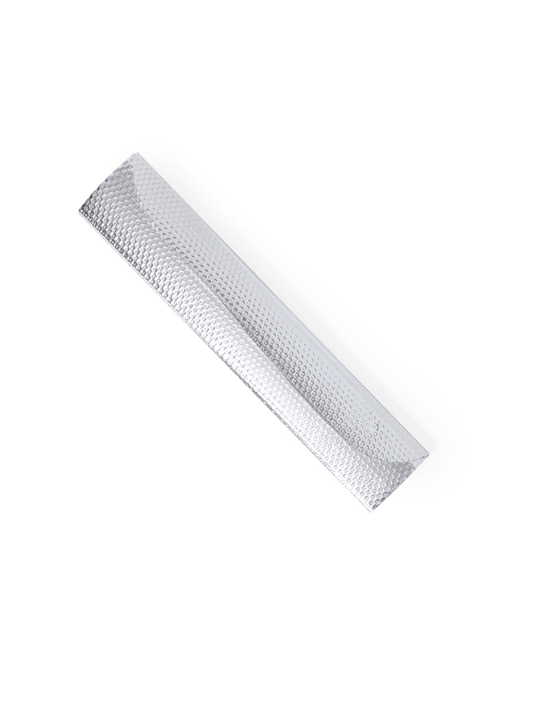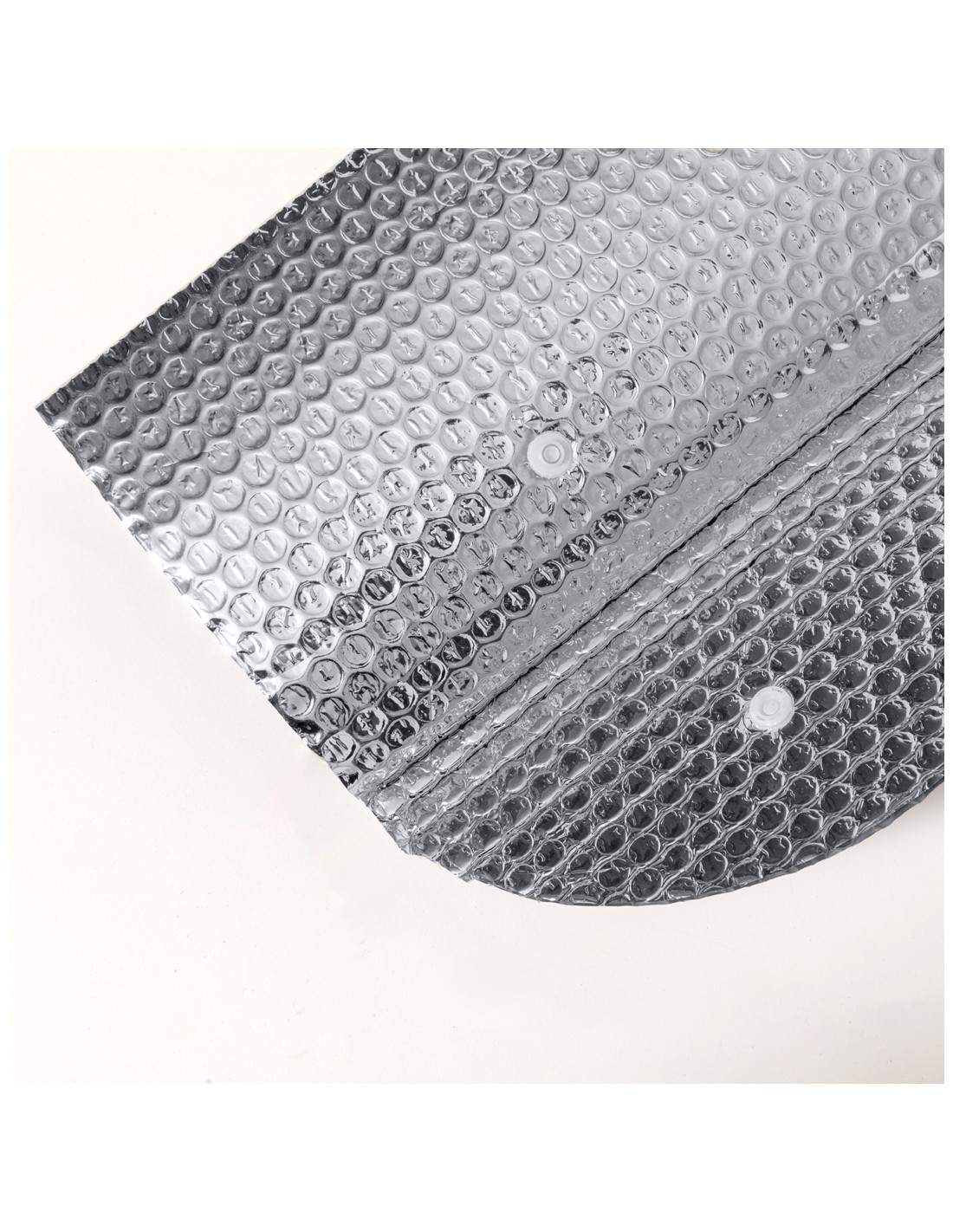 Parasol en aluminio con burbuja en ambas caras y de tamaño 130x70 cm. Acabado plateado metalizado, con original diseño sin ribetes. Fácil y rápido de plegar, con cierre de corchete. Presentación desplegado en plancha para una óptima impresión, con bolsas aparte.