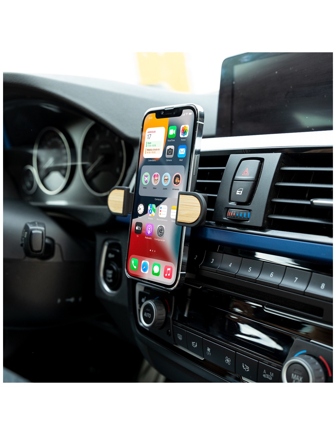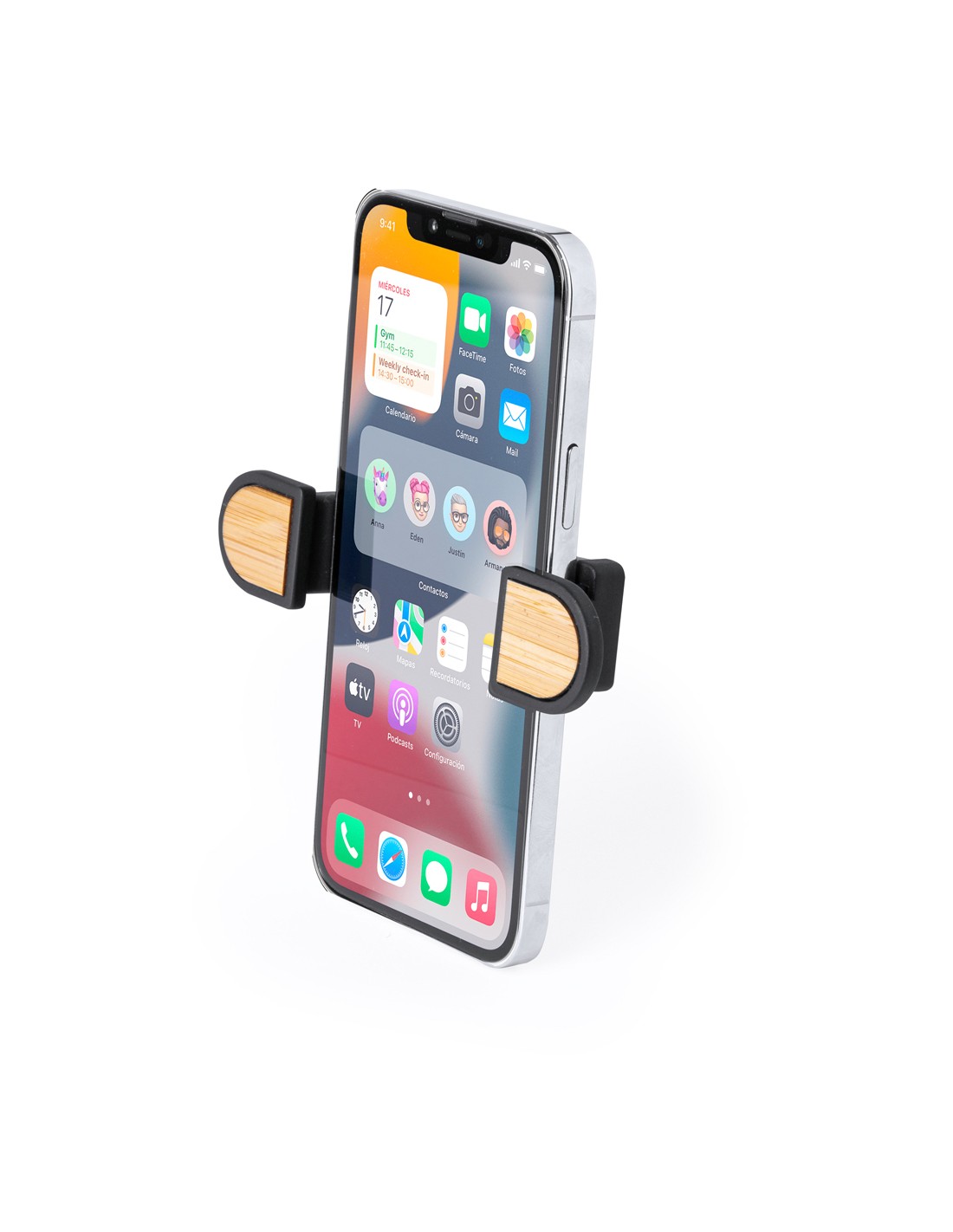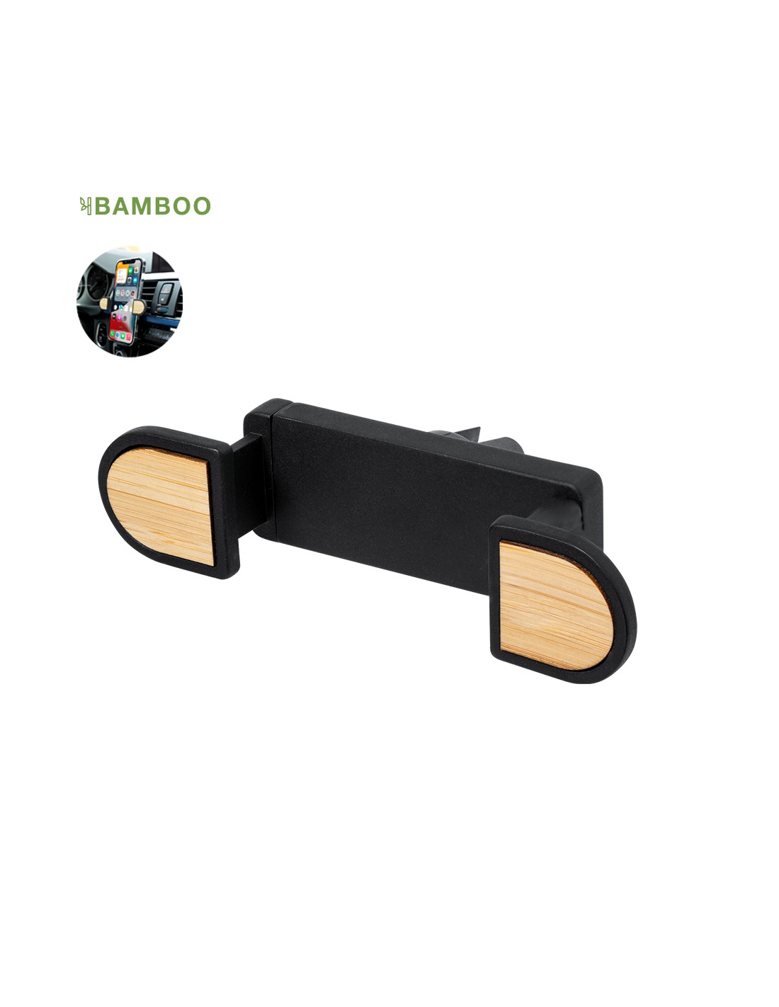 Soporte ajustable para smartphone de diseño minimalista, con base rotatoria 360º y de elegante acabado en color negro con detalles en bambú. Con sistema de fijación en rejilla de ventilación del automóvil y amplia superficie de marcaje, diseñado especialmente para tampografía. Presentado en caja de diseño kraft. Materiales como el bambú fomentan la utilización de materias primas naturales, reduciendo las emisiones contaminantes. Proviene de una planta de gran resistencia y versatilidad, con crecimiento y regeneración rápidos, siendo una excelente alternativa al uso de madera tradicional.