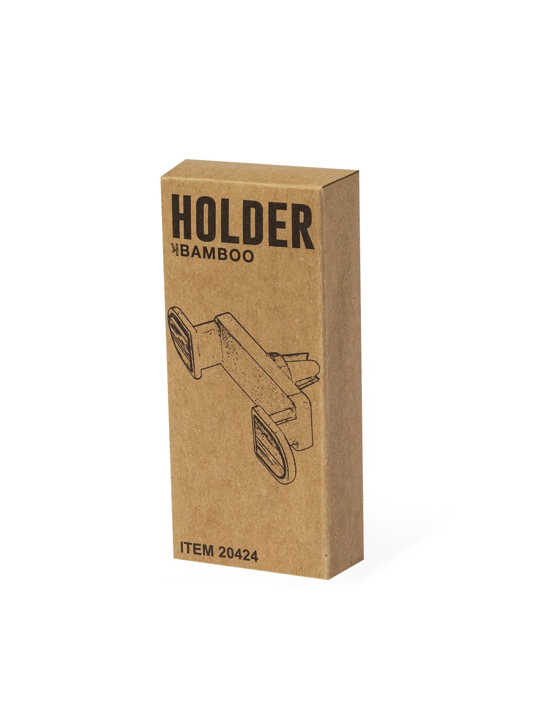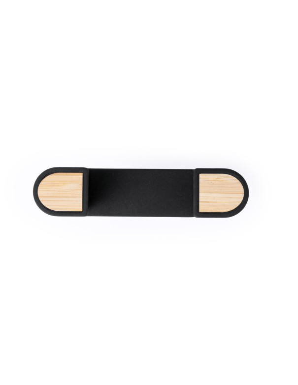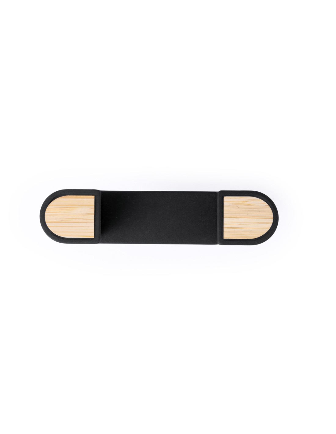 Soporte ajustable para smartphone de diseño minimalista, con base rotatoria 360º y de elegante acabado en color negro con detalles en bambú. Con sistema de fijación en rejilla de ventilación del automóvil y amplia superficie de marcaje, diseñado especialmente para tampografía. Presentado en caja de diseño kraft. Materiales como el bambú fomentan la utilización de materias primas naturales, reduciendo las emisiones contaminantes. Proviene de una planta de gran resistencia y versatilidad, con crecimiento y regeneración rápidos, siendo una excelente alternativa al uso de madera tradicional.