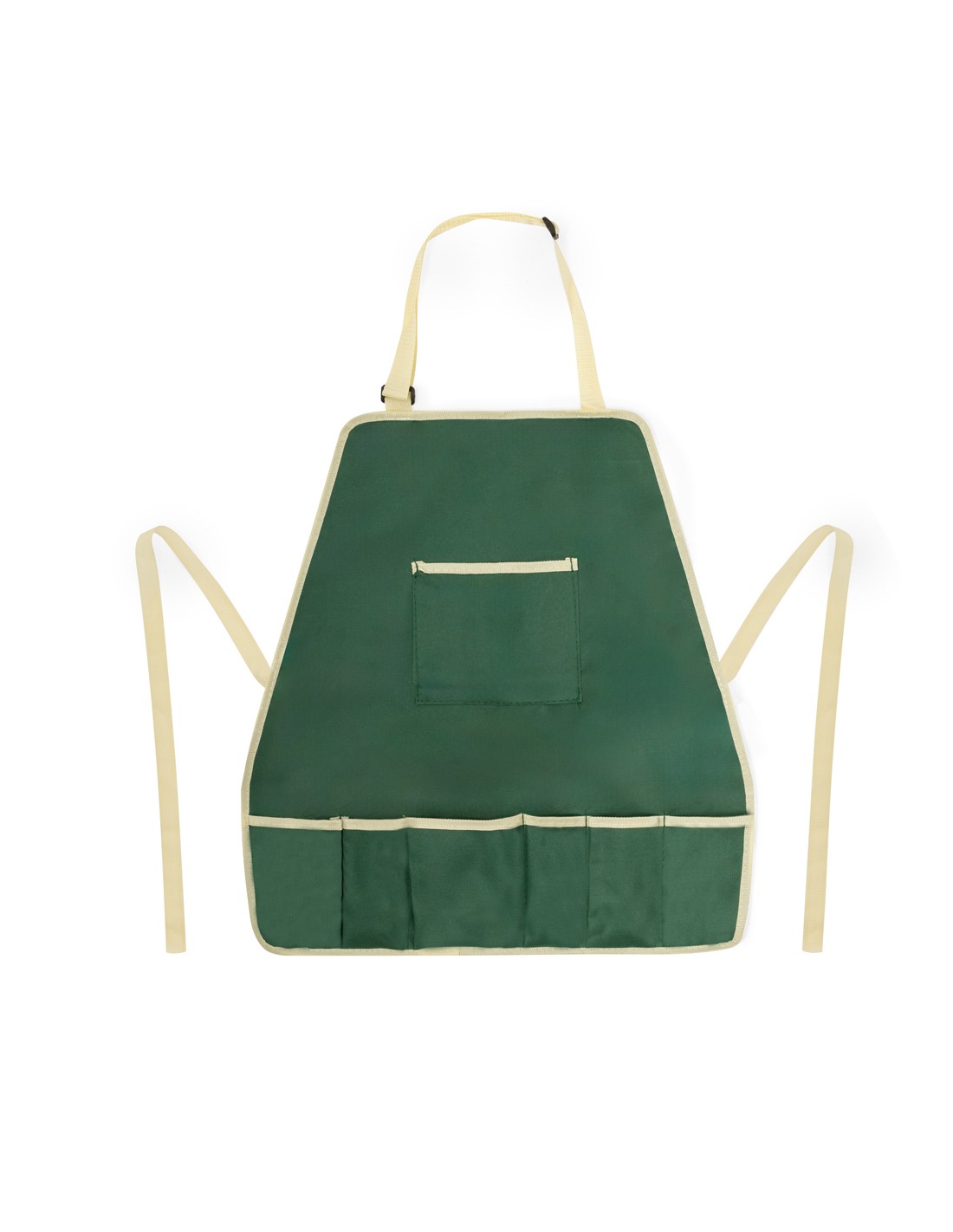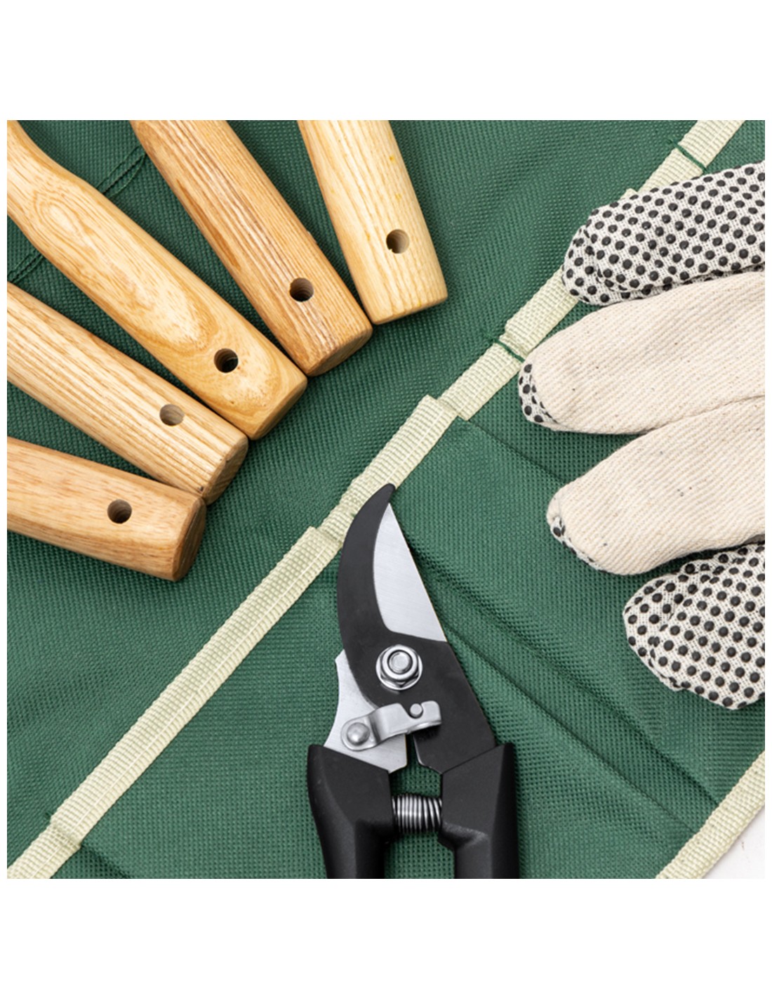 Completo set de jardinería con 7 accesorios y delantal ajustable con bolsillos. Incluye 2 palas de diferentes tamaños, dos rastrillos, un punzón, tijeras de podar y guantes para proteger las manos. Presentado en caja de diseño kraft.