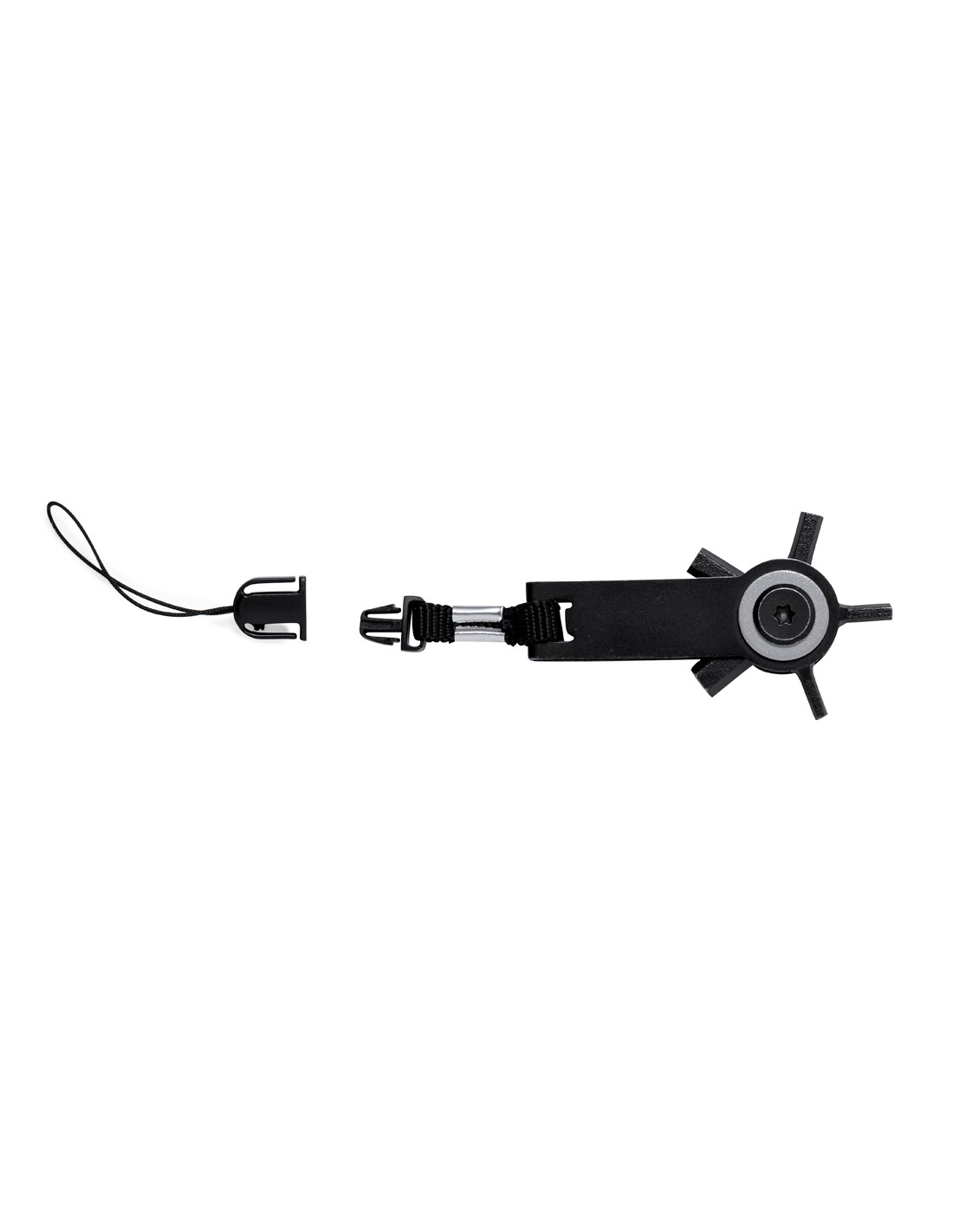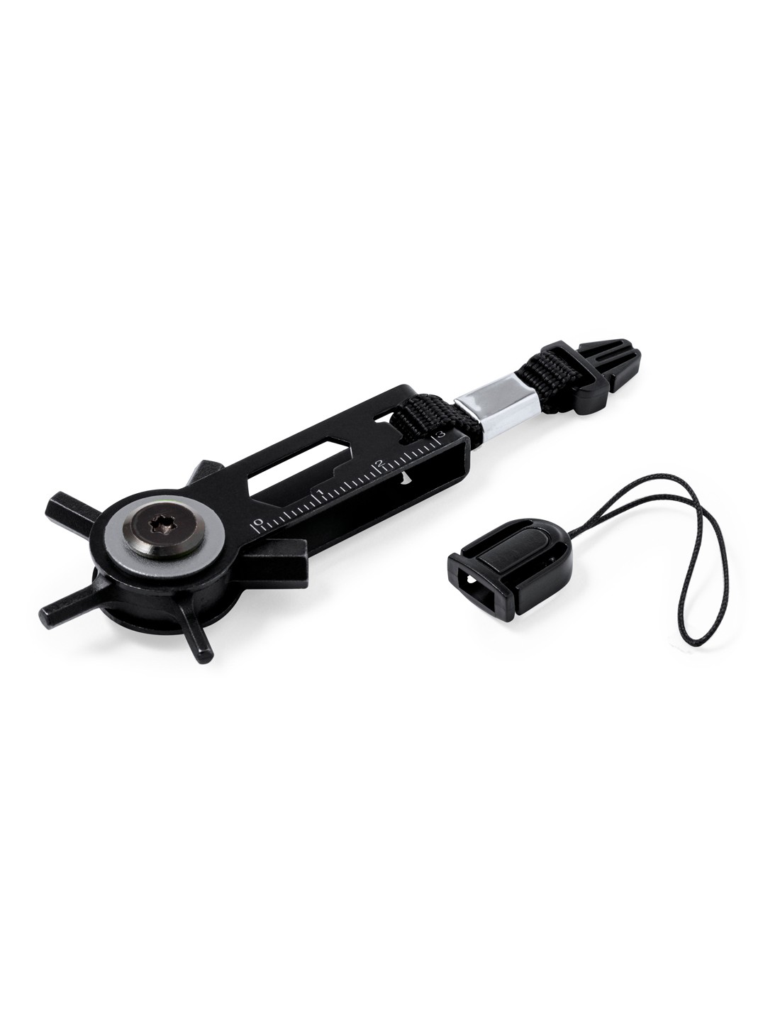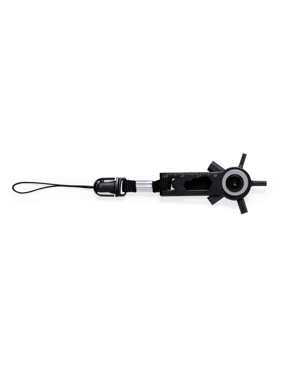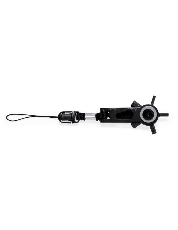 Eficaz multiherramienta con cabezal giratorio fabricada en acero inox y acabado en negro. Con 10 funciones: llaves allen, llave para tuercas hexagonales en varios tamaños, regla y un práctico accesorio de transporte con cierre de hebilla. Presentado en bolsa de papel reciclada de diseño kraft.