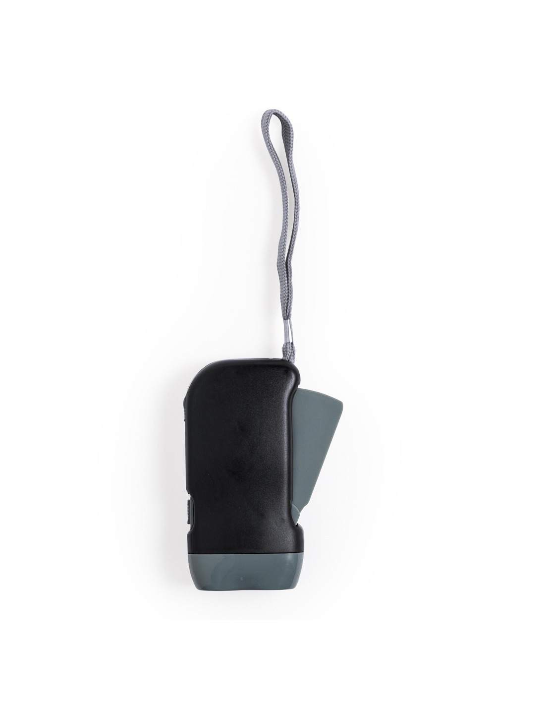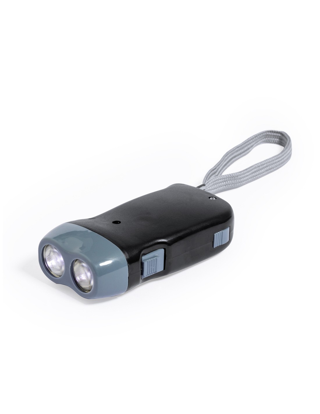 Linterna eco-amigable con 2 LEDs de carga manual mediante la dinamo incorporada; simplemente apretando el gatillo con una mano se genera energía, ofreciendo una fuente de luz sin generar residuos. En elegante color negro y gris, incluyeendo una cinta de transporte para mayor comodidad. Presentada en caja de diseño kraft.