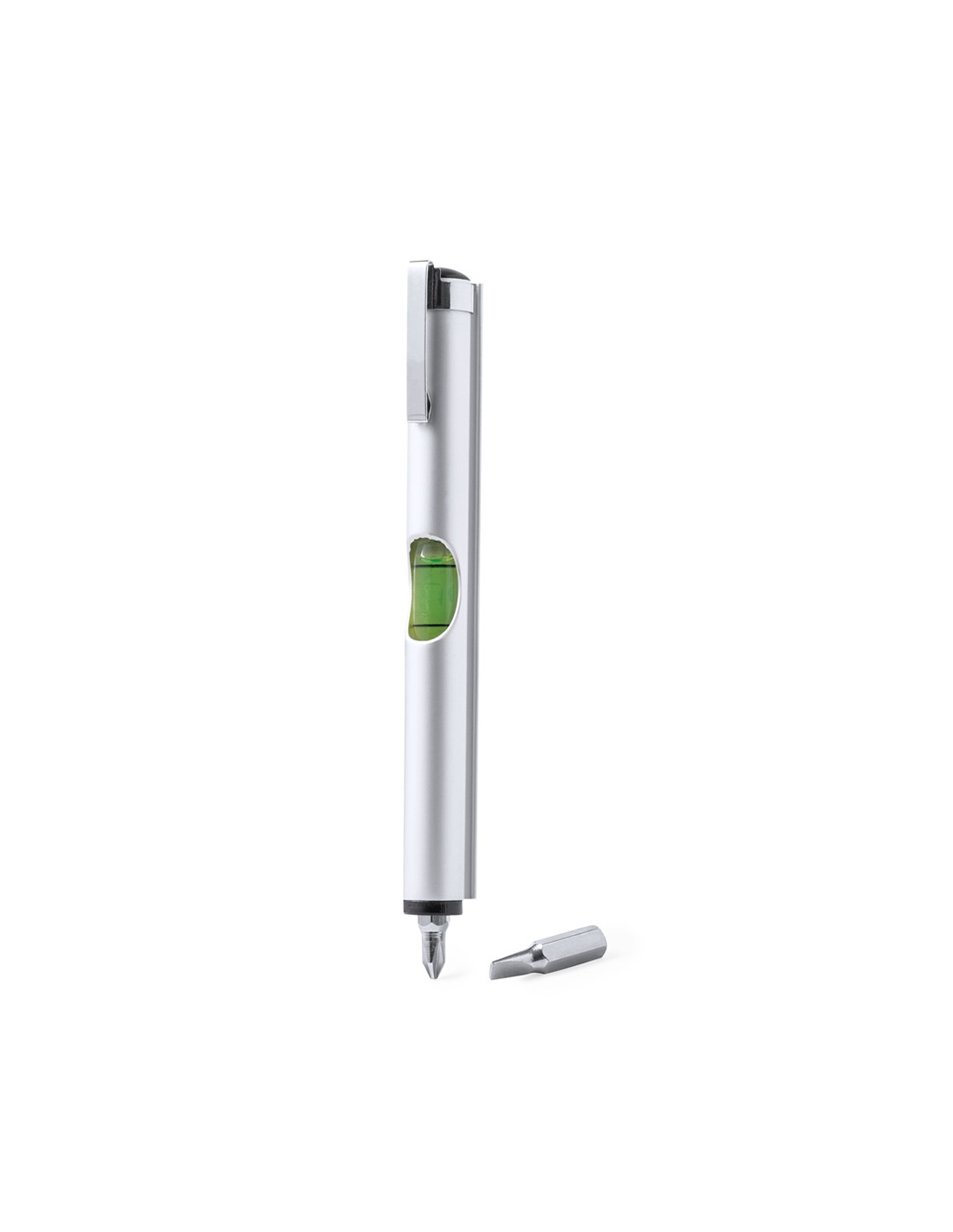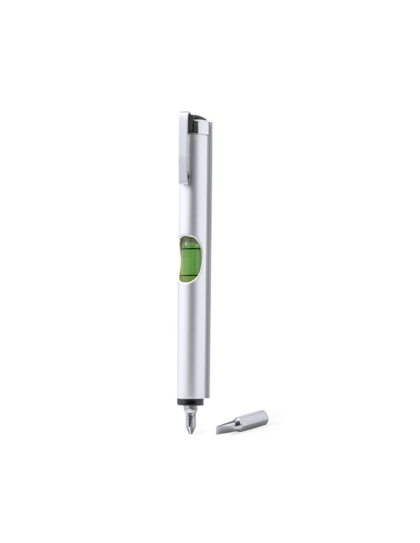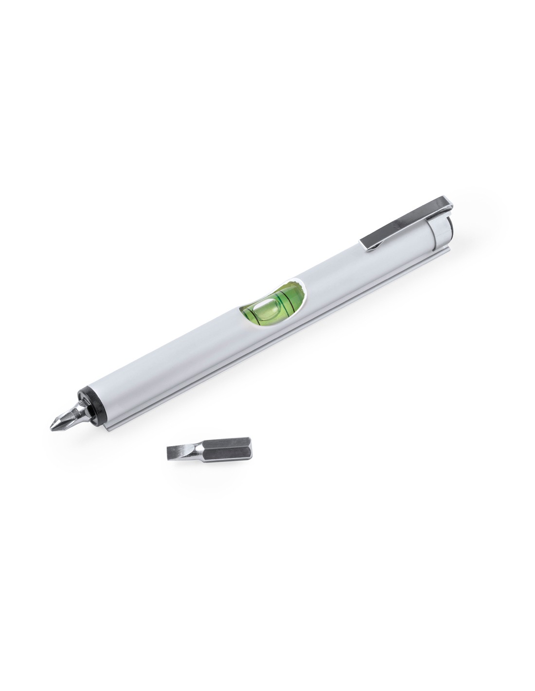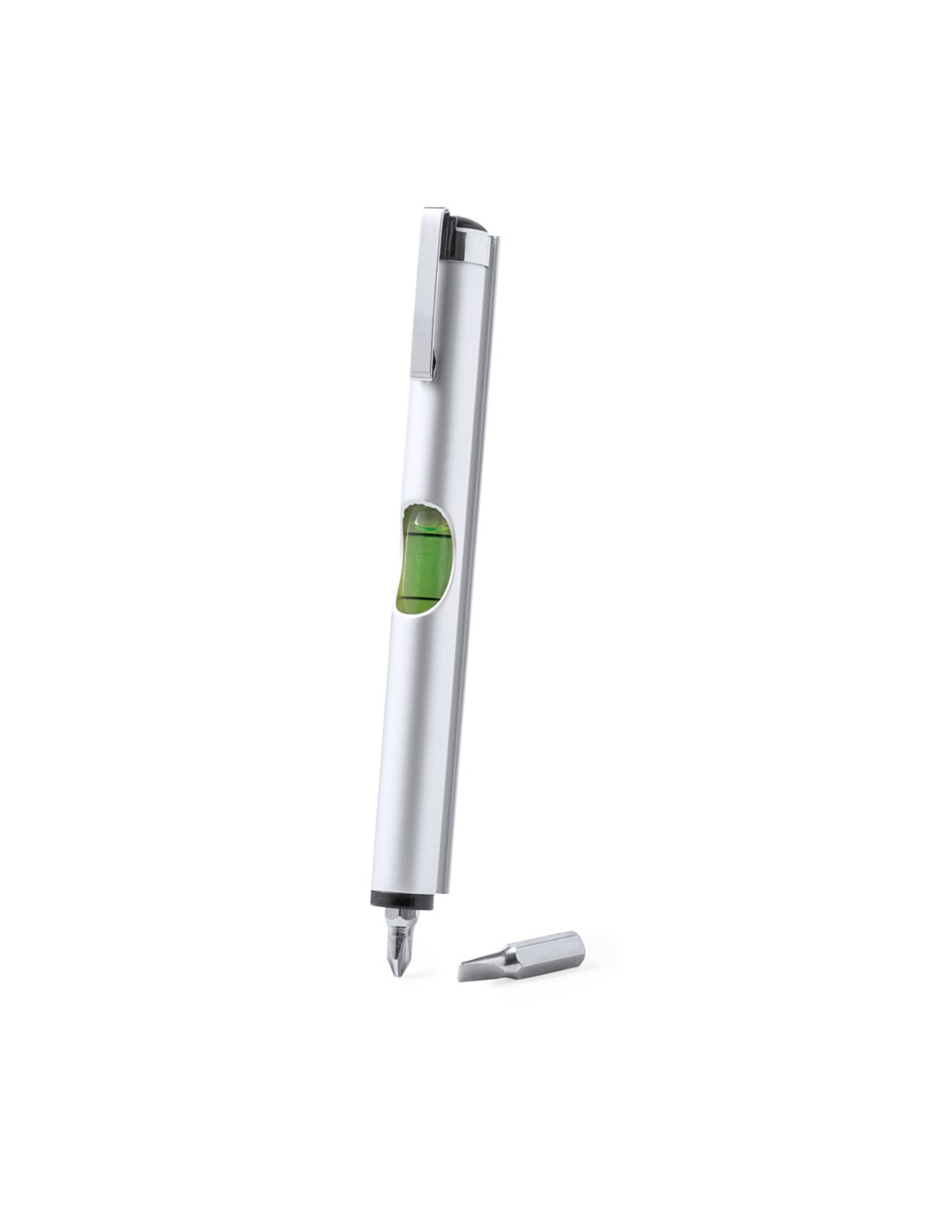 Práctica multiherramienta fabricada en aluminio, con nivel integrado en el cuerpo y dos cabezales para destornillador (plano y philips) en el interior. Con clip metálico de acabado cromado y presentada en caja de diseño kraft.