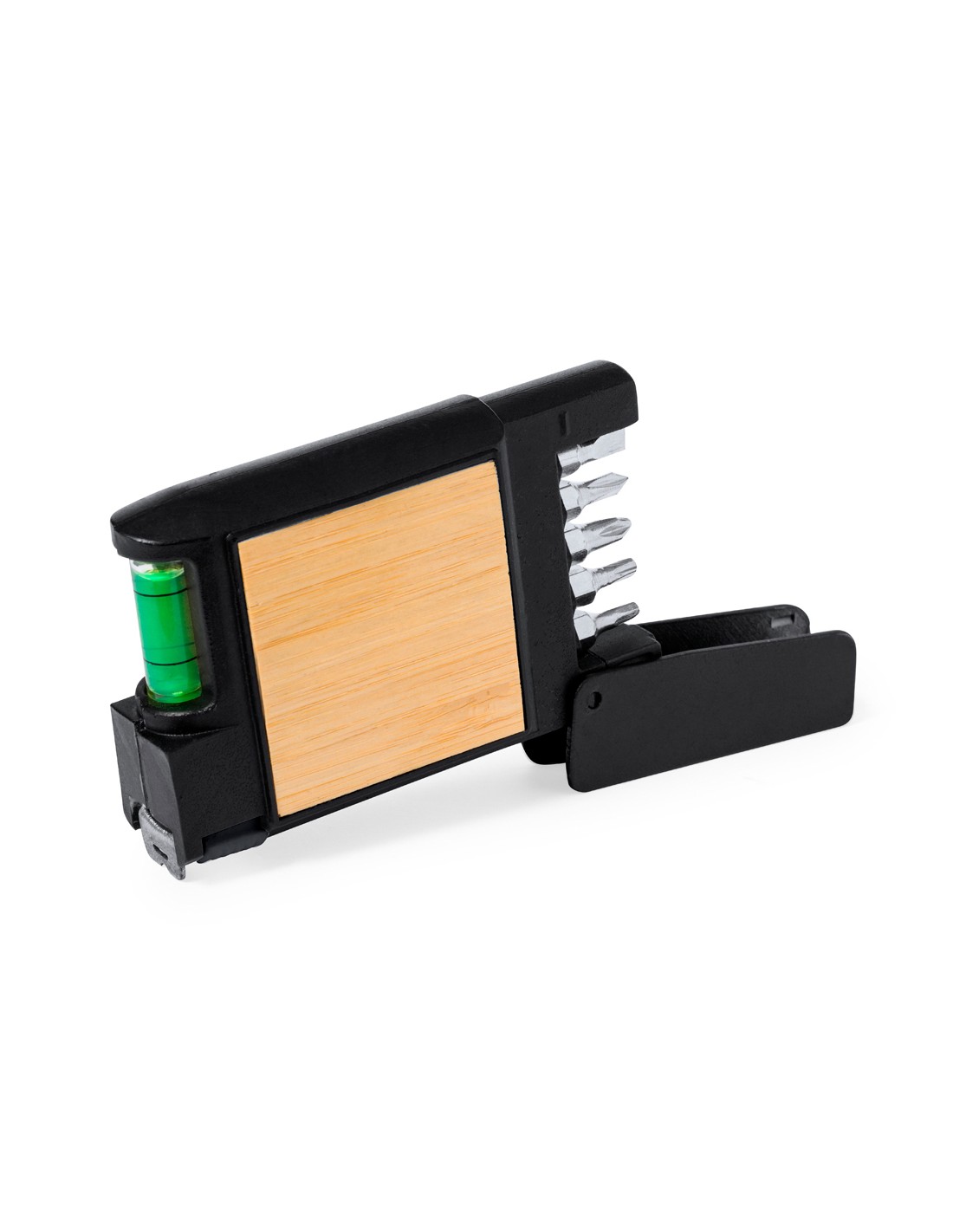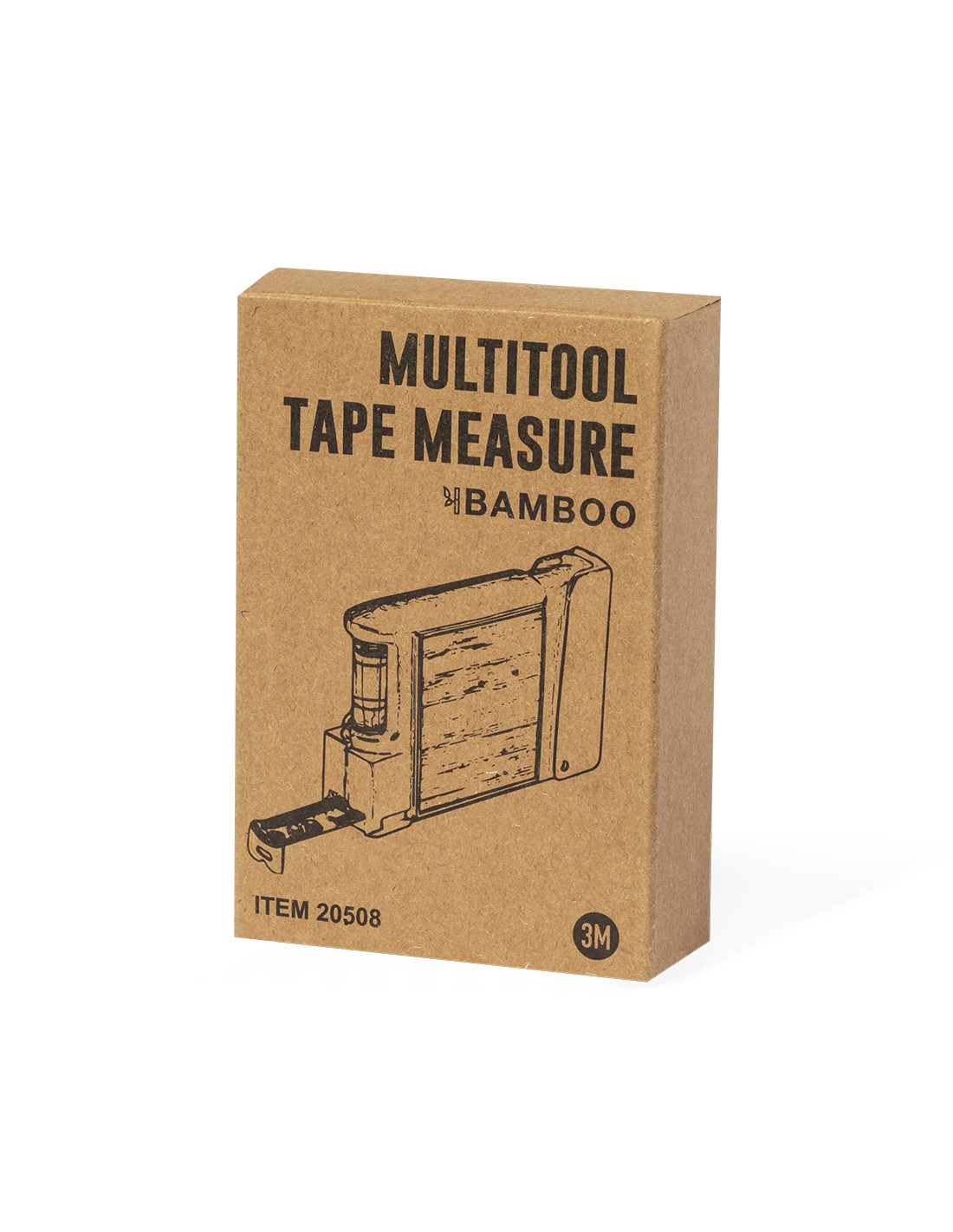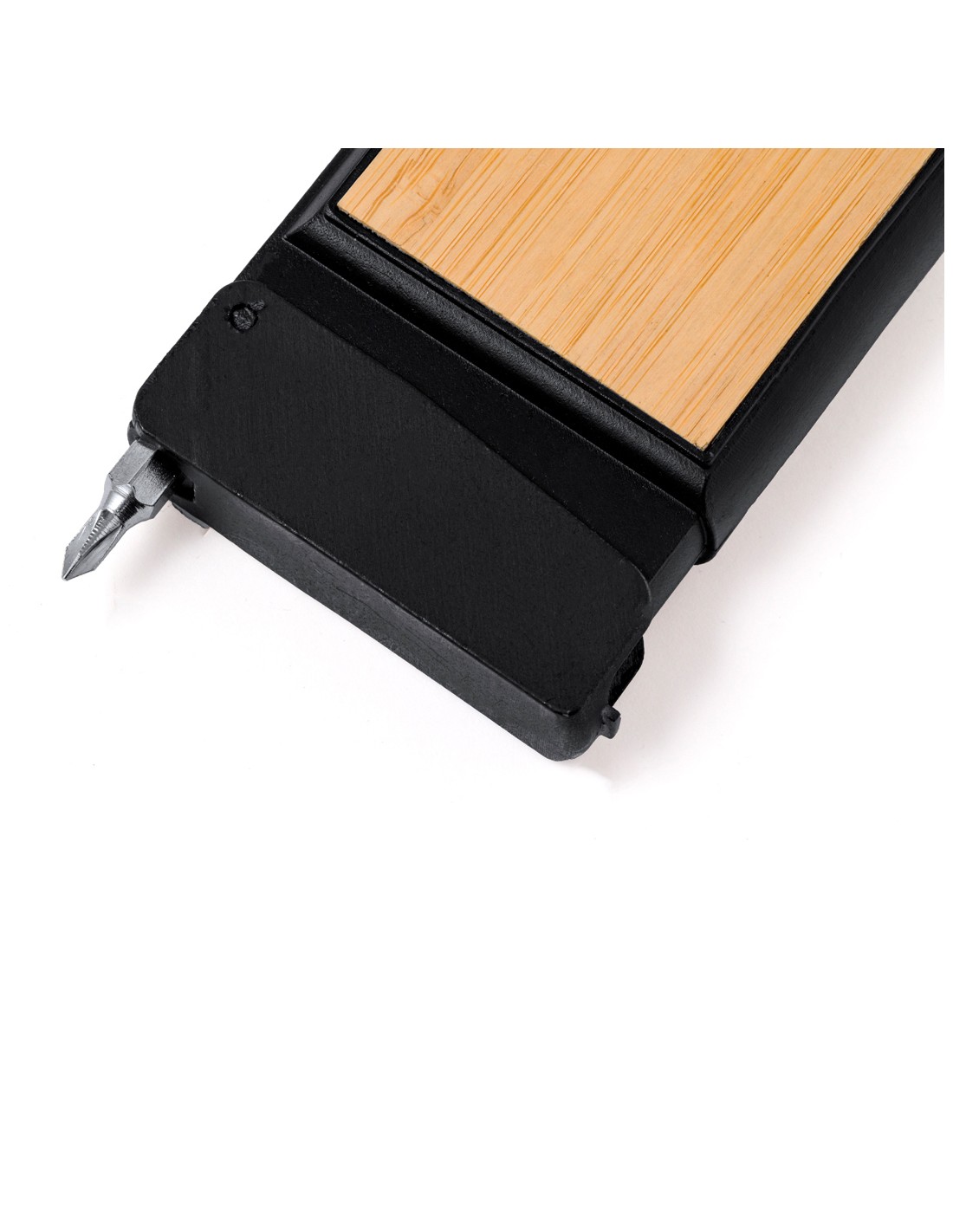Flexómetro multiherramienta 3m, fabricado en resistente combinación de bambú y ABS. Con 7 funciones: cinta métrica de 3 metros, destornillador con diversas puntas (planas, philips y allen); y nivel integrado. De elegante diseño en negro, con detalles en bambú y viene presentado individualmente en caja de diseño kraft.Materiales como el bambú fomentan la utilización de materias primas naturales, reduciendo las emisiones contaminantes. Proviene de una planta de gran resistencia y versatilidad, con crecimiento y regeneración rápidos, siendo una excelente alternativa al uso de madera tradicional.