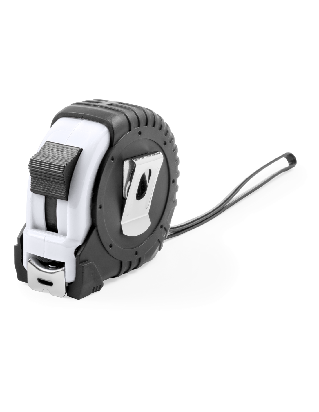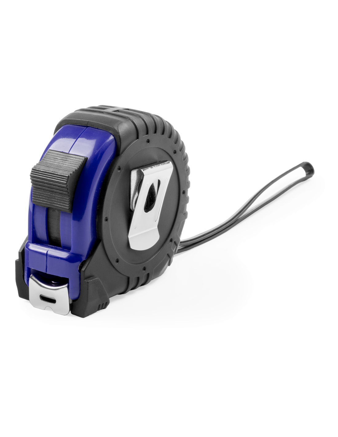 Flexómetro de 5 metros con cuchilla metálica y mecanismo de bloqueo. Con cuerpo de suave acabado en variados colores, recubierto con funda protectora de resistente goma, clip metálico para cinturón y cinta de transporte. Con troquelado especial para marcaje en doming/gota de resina y presentado en caja individual.