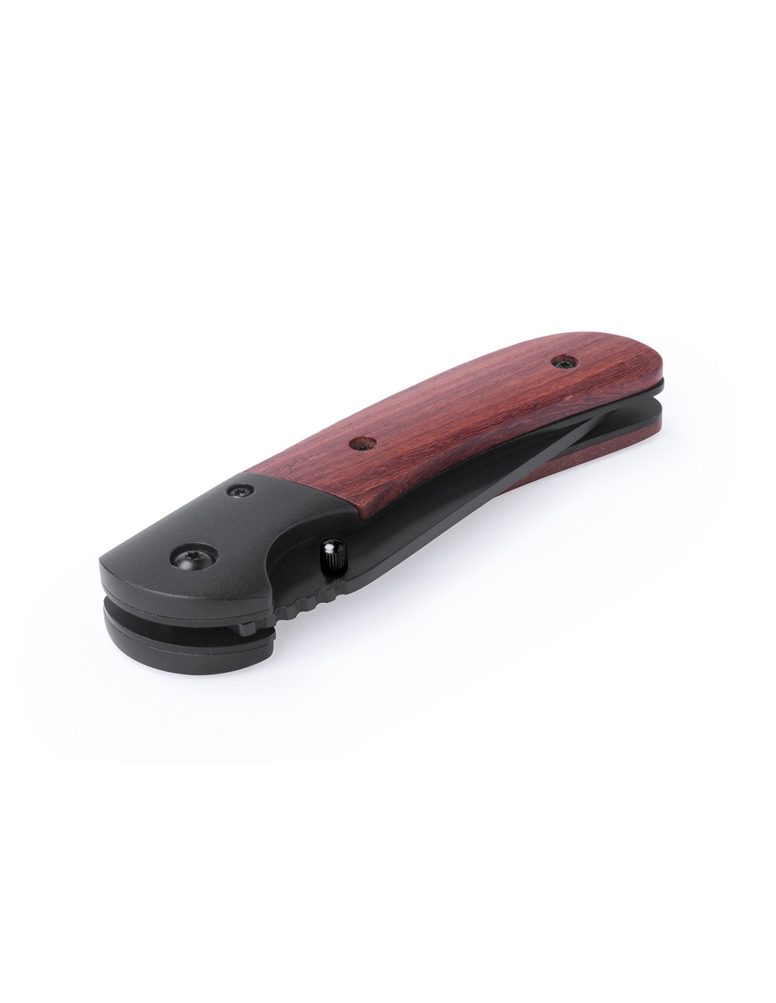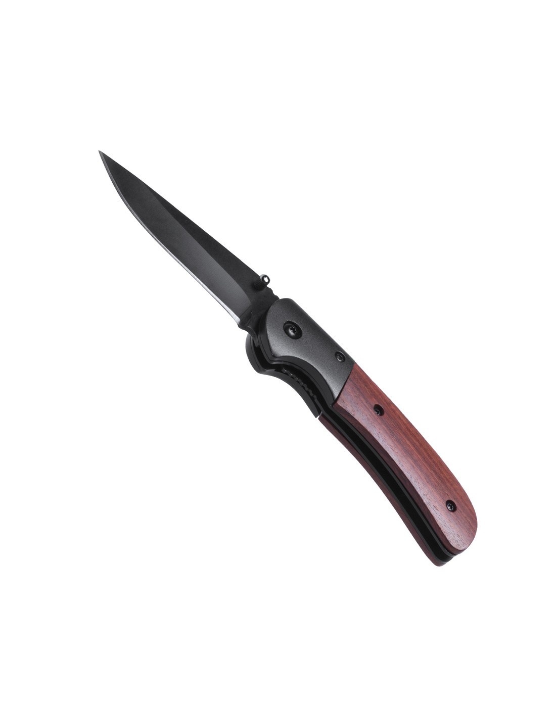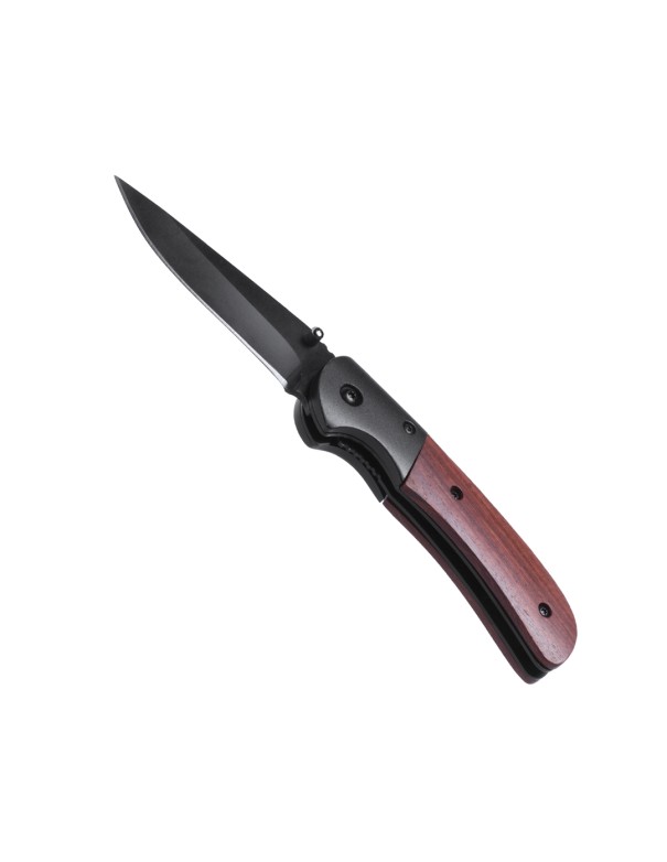 Navaja de alta calidad con hoja en acero inox de color negro y empuñadura en madera natural con bloqueo de seguridad. Presentada en caja individual.