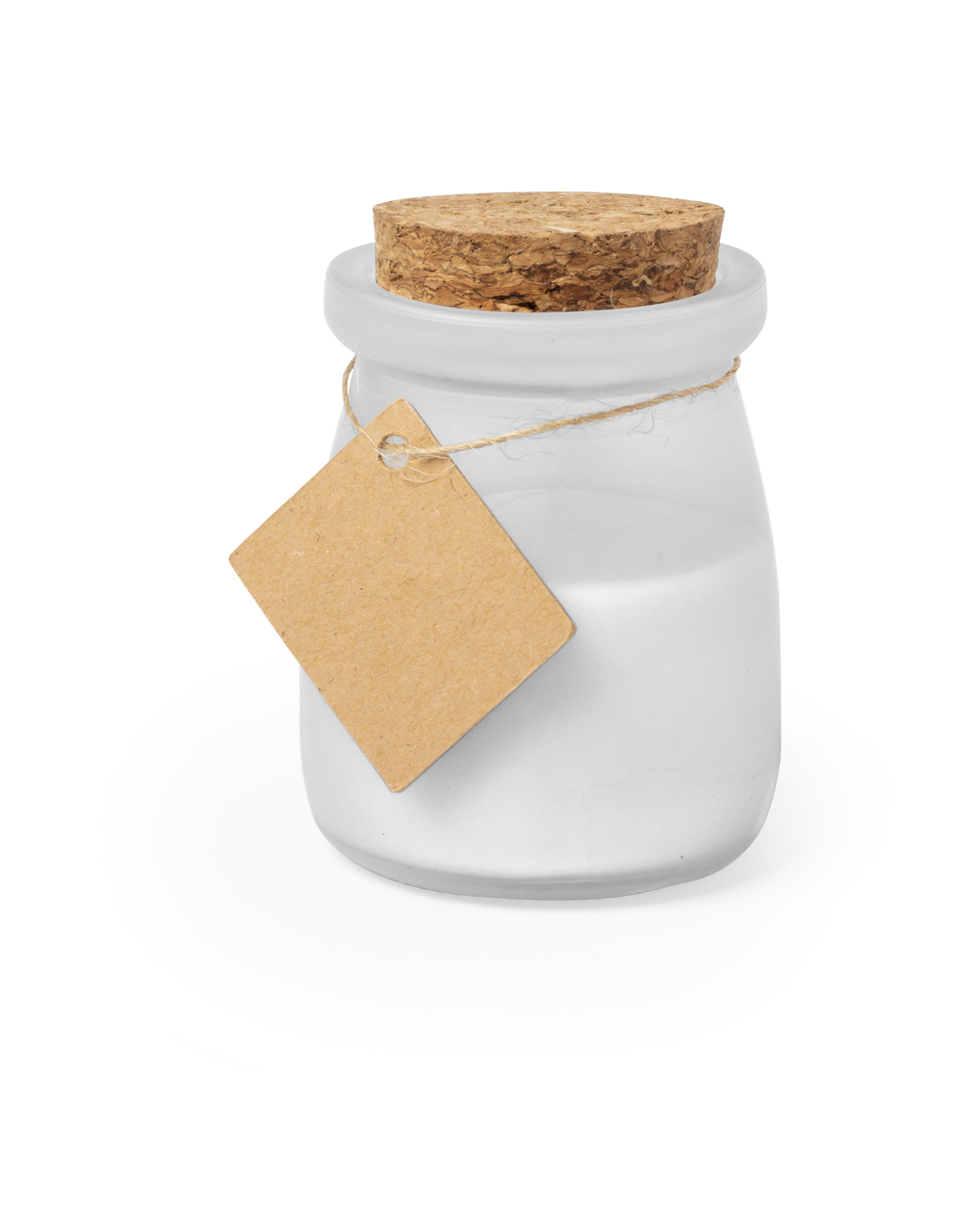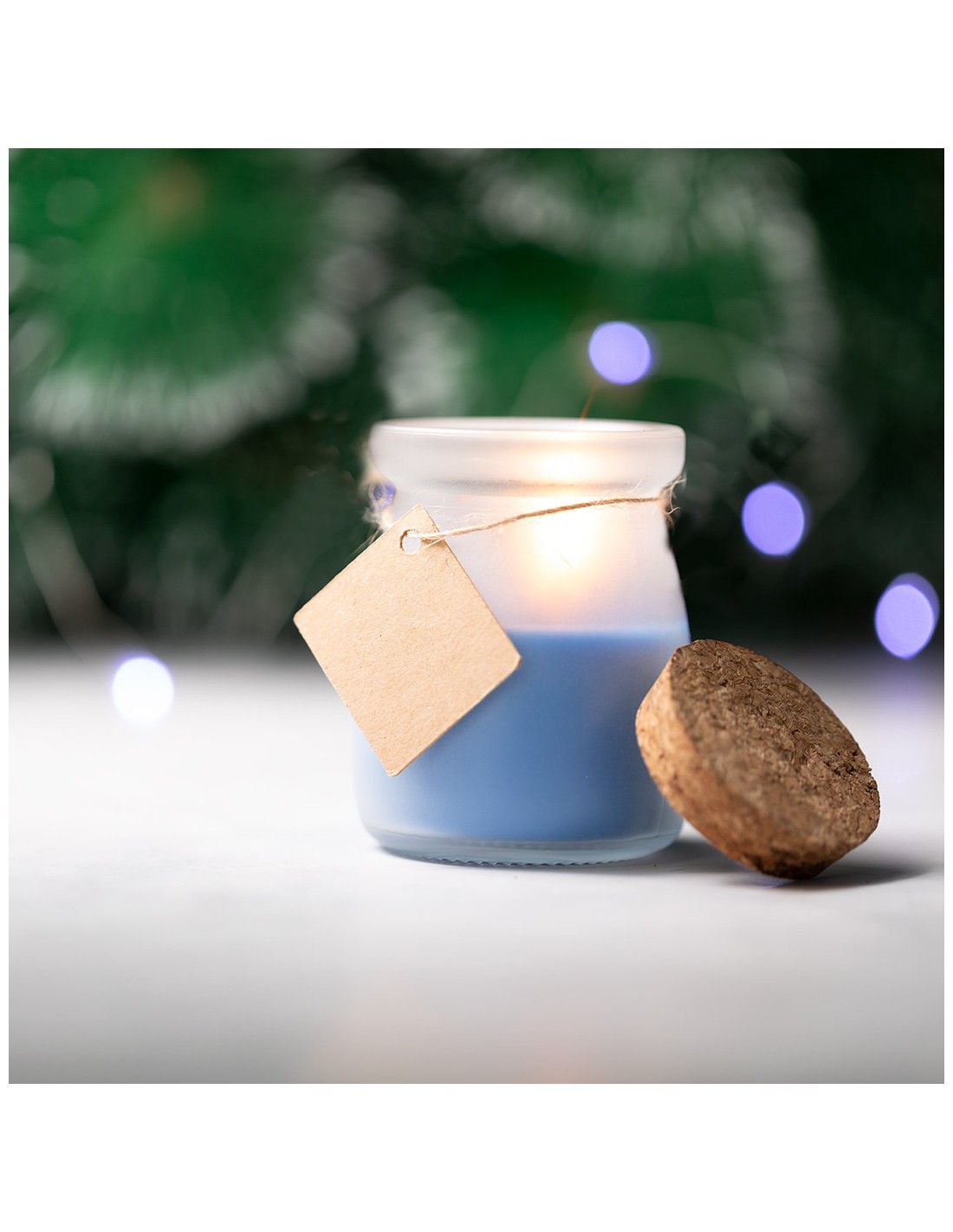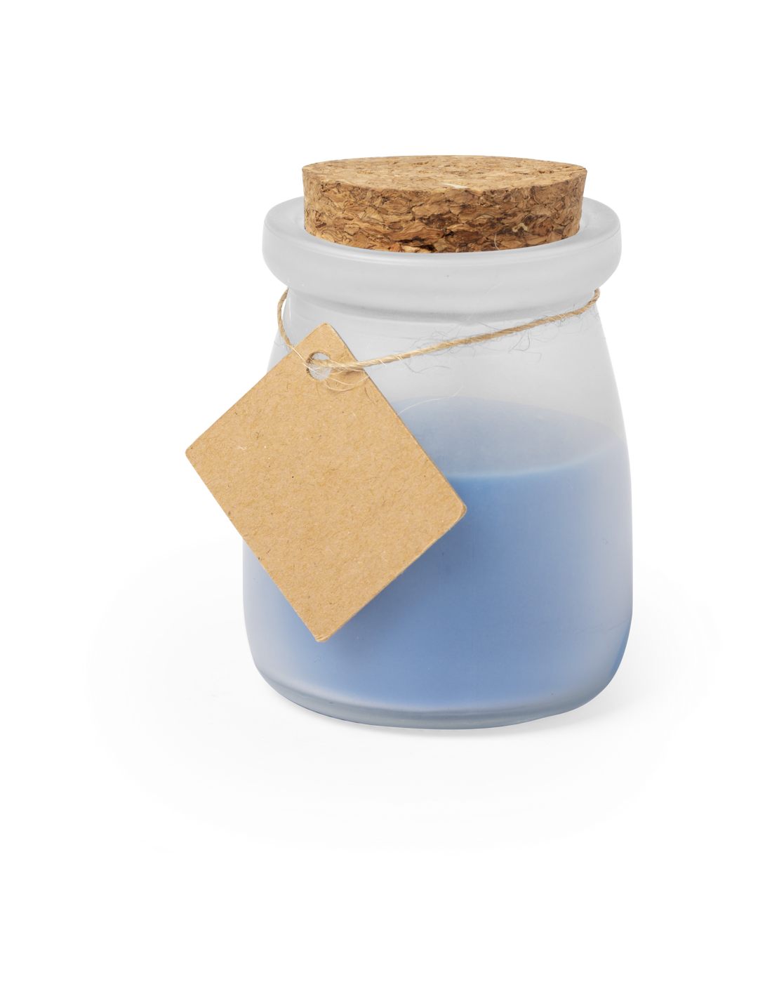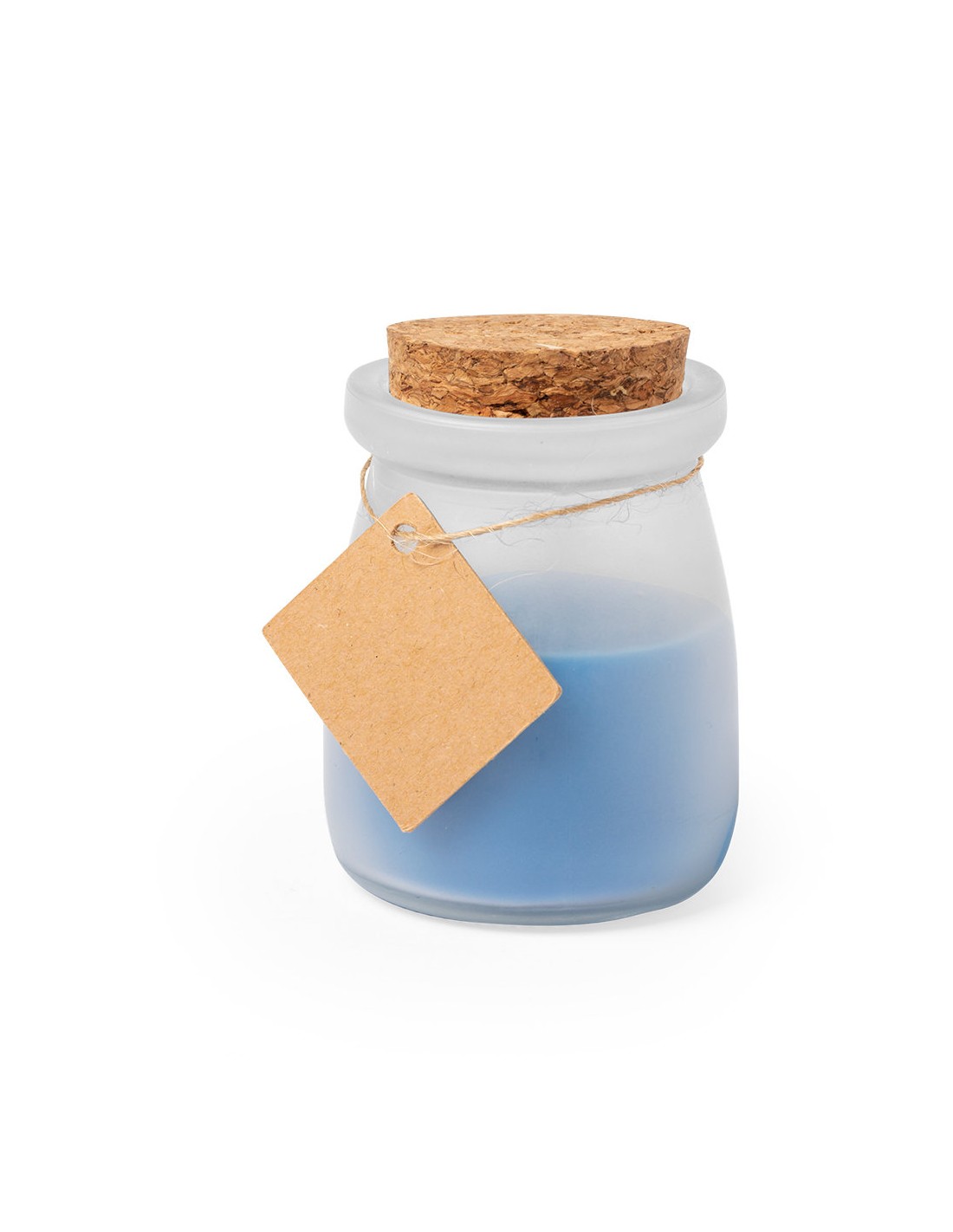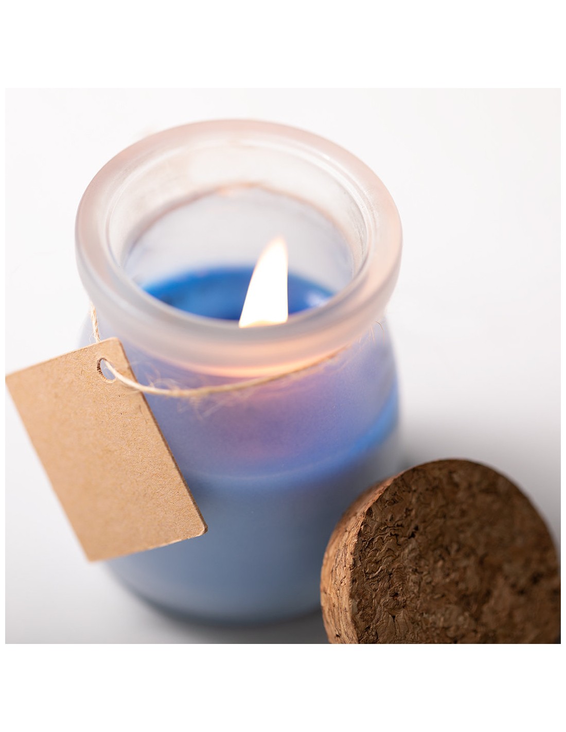 Original vela tarrito de cristal. Con tapón de corcho y etiqueta de cartón reciclado con hilo para mensajitos. Disponible en varios colores y presentada en caja blanca individual.