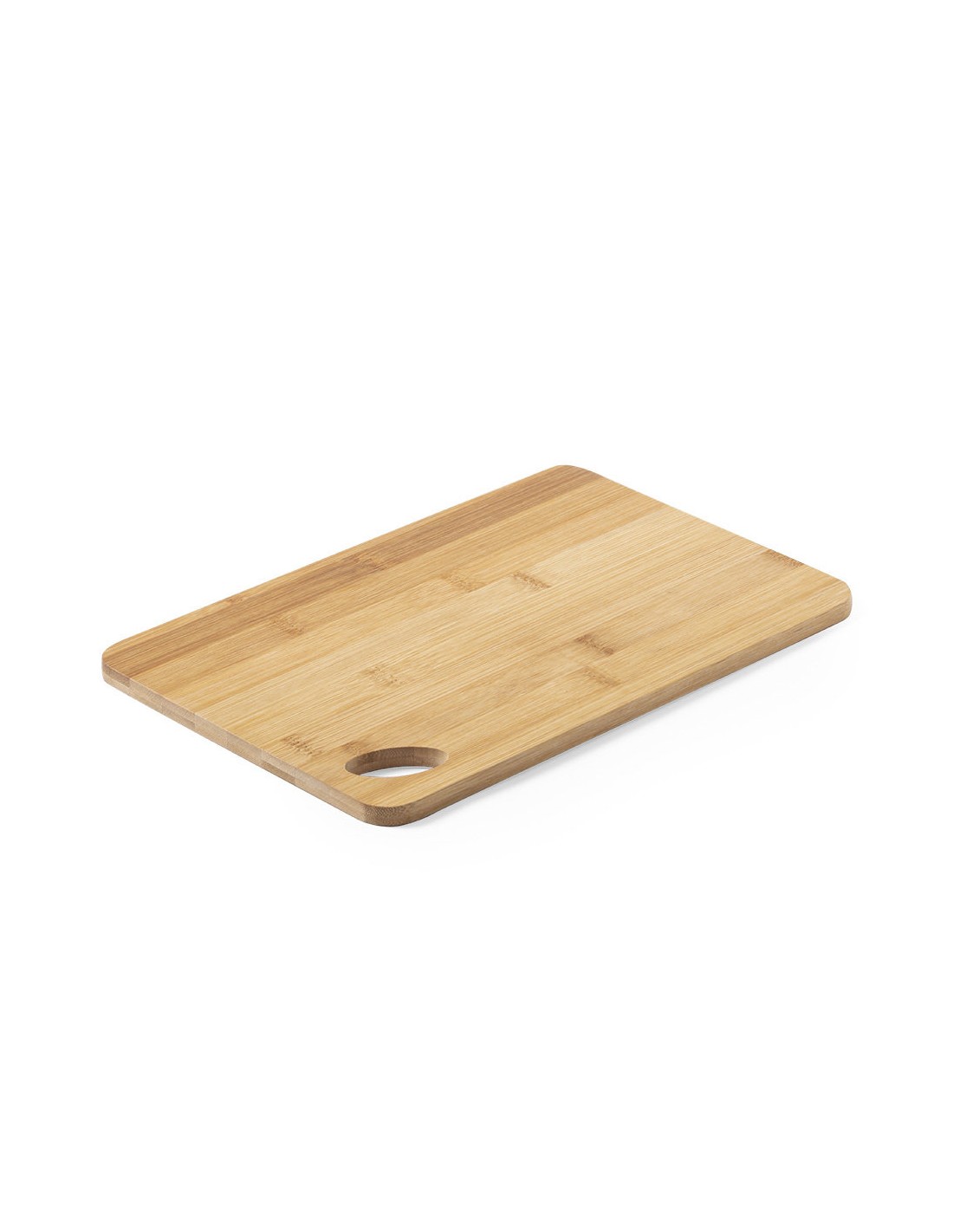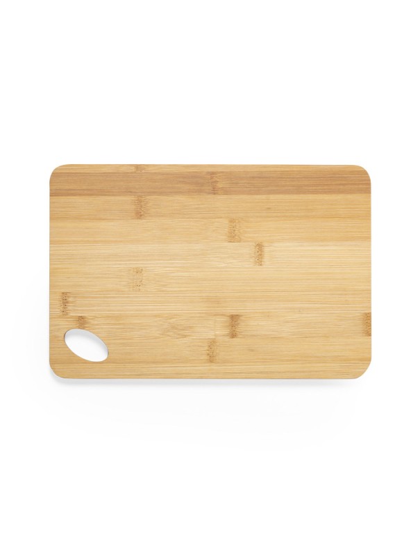 Tabla de línea nature fabricada en bambú pulido, ideal para corte y presentación, con troquel para fácil manejo y para colgar.