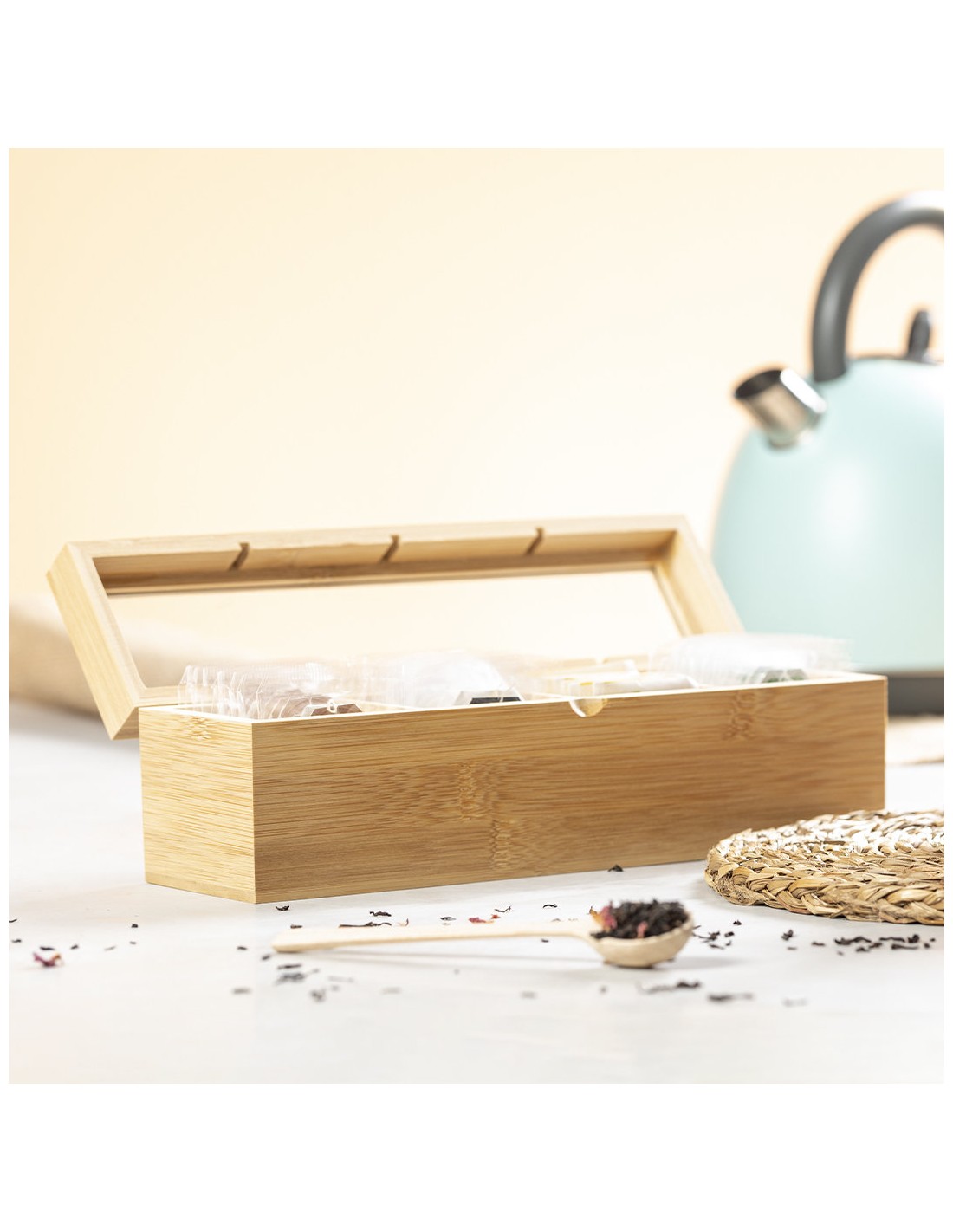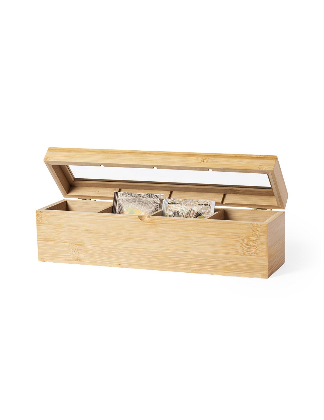 Caja para té de línea nature, fabricada en bambú, con cristal en tapa. Incluye 4 compartimentos para almacenar distintos tipos de té. Presentada en atractiva caja de diseño eco.