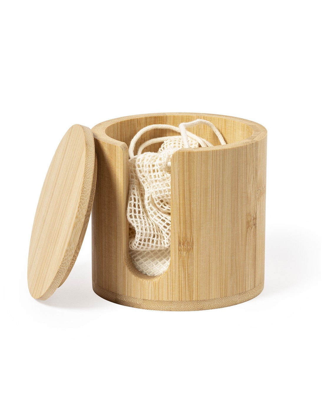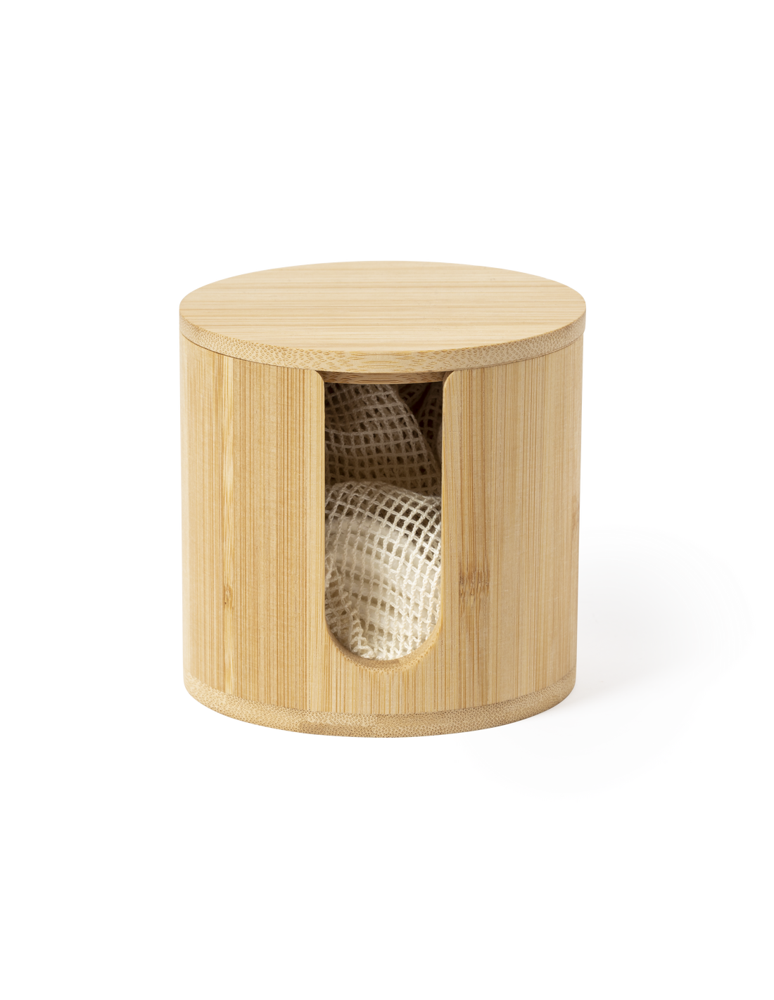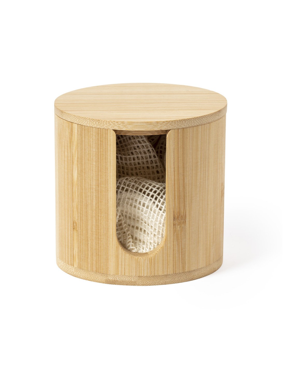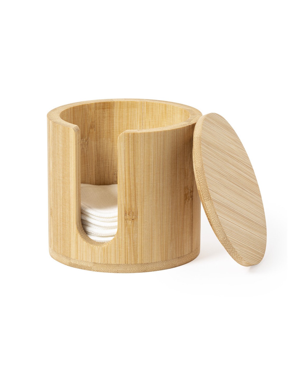 Dispensador de discos desmaquíllantes de línea nature, fabricado en bambú para así fomentar el uso de materias primas naturales. Incluye 10 discos de algodón reutilizables y bolsa de lavado. Presentado en caja individual de diseño eco.