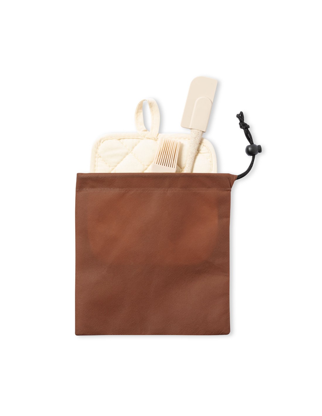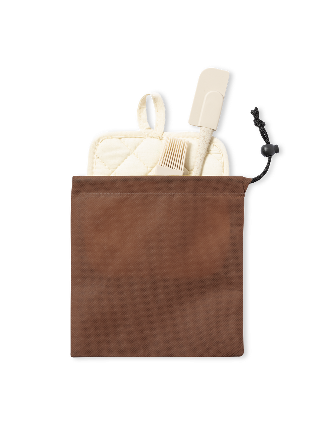 Set de cocina de 3 piezas presentado en funda marrón con cordón de cierre. Incluye: Espátula y brocha de silicona en tono natural, con mangos troquelados en resistente PP veteado. Agarrador en 100% algódón de acabado natural, con cinta para colgar.